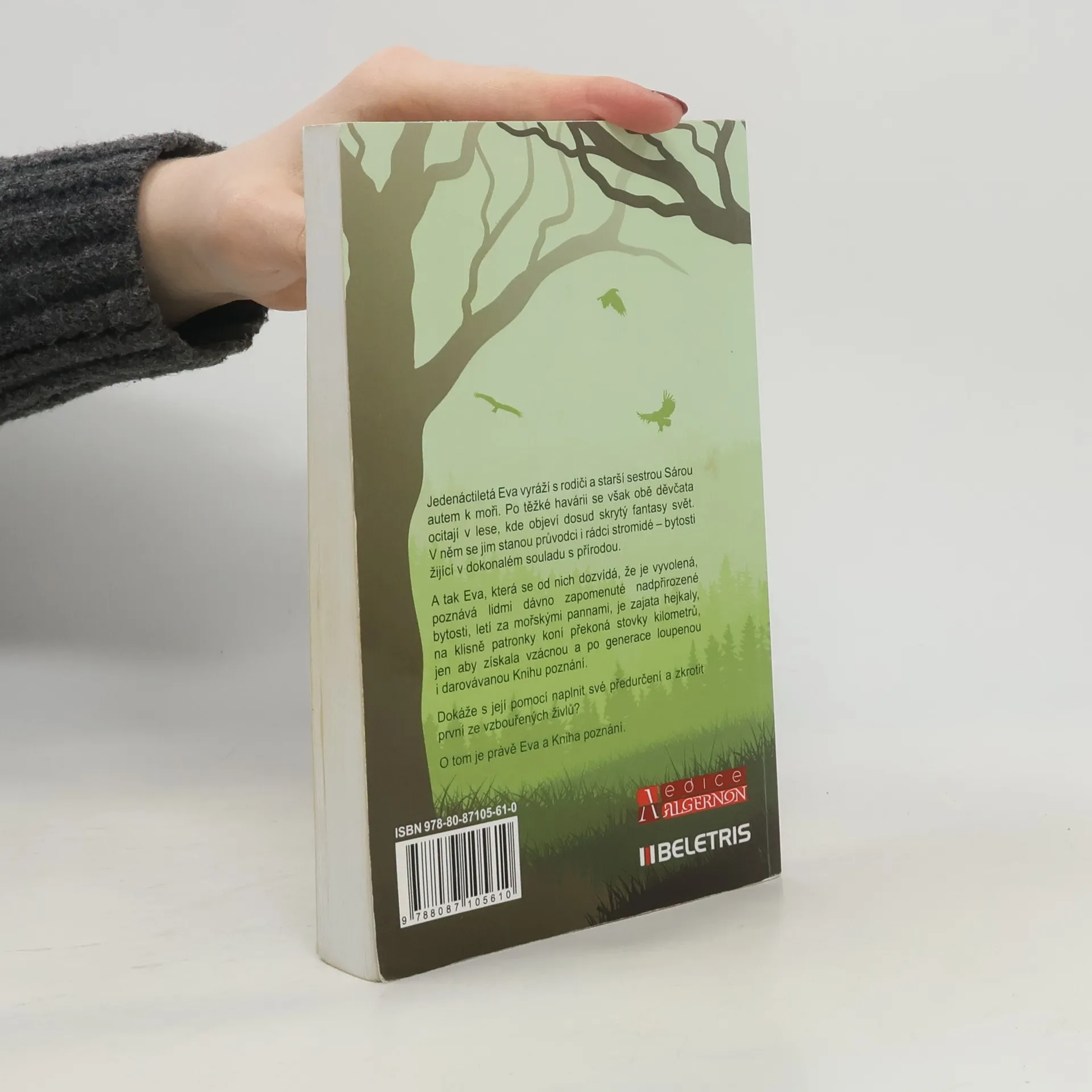 Jedenáctiletá Eva vyráží s rodiči a starší sestrou Sárou autem k moři. Po těžké havárii se však obě děvčata ocitají v lese, kde objeví dosud skrytý fantasy svět. V něm se jim stanou průvodci i rádci stromidé – bytosti žijící v dokonalém souladu s přírodou. A tak Eva, která se od nich dozvídá, že je vyvolená, poznává lidmi dávno zapomenuté nadpřirozené bytosti, letí za mořskými pannami, je zajata hejkaly, na klisně patronky koní překoná stovky kilometrů, jen aby získala vzácnou a po generace loupenou i darovávanou Knihu poznání. Dokáže s její pomocí naplnit své předurčení a zkrotit první ze vzbouřených živlů? O tom je právě Eva a Kniha poznání. První vydání. -- zdroj: www.legie.info --