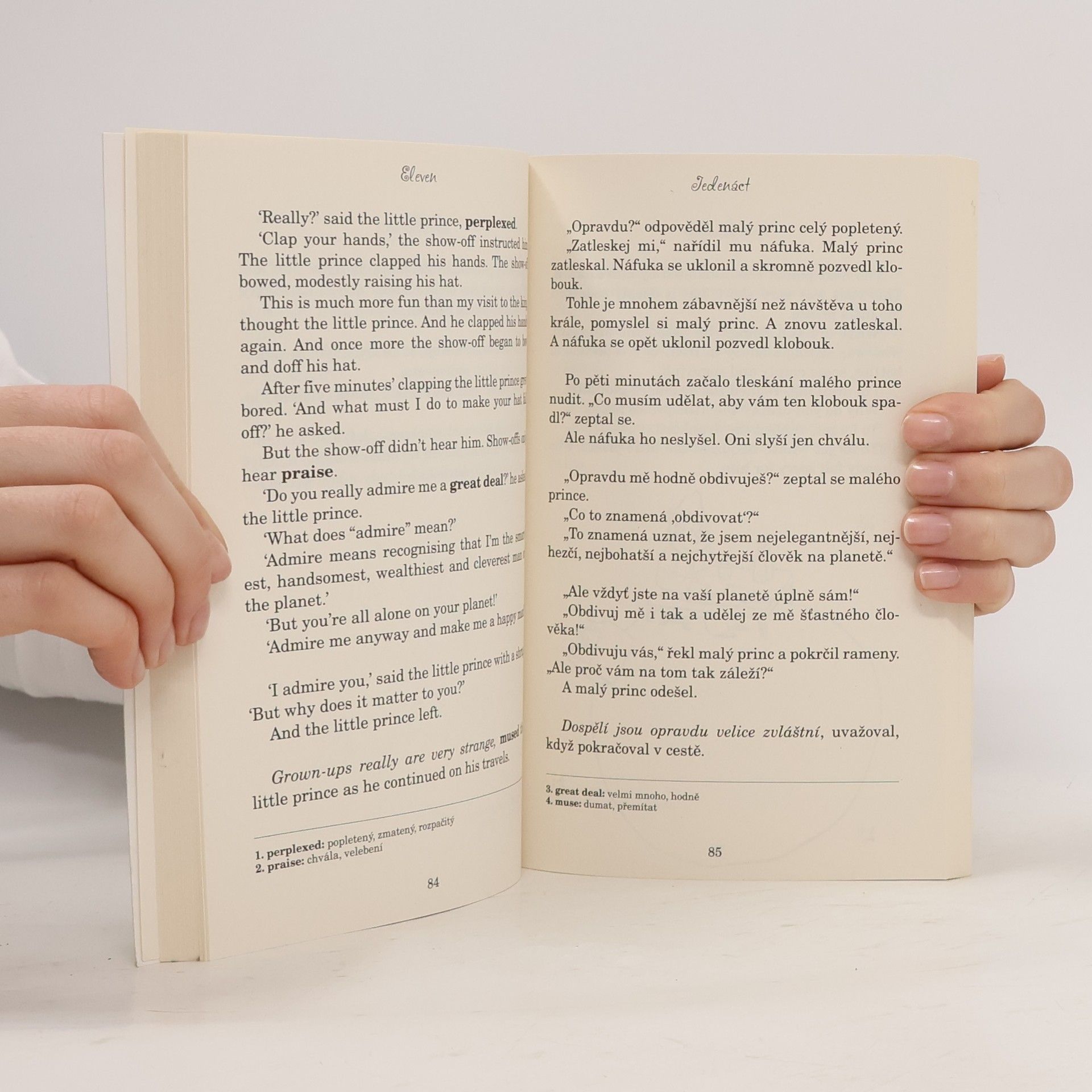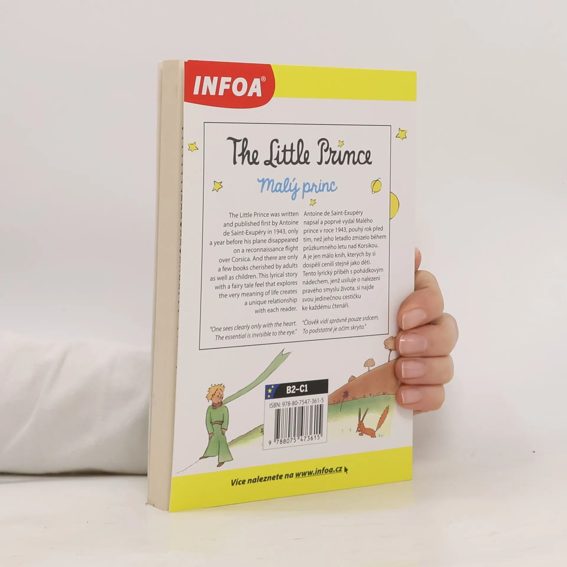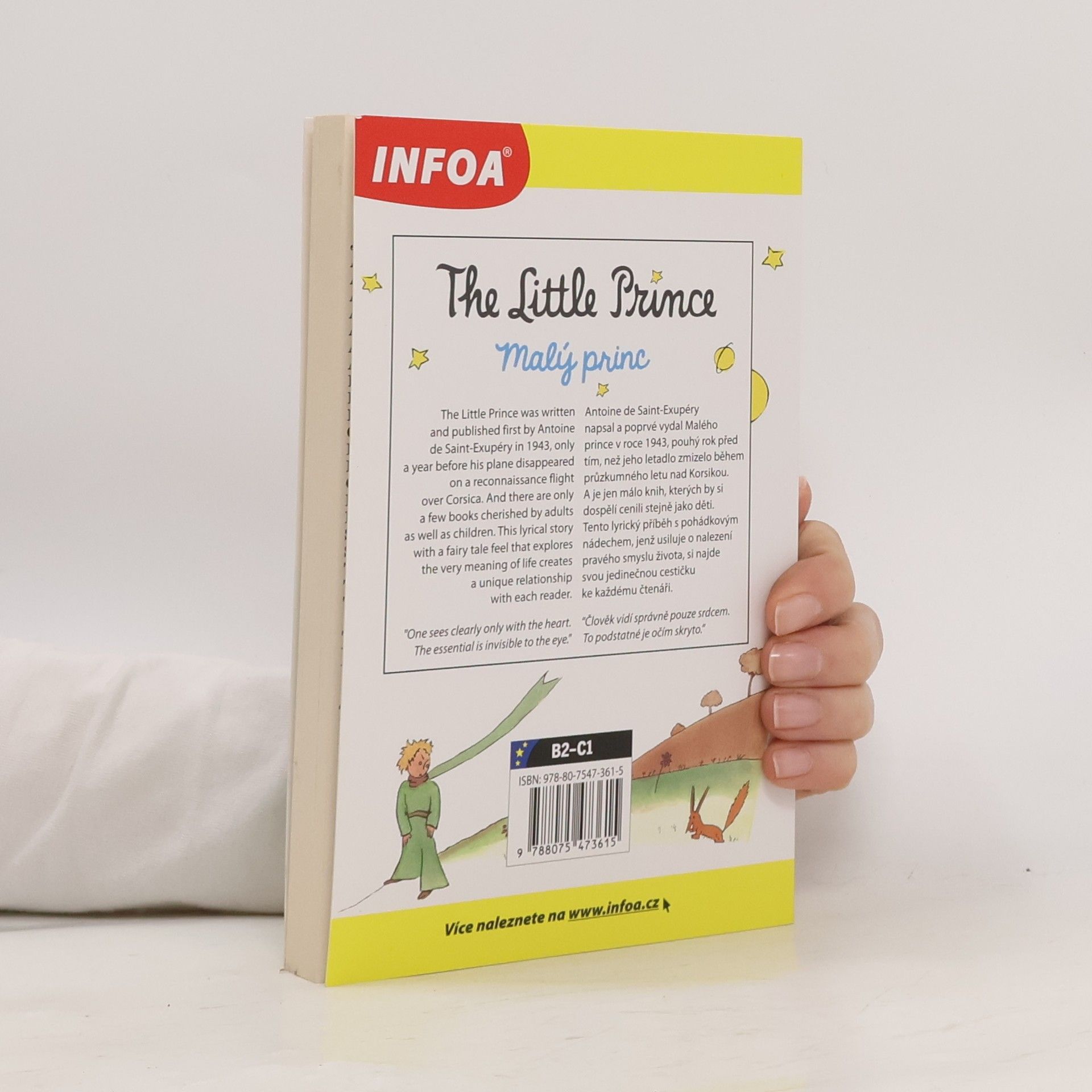 Dvojjazyčná kniha pro pokročilé. Anglicko-český zrcadlový text Jazyková úroveň B2-C1. Antoine de Saint-Exupéry napsal a poprvé vydal Malého prince v roce 1943, pouhý rok před tím, než jeho letadlo zmizelo během průzkumného letu nad Korsikou. A je jen málo knih, kterých by si dospělí cenili stejně jako děti. Tento lyrický příběh s pohádkovým nádechem, jenž usiluje o nalezení pravého smyslu života, si najde svou jedinečnou cestičku ke každému čtenáři.