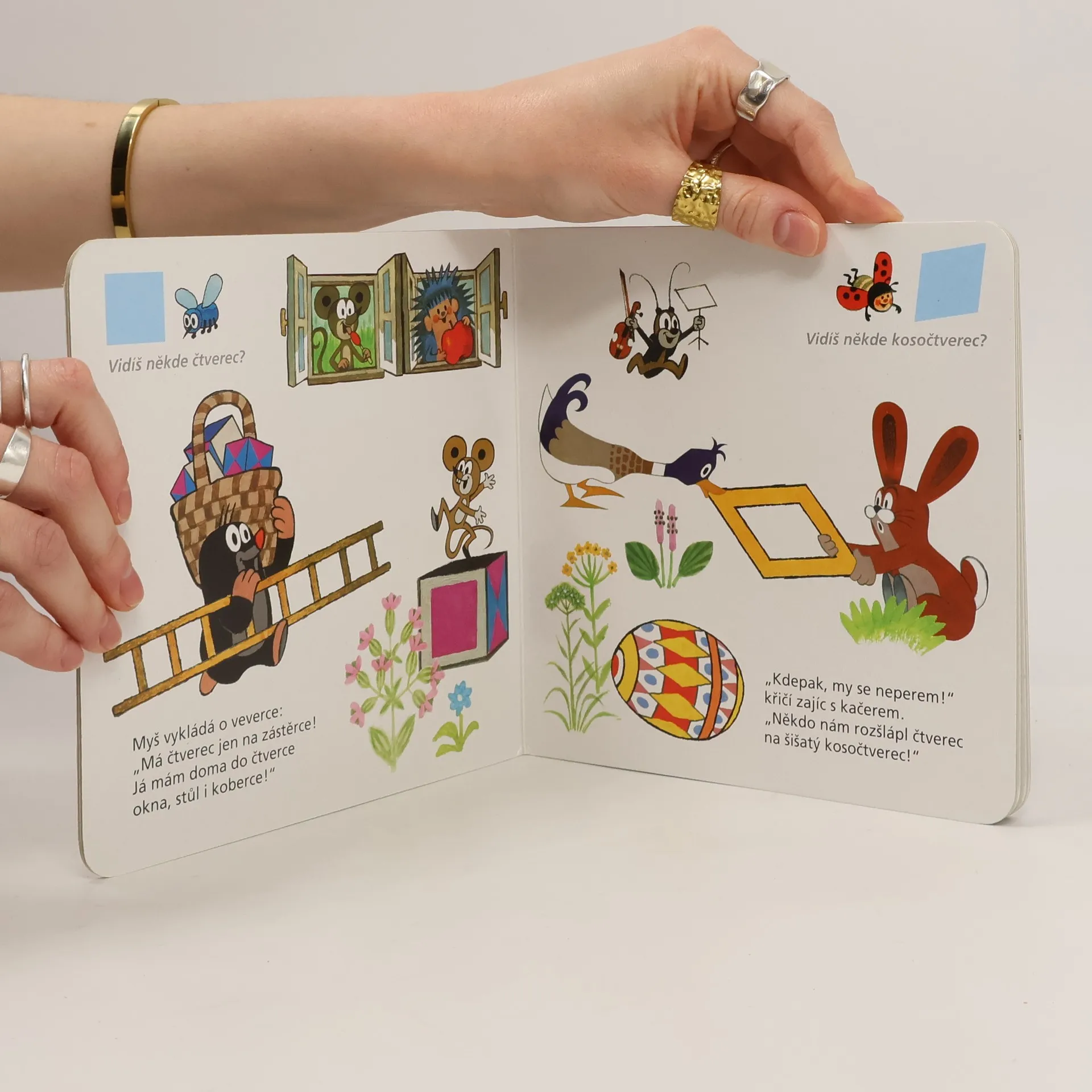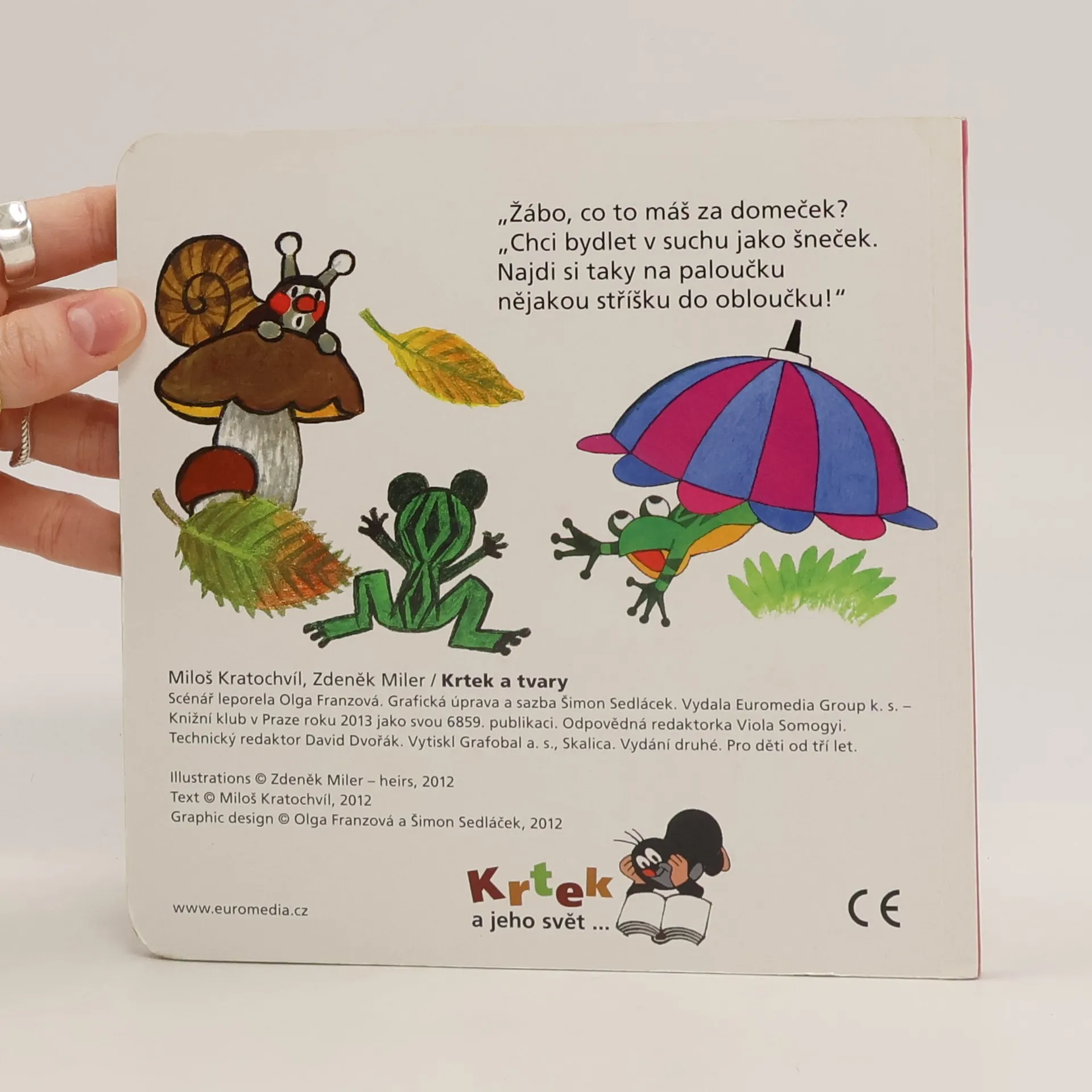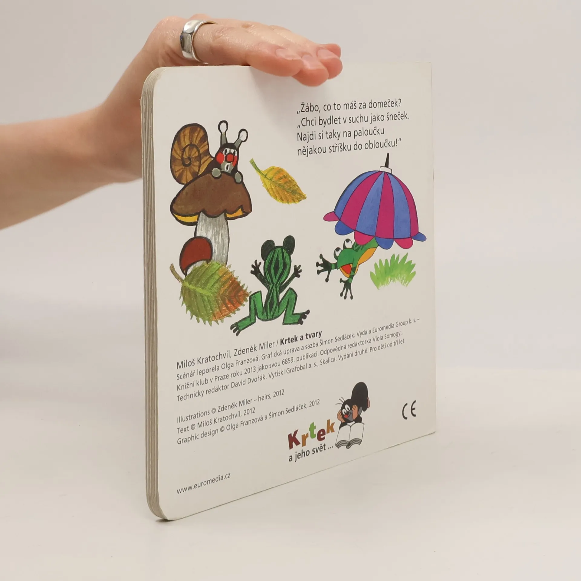 Devátý z řady příběhů pro nejmenší čtenáře o tom, co všechno umí neposedný krteček a jeho zvířecí kamarádi, se věnuje poznávání základních tvarů ve světě kolem nás. Krtek a jeho kamarádi děti tentokrát naučí, jak poznat čtverec, spirálu, kruh či kapku. Doplněno návodnými otázkami.
