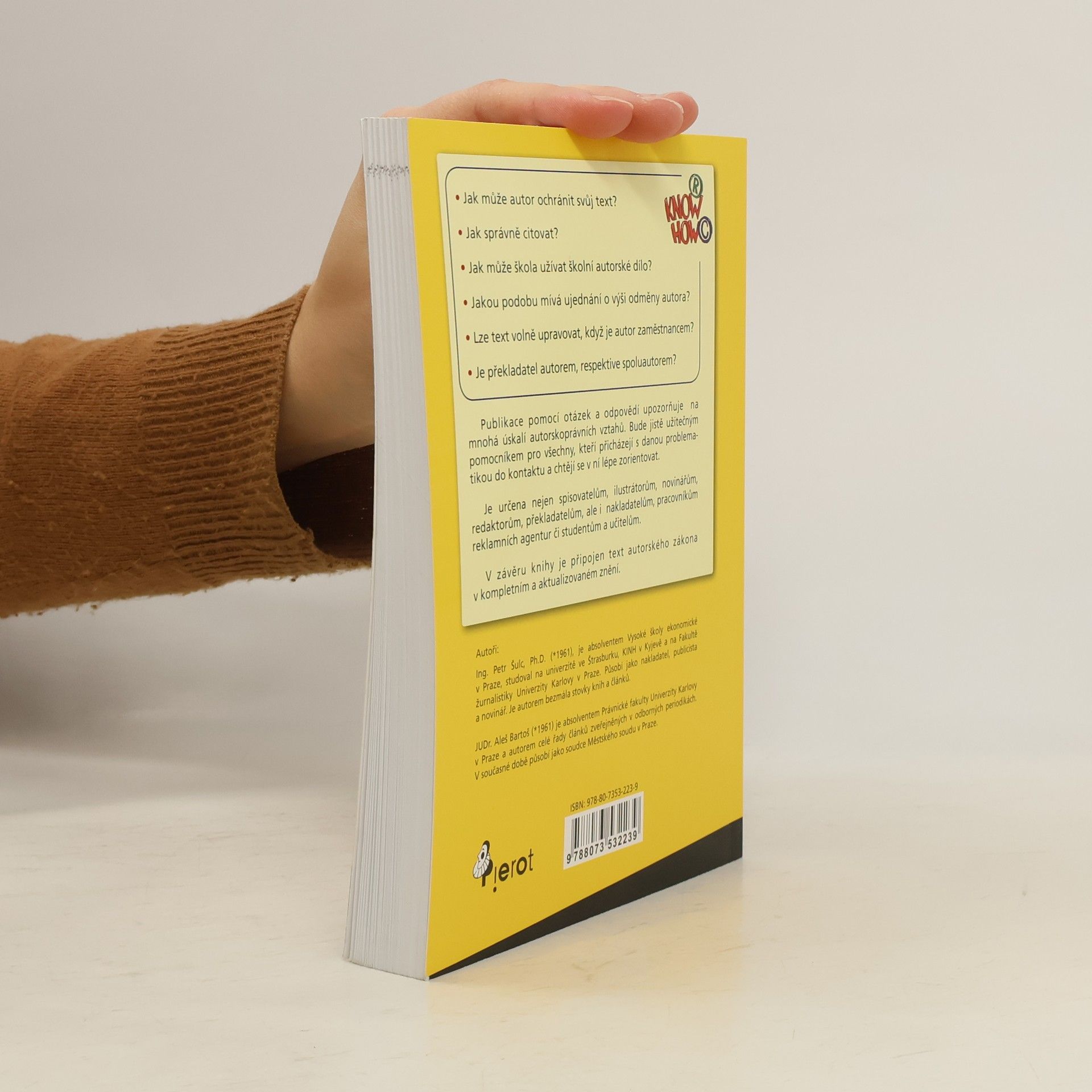 Publikace pomocí otázek a odpovědí upozorňuje na mnohá úskalí autorskoprávních vztahů. Bude jistě užitečným pomocníkem pro všechny, kteří přicházejí s danou problematikou do kontaktu a chtějí se v ní lépe zorientovat. V závěru knihy je připojen text autorského zákona v kompletním a aktualizovaném znění.
