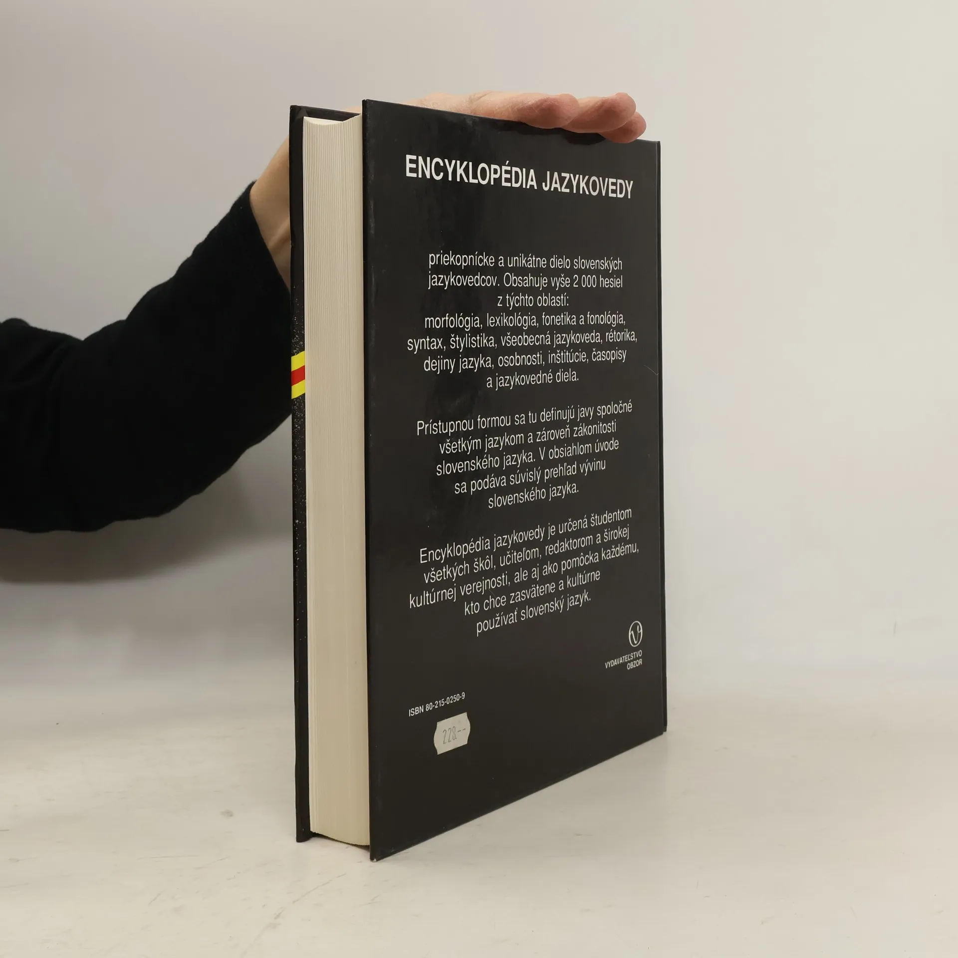 Priekopnícke a unikátne dielo slovenských jazykovedcov. Obsahuje vyše 2000 hesiel z týchto oblastí: morfológia, lexikológia, fonetika a fonológia, syntax, štylistika, všeobecná jazykoveda, rétorika, dejiny jazyka, osobnosti, inštitúcie, čaopisy a jazykovedné diela. Prístupnou formou sa tu definujú javy spoločné všetkým jazykom a zároveň zákonitosti slovenského jazyka. V obsiahlom úvode sa podáva súvislý prehľad vývinu slovenského jazyka. Encyklopédia jazykovedy je určená študentom všetkých škôl, učiteľom, redaktorom a širokej kultúrnej verejnosti, ale aj ako pomôcka každému, kto chce zasvätene a kultúrne používať slovenský jazyk.