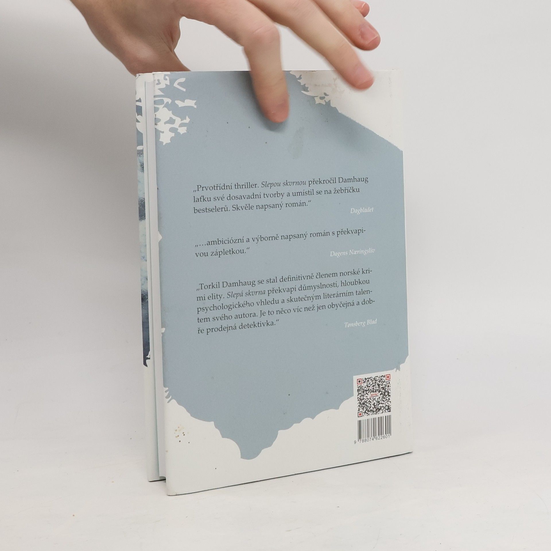 Psychologický thriller o krutosti a temnotách lidské duše. Září 1996. Jo, dospívající dvanáctiletý chlapec, tráví se svou rodinou prázdniny na Krétě. Slunce, moře, krásné dívky. Mohlo by to vypadat jako splněný sen. Ale Jo to takto nevnímá. Je znechucený matkou a jejím přítelem, kteří tráví veškerý čas popíjením, zatímco Jo se musí starat o své malé sourozence. Jediný, s kým si Jo rozumí a kdo mu dokonce pomáhá ve snaze získat vysněnou dívku, je muž, který si nechává říkat Sako. Jednoho dne Jo překvapí svůj objekt lásky v objetí s někým jiným a vzteky umučí kočku, jejíž mrtvé tělo zavěsí dívce na dveře. Prosinec 2008, Oslo. Mladá psychoterapeutka Mailin náhle zmizí. Její mladší sestra Liss se vrací z Amsterodamu, kde se protloukala jako modelka, a snaží se vypátrat, co se s její sestrou stalo. Naděje zmizí ve chvíli, kdy je nalezeno zohavené tělo její sestry. Jaké je spojení mezi prázdninami na Krétě, chlapcem Joem, tajuplným mužem jménem Sako a rokem 2008, Liss a Mailin? Proč musela Mailin zemřít? Jaká je pravá tvář psychopata, který neváhá svoje oběti nejdříve oslepit? Slepá skvrna je román plný krutosti a zároveň precizní psychologickou studií temnoty lidské duše. Damhaug nejenže čtenáře nenechá vydechnout, ale umí i přesvědčit, že jeho spletitý příběh by mohl být pravdivý a že by se mohl odehrát kdekoli na světě.
