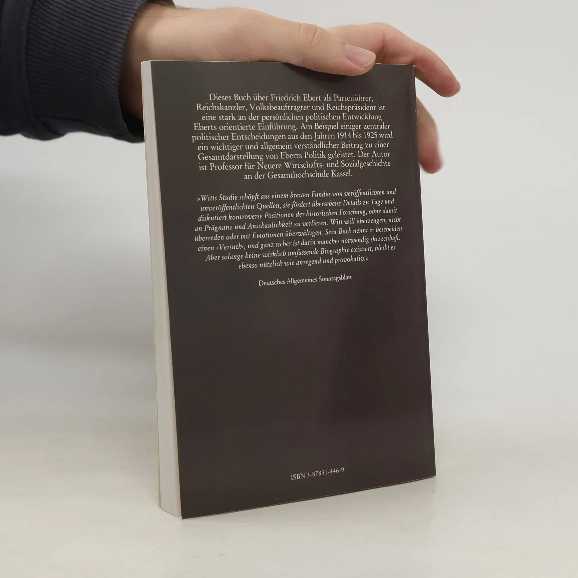 Dieses Buch über Friedrich Ebert als Parteiführer, Reichskanzler, Volksbeauftragter und Reichspräsident ist eine stark an der persönlichen politischen Entwicklung Eberts orientierte Einführung. Am Beispiel einiger zentraler politischer Entscheidungen aus den Jahren 1914 bis 1925 wird ein wichtiger und allgemein verständlicher Beitrag zu einer Gesamtdarstellung von Eberts Politik geleistet.