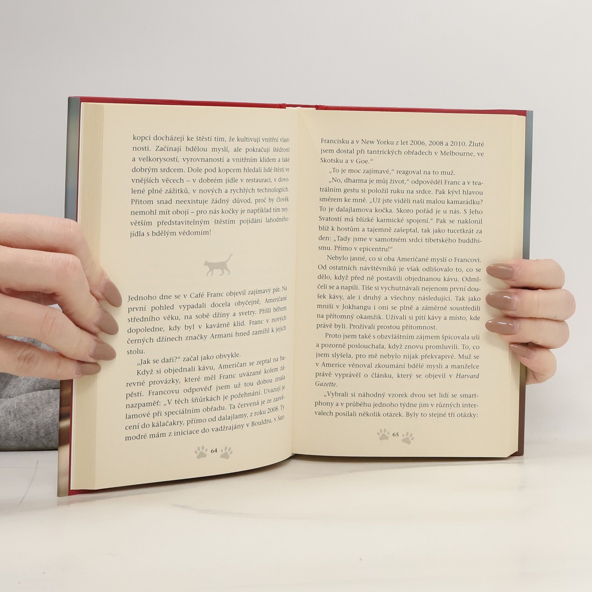Maličkého kotěte, kterému hrozí nešťastný osud, se ujme samotný dalajlama. Kočička líčí svůj každodenní život v jeho těsné blízkosti. Stává se svědkem rozhovorů mezi dalajlamou a jeho hosty. Postupně poznává, v čem spočívá štěstí, a jak ho na cestě životem najít, což není pro žádnou živou bytost snadné. V laskavém příběhu často nechybějí humorné situace, kočka se tře o nohy hollywoodských hvězd a dělí se s námi o poznání, které získává v klášteře buddhistických mnichů. „Chci, aby i díky této knize lidé dospěli k tomu, že nejdůležitější je láska v různých podobách. Šťastní jste, když se staráte o druhé a dáváte jim lásku. To je jedna z nejúčinnějších cest ke štěstí,“ říká o Dalajlámově kočce její autor David Michie.