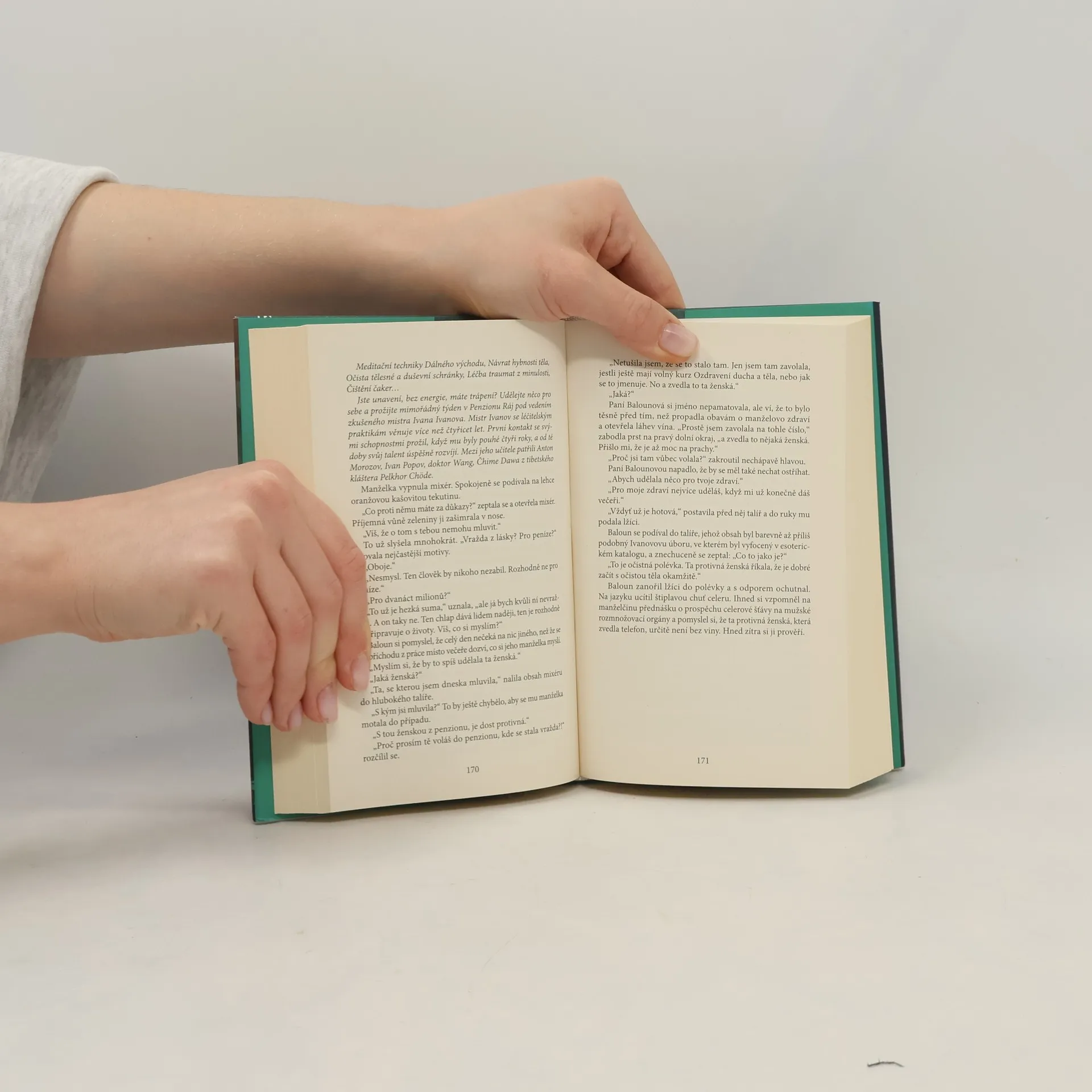 Spisovatelka Monika Hrubešová má pocit, že na ni padá celý svět. Vše jí přerůstá přes hlavu a ona si potřebuje odpočinout od starostí, mužů, publicity a především se musí vyrovnat s minulostí. Proto odjíždí do tichého penzionu kousek za Prahu, kde věhlasný ruský léčitel pořádá vyhlášené ozdravné kurzy. Skupinka kurzistů je sice zvláštní, stejně jako léčitel, ale i tak to vypadá na vydařený týden, tedy až do té doby, než se v sauně najde mrtvé tělo. Na první pohled se zdá, že jde o přirozenou smrt, ale brzy se ukáže, že jen někdo dobře maskoval stopy. Namísto relaxace a příjemných meditací tak na Moniku Hrubešovou čeká policejní vyšetřování a známá dvojice pražských kriminalistů, kapitán Baloun a nadporučík Jedlička.