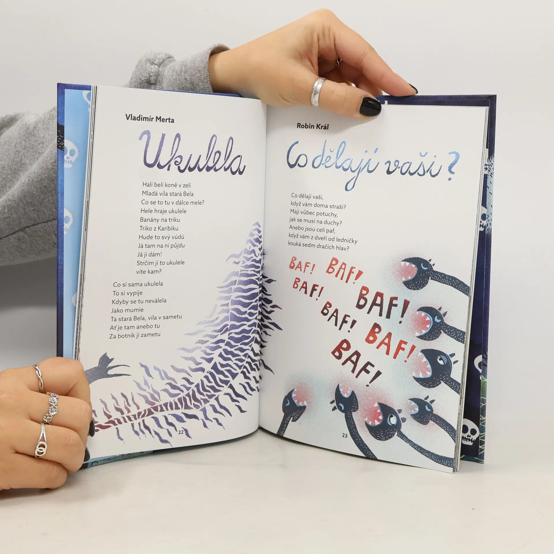 Jedinečná antologie veršů pro děti obsahuje původní, dosud nevydané strašidelné básně od našich předních básníků a písničkářů. „Strašidelné verše pro statečné děti“, jak zní podtitul knížky, potěší děti i dospělé, protože každý má své tajné „strachy“ a obavy, a každý si připomene, čeho se bojí či čeho se bál. Petr Borkovec, Jaroslav Hutka, Radek Malý, Ewald Murrer, Jana Štroblová a půl tuctu dalších – ti všichni překvapí originálními verši na téma strach a strašení.