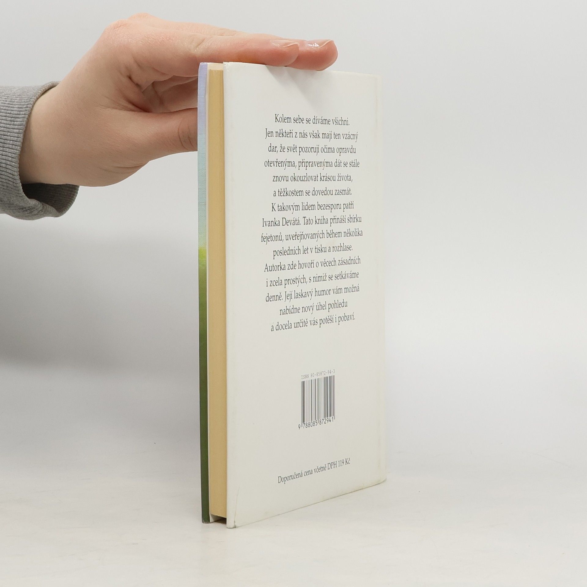 Kolem sebe se díváme všichni. Jen někteří z nás však mají ten vzácný dar, že svět pozorují očima opravdu otevřenýma, připravenýma dát se stále znovu okouzlovat krásou života, a těžkostem se dovedou zasmát. K takovým lidem bezesporu patří Ivanka Devátá. Tato kniha přináší sbírku fejetonů, uveřejňovaných během několika posledních let v tisku a rozhlase. Autorka zde hovoří o věcech zásadních i zcela prostých, s nimiž se setkáváme denně. Její laskavý humor vám možná nabídne nový úhel pohledu a docela určitě vás potěší i pobaví.