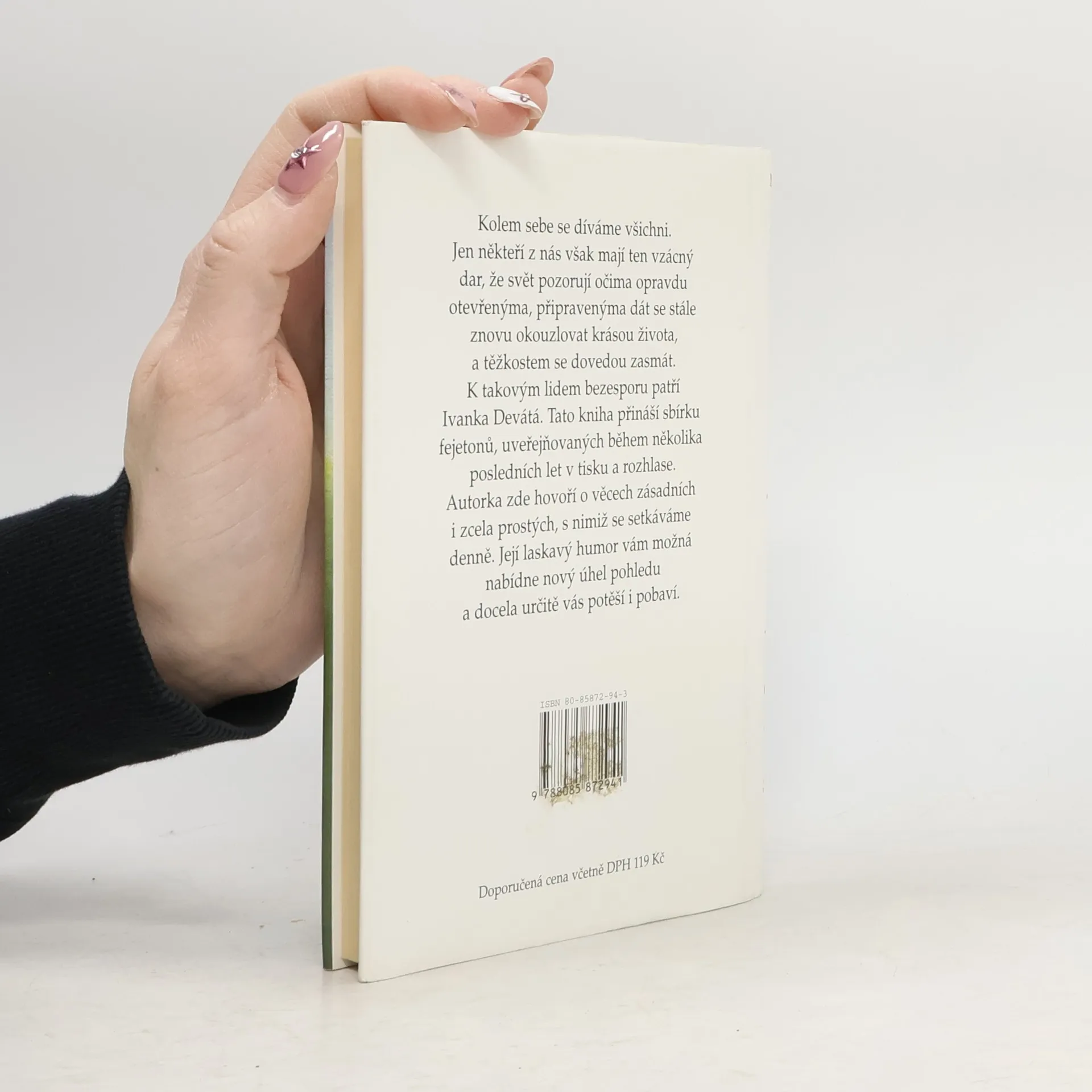 Kolem sebe se díváme všichni. Jen někteří z nás však mají ten vzácný dar, že svět pozorují očima opravdu otevřenýma, připravenýma dát se stále znovu okouzlovat krásou života, a těžkostem se dovedou zasmát. K takovým lidem bezesporu patří Ivanka Devátá. Tato kniha přináší sbírku fejetonů, uveřejňovaných během několika posledních let v tisku a rozhlase. Autorka zde hovoří o věcech zásadních i zcela prostých, s nimiž se setkáváme denně. Její laskavý humor vám možná nabídne nový úhel pohledu a docela určitě vás potěší i pobaví.