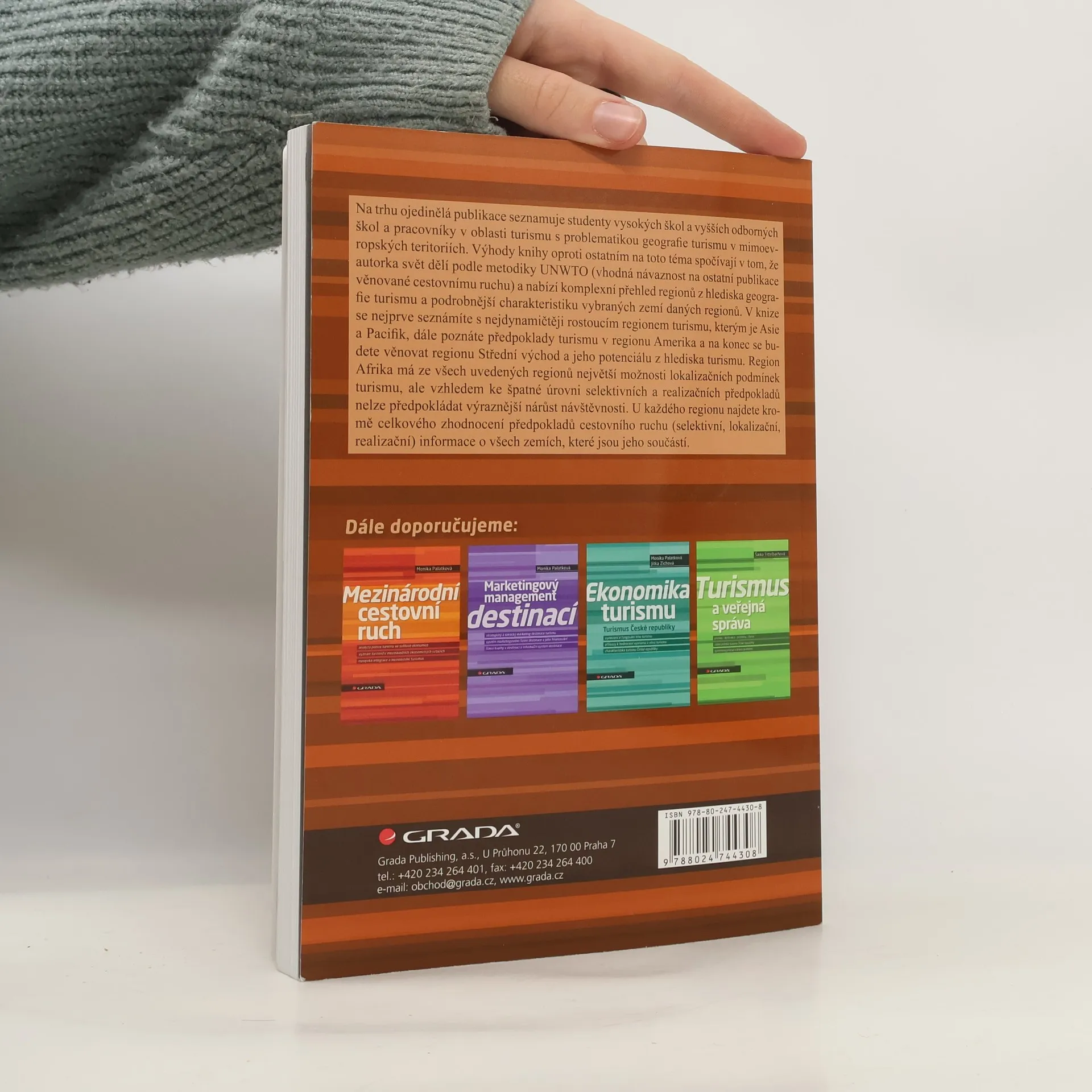 Na trhu ojedinělá publikace seznamuje studenty vysokých škol a vyšších odborných škol a pracovníky v oblasti turismu s problematikou geografie turismu v mimoevropských teritoriích. Výhody knihy oproti ostatním na toto téma spočívají v tom, že autorka svět dělí podle metodiky UNWTO (vhodná návaznost na ostatní publikace věnované cestovnímu ruchu) a nabízí komplexní přehled regionů z hlediska geografie turismu a podrobnější charakteristiku vybraných zemí daných regionů. V knize se nejprve seznámíte s nejdynamičtěji rostoucím regionem turismu, kterým je Asie a Pacifik, dále poznáte předpoklady turismu v regionu Amerika a na konec se budete věnovat regionu Středního východu a jeho potenciálu z hlediska turismu. Region Afrika má ze všech uvedených regionů největší možnosti lokalizačních podmínek turismu, ale vzhledem ke špatné úrovni selektivních a realizačních předpokladů nelze předpokládat výraznější nárůst návštěvnosti. U každého regionu najdete kromě celkového zhodnocení předpokladů cestovního ruchu (selektivní, lokalizační, realizační) informace o všech zemích, které jsou jeho součástí. Knihu odborně recenzoval Doc. RNDr. Václav Kašpar, CSc. obsah kapitol volně k dispozici na: http://www.obalkyknih.cz/file/toc/65613/pdf