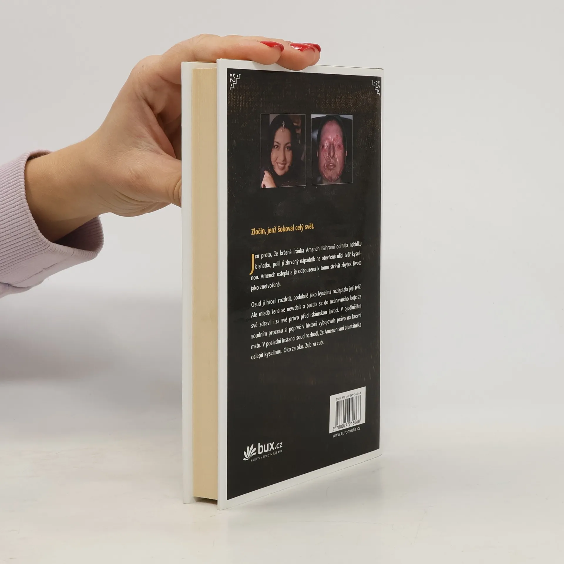 Zločin, který šokoval celý svět. Jen proto, že krásná Íránka Ameneh Bahramí odmítla nabídku k sňatku, polil jí odmítnutý nápadník na otevřené ulici tvář kyselinou. Ameneh oslepla a je odsouzena k tomu, aby zbytek života strávila jako znetvořená. Osud ji hrozil rozdrtit, podobně jako kyselina rozleptala její tvář. Ale mladá žena se vrhla do neúnavného boje za své zdraví i za své právo před islámskou justicí. V ojedinělém soudním procesu si poprvé v historii vybojovala právo na krevní mstu. V poslední instanci soud rozhodl, že Ameneh smí atentátníka oslepit kyselinou. A rozsudek má být vykonán co nejdřív. Oko za oko. Zub za zub.