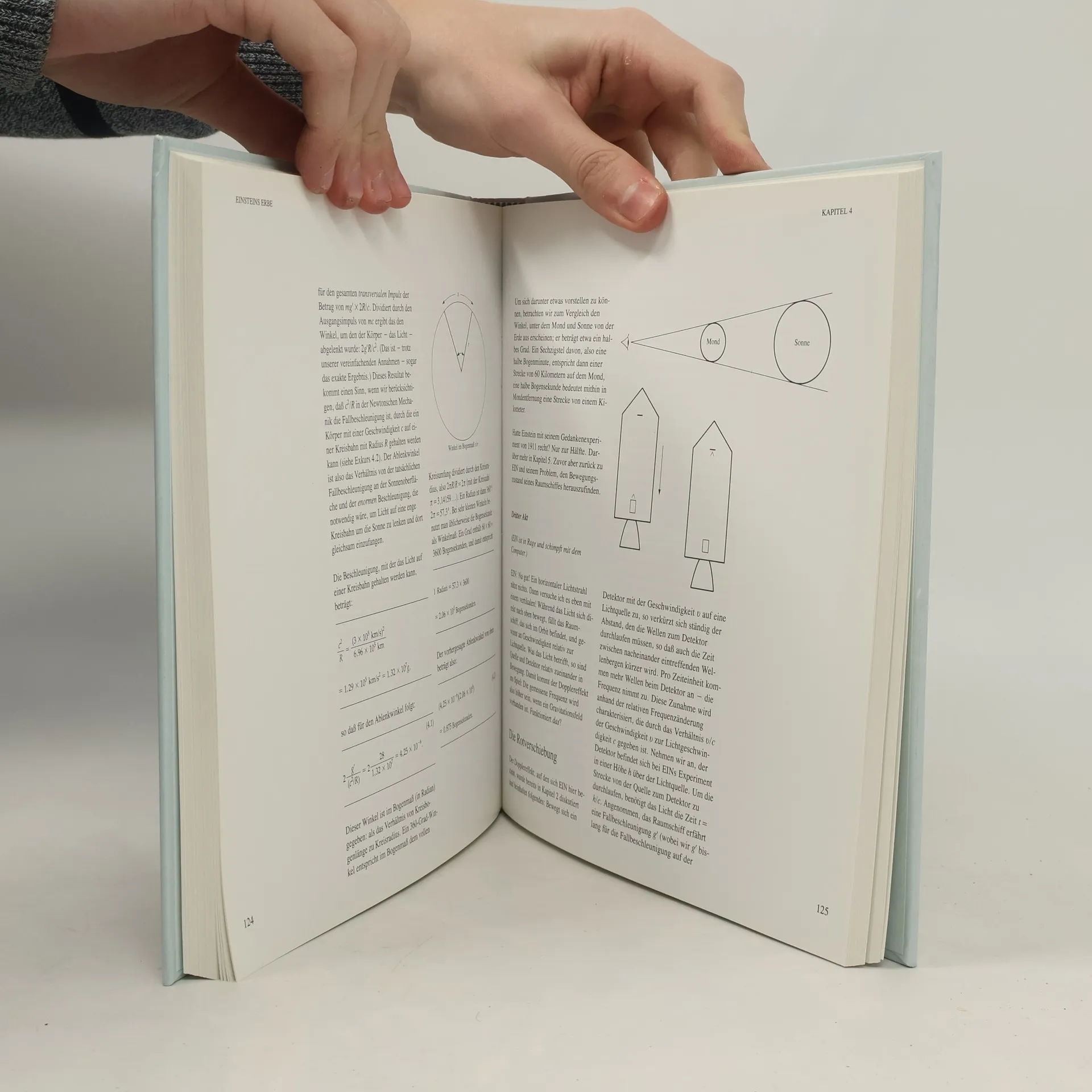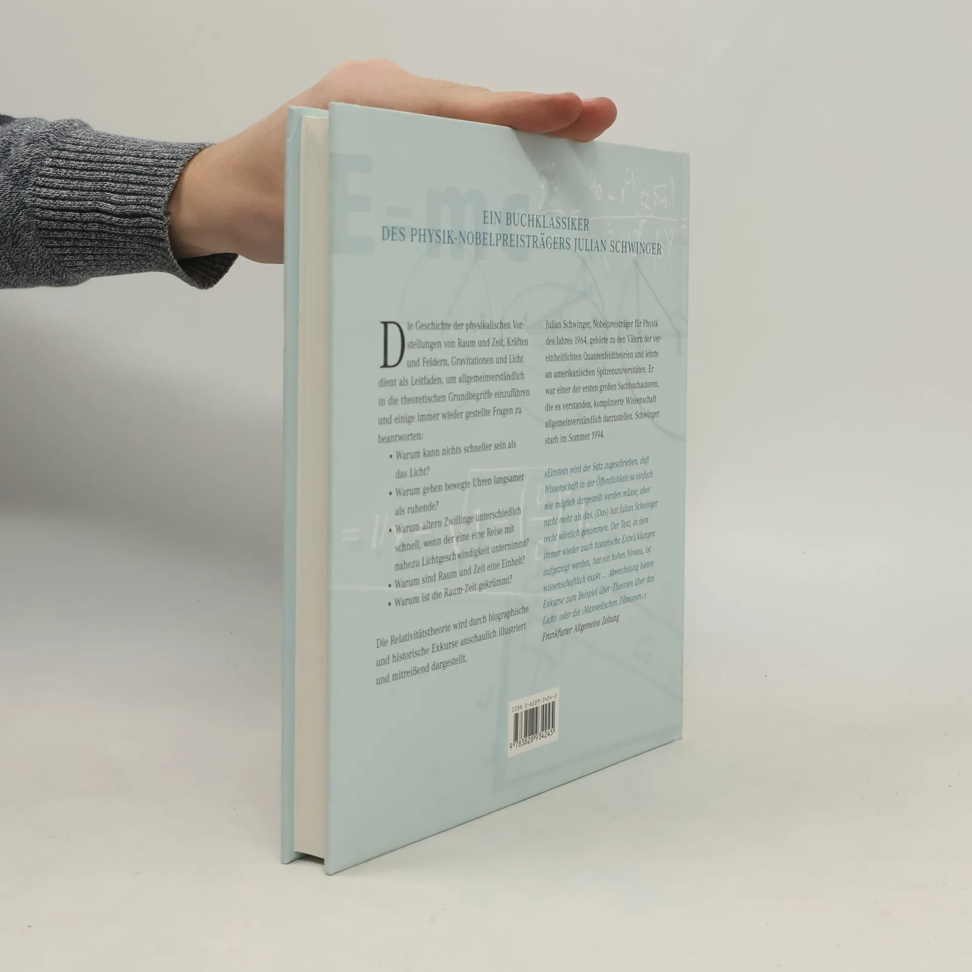 Die Geschichte der physikalischen Vorstellungen von Raum und Zeit, Kraften und Feldern, Gravitationen und Licht dient Schwinger als Leitfaden, um allgemeinverstandlich in die theoretischen Grundbegriffe einzufuhren und einige immer wieder gestellte Fragen zu beantworten: Warum kann nichts schneller sein als Licht? Warum gehen bewegte Uhren langsamer als ruhende? Warum altern Zwillinge unterschiedlich schnell, wenn der eine eine Reise mit nahezu Lichtgeschwindigkeit unternimmt? Warum sind Raum und Zeit eine Einheit? Und warum ist die Raum-Zeit gekrummt? Die Antworten muten in Schwingers Darstellung nicht mehr so bizarr an. Die Krummung der Raum-Zeit zum Beispiel kann man sich an Dreiecken in der Ebene und auf der Kugeloberflache anschaulich klarmachen. Der Pythagorassatz fur rechtwinklige Dreiecke hat in der Tat bei Einstein eine wichtige Rolle gespielt, um Raum und Zeit anhand einer absoluten Grosse einheitlich zu beschreiben. Indem Schwinger methodische Uberlegungen immer wieder durch biographische und historische Exkurse lebensnah illustriert, gelingt es ihm, die Relativitatstheorie in einem mitreissenden Erzahlton darzustellen, 'so einfach wie moglich, aber nicht mehr als das.' "