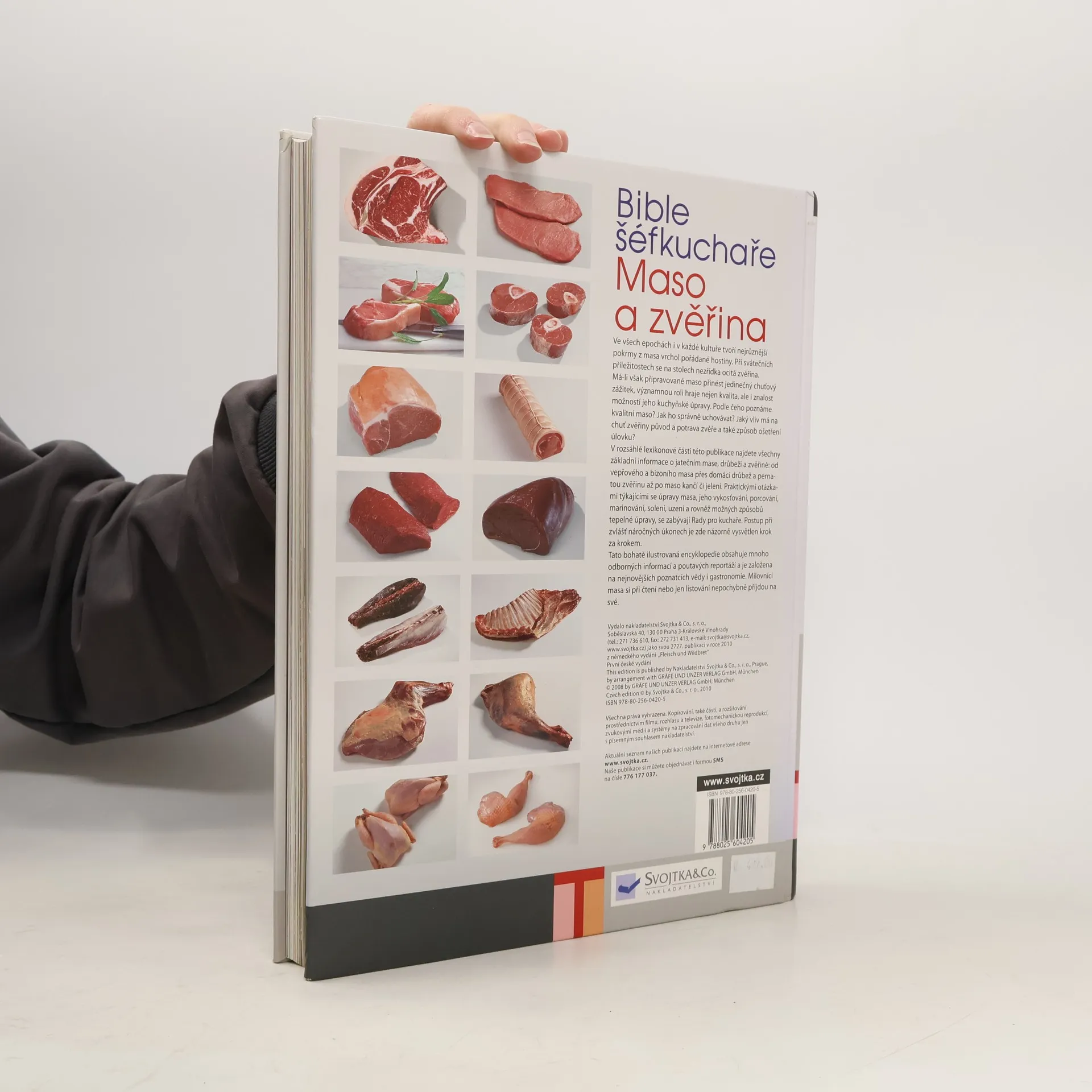 Podle čeho poznáme kvalitní maso? Jak ho správně uchovávat? Jaký vliv má na chuť zvěřiny původ a potrava zvěře a také způsob ošetření úlovku? V rozsáhlé lexikonové části této publikace najdete všechny základní informace o jatečném dobytku, drůbeži a zvěřině: od vepřového a hovězího masa přes domácí drůbež a pernatou zvěřinu až po maso kančí či jelení. Rady pro kuchaře obsahují praktické postupy při úpravě masa, jeho vykosťování, porcování, marinování, solení, uzení a rovněž možné způsoby tepelné úpravy. Postup při zvlášť náročných úkonech je zde názorně vysvětlen krok za krokem. Tato bohatě ilustrovaná encyklopedie obsahuje mnoho odborných informací a poutavých reportáží a je založena na nejnovějších poznatcích vědy i gastronomie. Milovníci masa si při čtení nebo jen listování v knize nepochybně přijdou na své.
