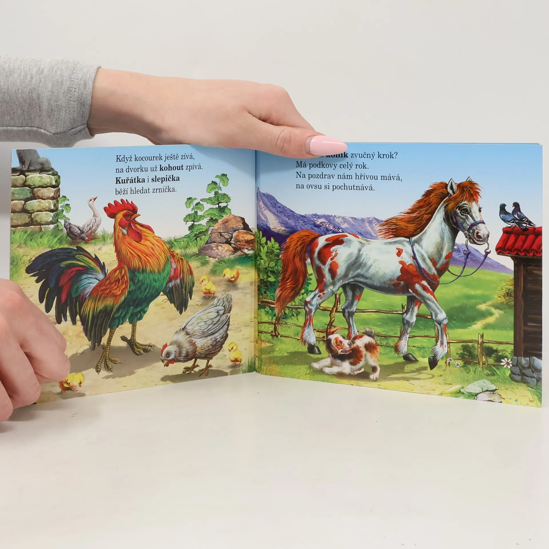 Proč má koník zvučný krok? Má podkovy celý rok. Veselé rozkládací leporelo seznámí nejmenší děti se životem na dvorku.