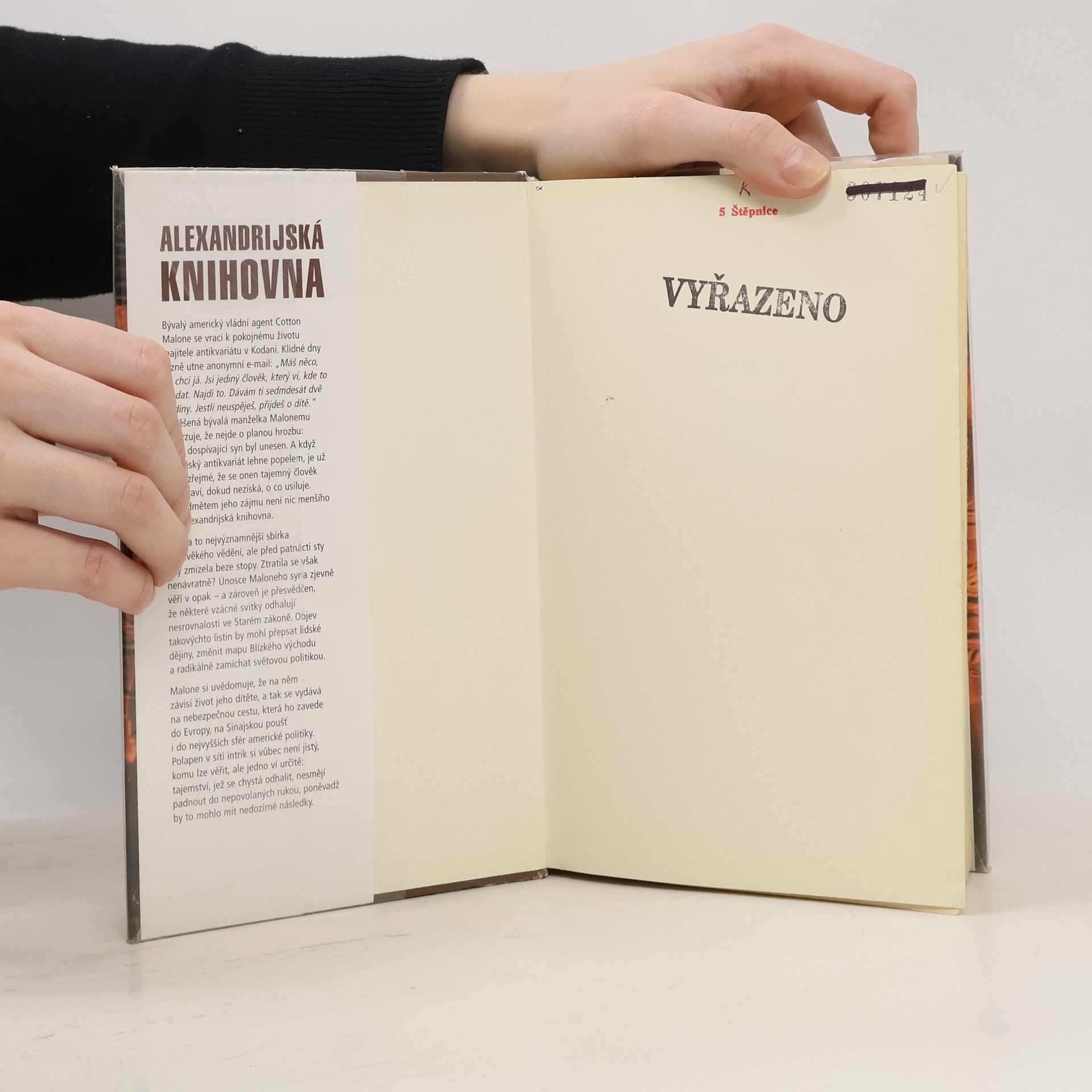 Bývalý americký vládní agent Cotton Malone se po vyřešení případu templářského dědictví vrací k pokojnému životu majitele antikvariátu v Kodani. Klidné dny rázně utne anonymní e-mail: "Máš něco, co chci já. Jsi jediný člověk, který ví, kde to hledat. Najdi to. Dávám ti sedmdesát dvě hodiny. Jestli neuspěješ, přijdeš o dítě." Vyděšená bývalá manželka Malonemu potvrzuje, že nejde o planou hrozbu: jejich dospívající syn byl unesen. A když kodaňský antikvariát lehne popelem, je už zcela zřejmé, že se onen tajemný člověk nezastaví, dokud nezíská, o co usiluje. A předmětem jeho zájmu není nic menšího než Alexandrijská knihovna. Malone si uvědomuje, že na něm závisí život jeho dítěte, a tak se vydává na nebezpečnou cestu, která ho zavede do Evropy, na Sinajskou poušť i do nejvyšších sfér americké politiky. Polapen v síti intrik si vůbec není jistý, komu lze věřit, ale jedno ví určitě: tajemství svitků z Alexandrijské knihovny, jež se chystá odhalit, nesmějí padnout do nepovolaných rukou, poněvadž by to mohlo mít nedozírné následky.