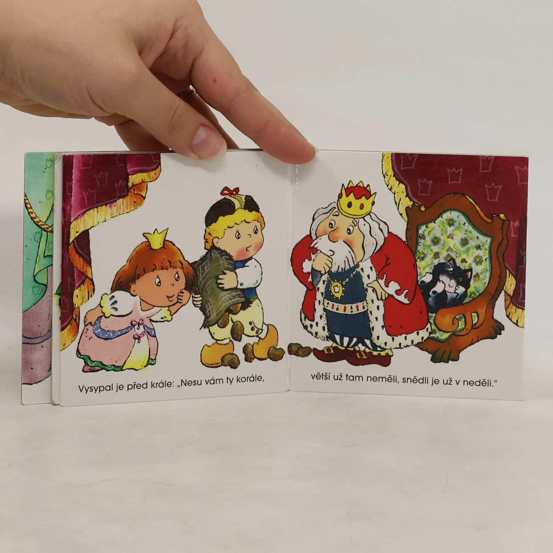 Roztomilé Hrubínovy verše o princezničce na bále, co poztrácela korále, ožívají v nově ilustrovaném rozkládacím leporelu, jehož barevné obrázky namaloval Adolf Dudek.