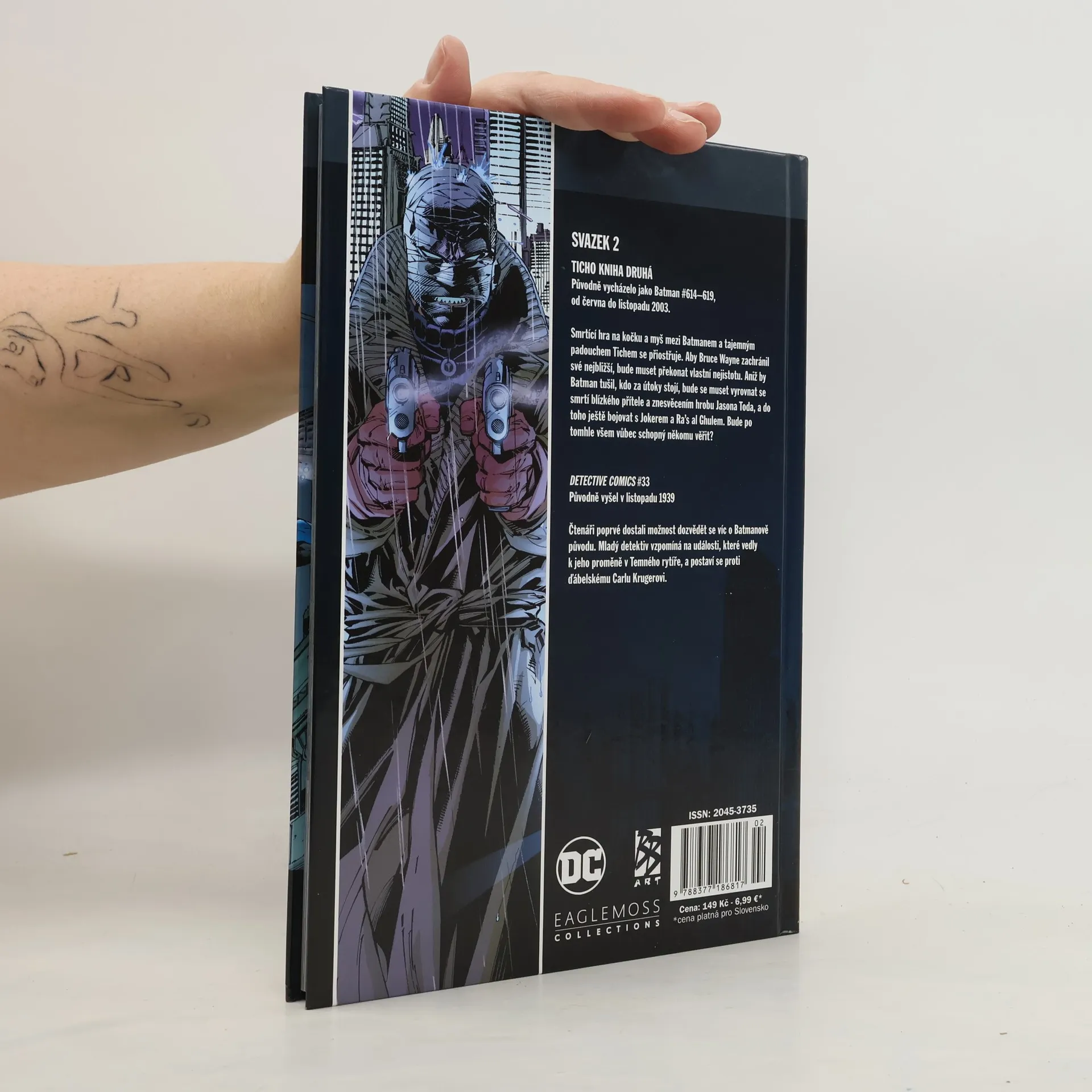 V druhém díle komiksu Batman: Ticho se Temný rytíř utkává se spoustou známých padouchů, včetně Scarecrowa, Ra's al Ghula, Two-Face, Riddlera... a dokonce i samotného Jokera. A postupně se Batman dostává blíž a blíž k tajemnému muži v obvazech, který se všemi manipuluje. Jenže dostat se k němu blízko a porazit ho, to jsou dvě zcela odlišné věci.