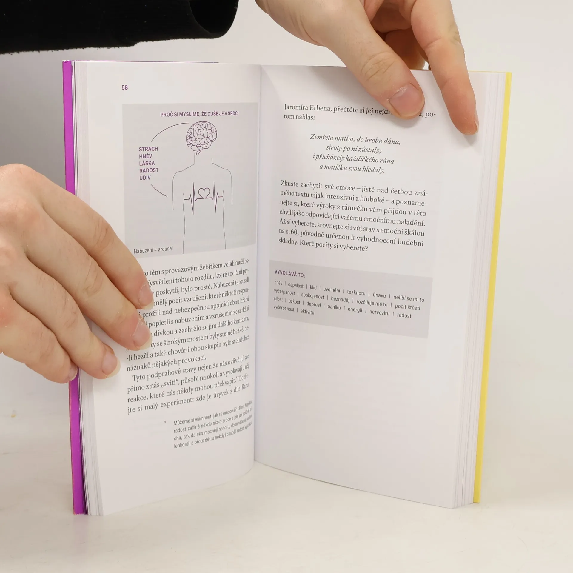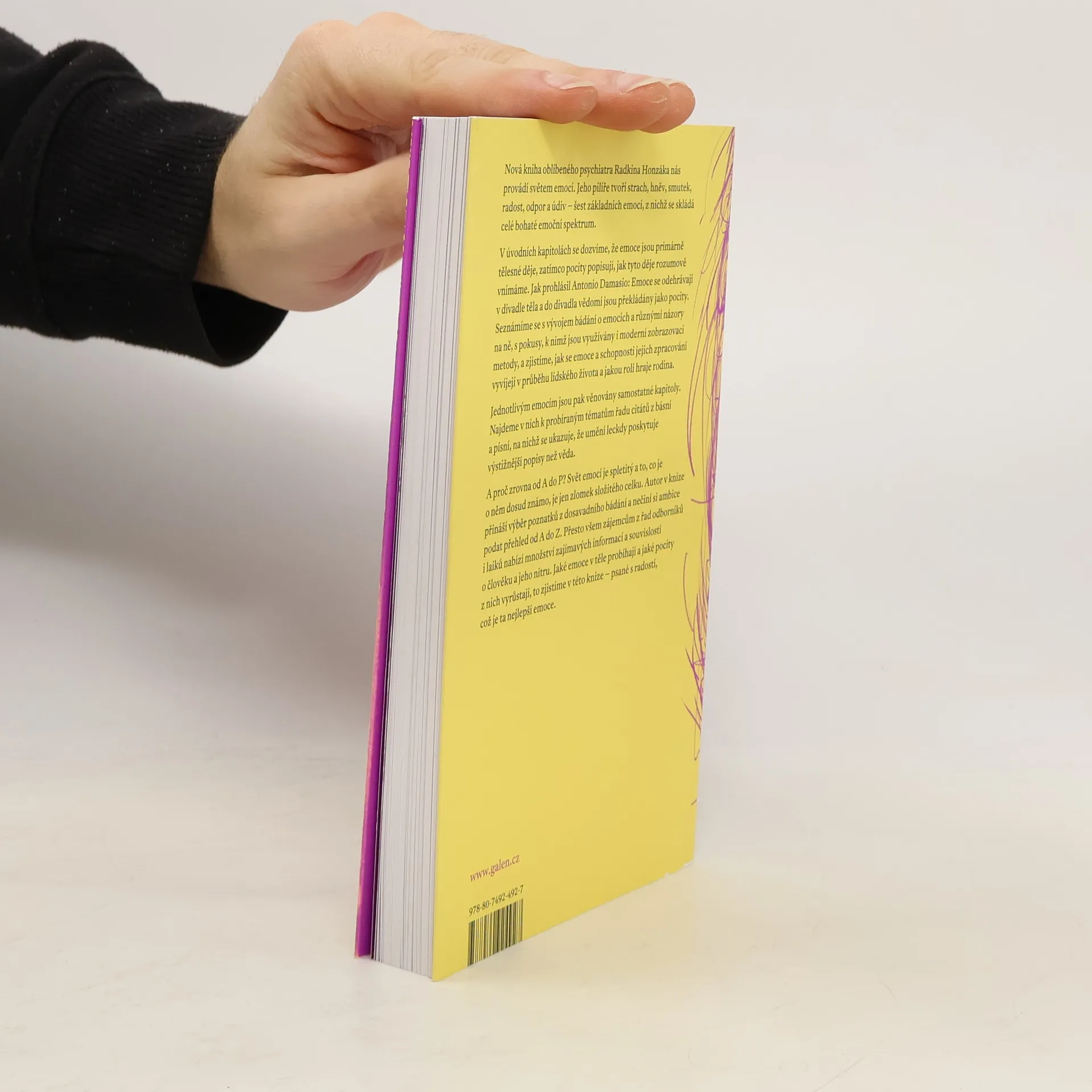 Kniha oblíbeného psychiatra Radkina Honzáka nás provádí světem emocí. Jeho pilíře tvoří strach, hněv, smutek, radost, odpor a údiv – šest základních emocí, z nichž se skládá celé bohaté emoční spektrum. V úvodních kapitolách se dozvíme, že emoce jsou primárně tělesné děje, zatímco pocity popisují, jak tyto děje rozumově vnímáme. Jak prohlásil Antonio Damasio: Emoce se odehrávají v divadle těla a do divadla vědomí jsou překládány jako pocity. Seznámíme se s vývojem bádání o emocích a různými názory na ně, s pokusy, k nimž jsou využívány i moderní zobrazovací metody, a zjistíme, jak se emoce a schopnosti jejich zpracování vyvíjejí v průběhu lidského života a jakou roli hraje rodina. Jednotlivým emocím jsou pak věnovány samostatné kapitoly. Najdeme v nich k probíraným tématům řadu citátů z básní a písní, na nichž se ukazuje, že umění leckdy poskytuje výstižnější popisy než věda. A proč zrovna od A do P? Svět emocí je spletitý a to, co je o něm dosud známo, je jen zlomek složitého celku. Autor v knize přináší výběr poznatků z dosavadního bádání a nečiní si ambice podat přehled od A do Z. Přesto všem zájemcům z řad odborníků i laiků nabízí množství zajímavých informací a souvislostí o člověku a jeho nitru. Jaké emoce v těle probíhají a jaké pocity z nich vyrůstají, to zjistíme v této knize – psané s radostí, což je ta nejlepší emoce.