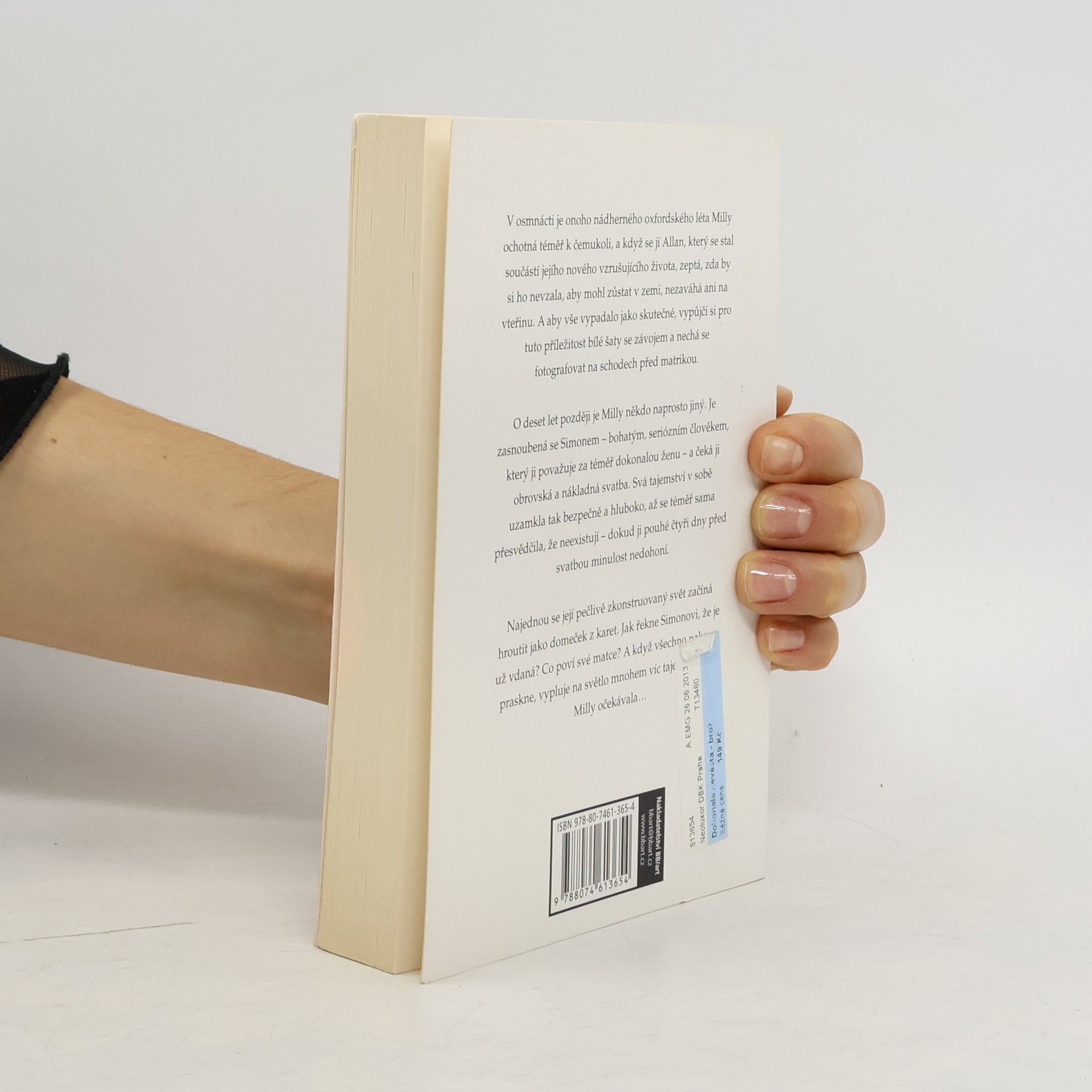 V osmnácti je onoho nádherného oxfordského léta Milly ochotná téměř k čemukoli, a když se jí Allan, který se stal součástí jejího nového vzrušujícího života, zeptá, zda by si ho nevzala, aby mohl zůstat v zemi, nezaváhá ani na vteřinu. A aby vše vypadalo jako skutečné, vypůjčí si pro tuto příležitost bílé šaty se závojem a nechá se fotografovat na schodech před matrikou. O deset let později je Milly někdo naprosto jiný. Je zasnoubená se Simonem – bohatým, seriózním člověkem, který ji považuje za téměř dokonalou ženu – a čeká ji obrovská a nákladná svatba. Svá tajemství v sobě uzamkla tak bezpečně a hluboko, až se téměř sama přesvědčila, že neexistují – dokud ji pouhé čtyři dny před svatbou minulost nedohoní. Najednou se její pečlivě zkonstruovaný svět začíná hroutit jako domeček z karet. Jak řekne Simonovi, že je už vdaná? Co poví své matce? A když všechno nakonec praskne, vypluje na světlo mnohem víc tajemství, než Milly očekávala…