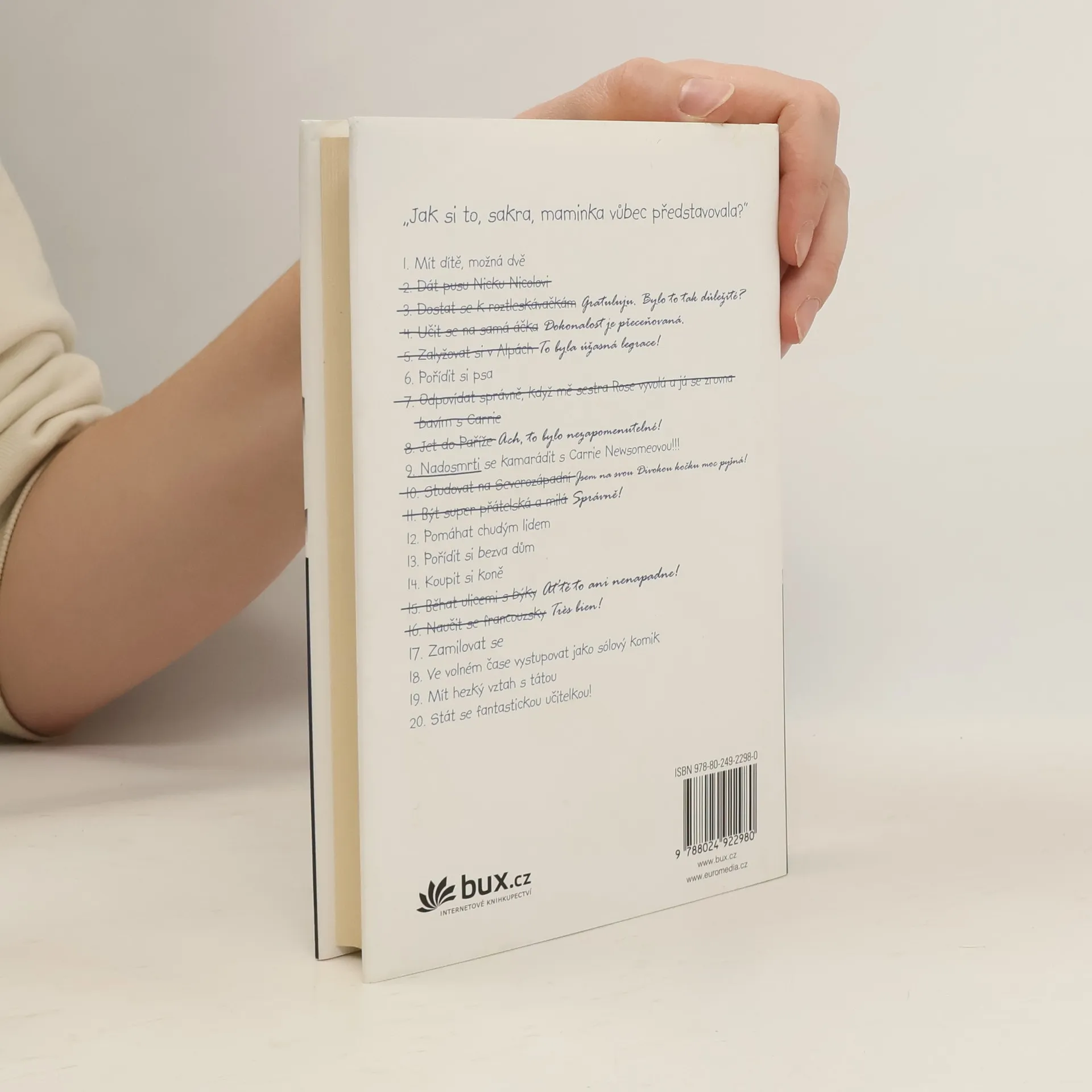 Brett Bohlingerová si až do svých 34 let žila jako princezna. Ze dne na den ale přichází o všechno, když zjišťuje, že milovaná maminka, majitelka obří kosmetické firmy, ji vynechala ze své závěti. Přesněji - její díl dědictví jí připadne pouze v případě, že dokáže do roka splnit všechna svá dětská přání, jejichž seznam si jako malá sepsala a na které už dávno zapomněla. Na rozdíl od matky. Jenomže proč by se měla Brett najednou stát učitelkou a ve volném čase dělat sólového komika, když se tak tvrdě připravovala na to, že jednou převezme rodinné impérium? A k čemu by jí byl kůň? Brett se cítí podvedená a ponížená, navíc přichází o práci, jistý příjem i dlouholetého přítele. S vidinou dědictví začíná plnit jeden bod seznamu za druhým a brzy si s překvapením uvědomuje, že jí ten starý ušmudlaný list papíru úplně ovládá. A že jí to vlastně vůbec nevadí … Půvabný románový debut americké autory o cestě za štěstím a o snech, jichž bych se člověk neměl nikdy vzdávat.