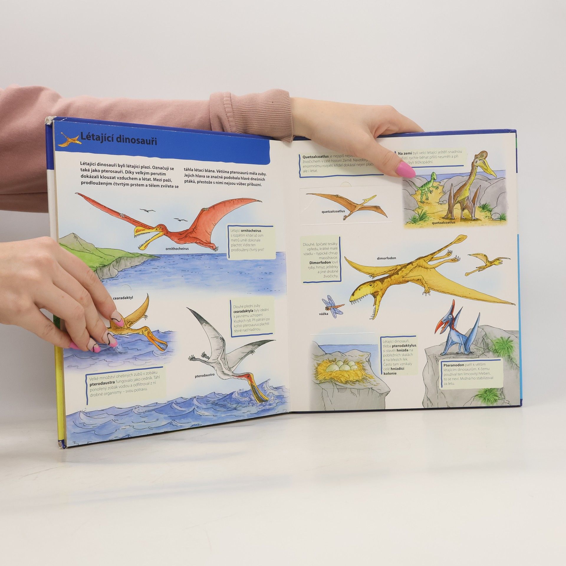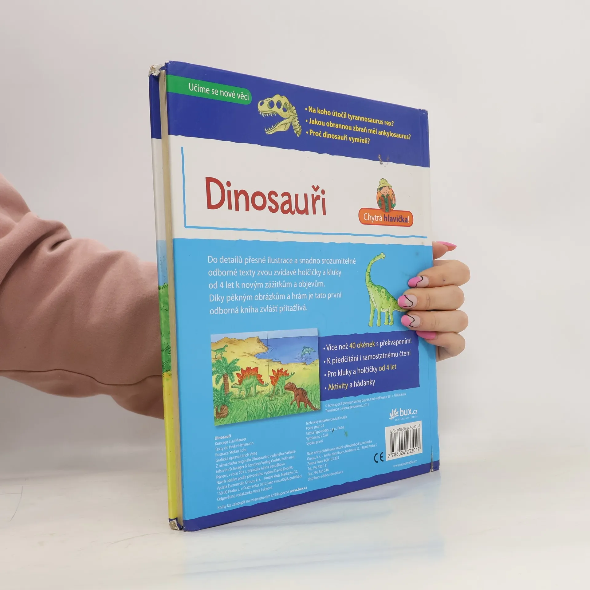 Na koho útočil tyrannosaurus rex? Jakou obrannou zbraň měl ankylosaurus? Proč dinosauři vymřeli? Do detailů přesné ilustrace a snadno srozumitelné odborné texty zvou zvídavé holčičky a kluky od 4 let k novým zážitkům a objevům. Díky pěkným obrázkům a hrám je tato první odborná kniha zvláště přitažlivá. Obsahuje více než čtyřicet okének s překvapením, aktivity a hádanky. Je vhodná k předčítání i samostatnému čtení. Pro kluky a holčičky od 4 let
