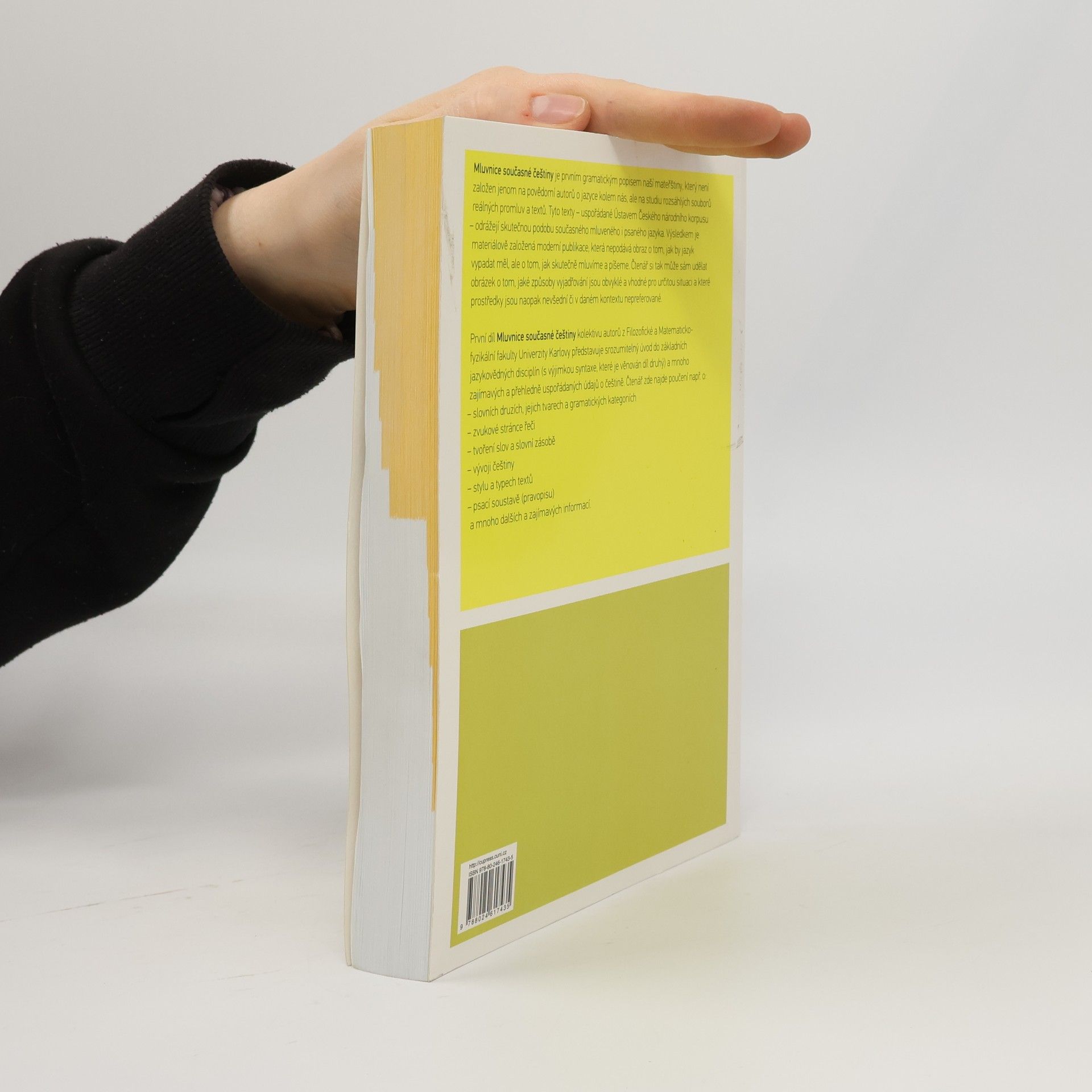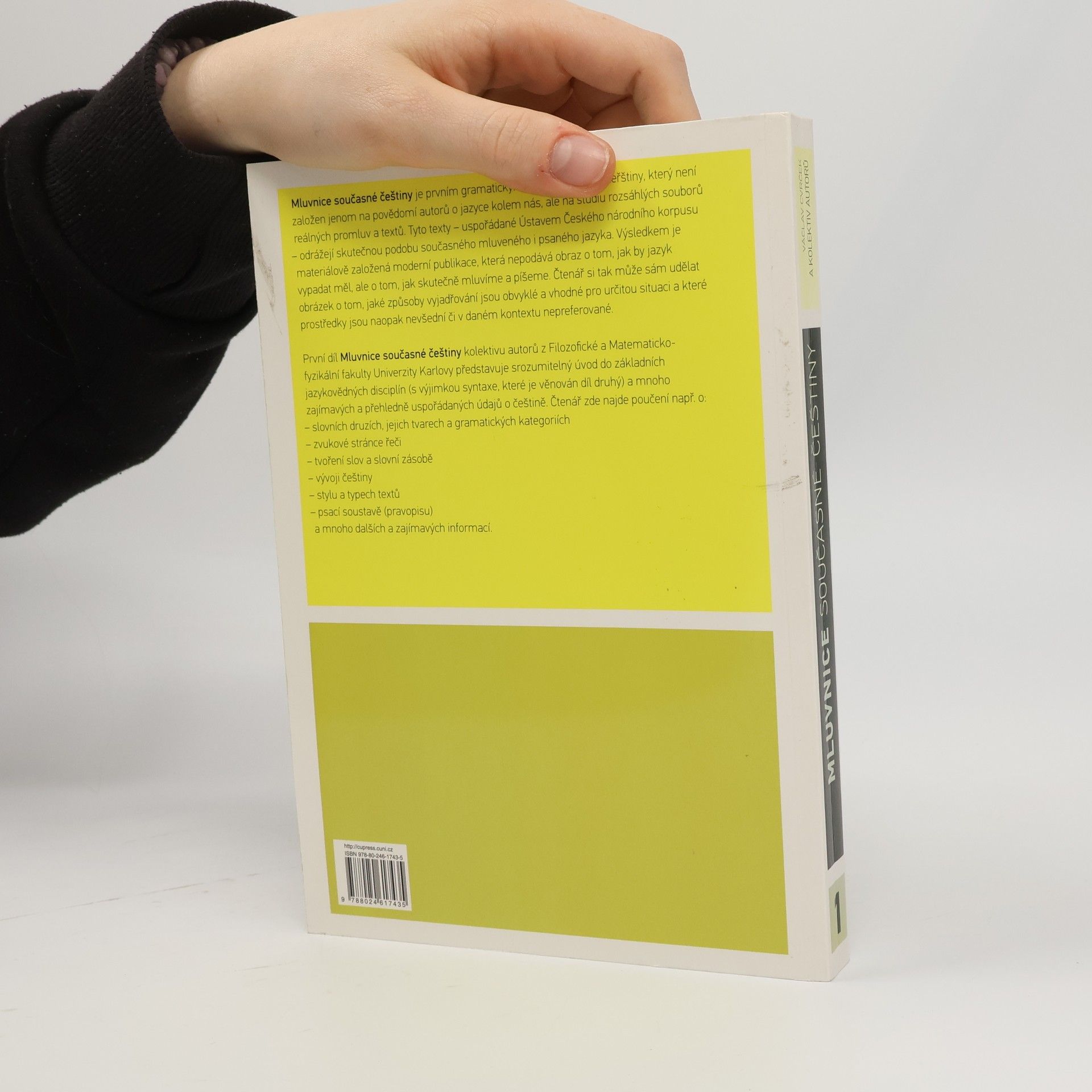 Předkládaná Mluvnice současné češtiny autorů působících na různých ústavech Univerzity Karlovy je po téměř patnácti letech novým pokusem o stručný a srozumitelný popis našeho mateřského jazyka. Mluvnice je koncipována jako dvoudílná, přičemž první díl zahrnuje poučení mj. o zvukové stránce jazyka, slovní zásobě, slovotvorbě, tvarosloví, stylistice a psací soustavě (druhý díl pak bude věnován větné skladbě). Jako vůbec první popis svého druhu se mluvnice pokouší systematicky zachycovat rozdíl mezi mluvenou a psanou češtinou, a to na základě rozsáhlých dat z Českého národního korpusu (www.korpus.cz). Výsledkem je materiálově založená moderní publikace, která nepodává obraz o tom, jak by jazyk vypadat měl, ale o tom, jak skutečně mluvíme a píšeme. Čtenář si tak může sám udělat obrázek o tom, jaké způsoby vyjadřování jsou obvyklé a vhodné pro určitou situaci a které prostředky jsou naopak nevšední či v daném kontextu nepreferované.