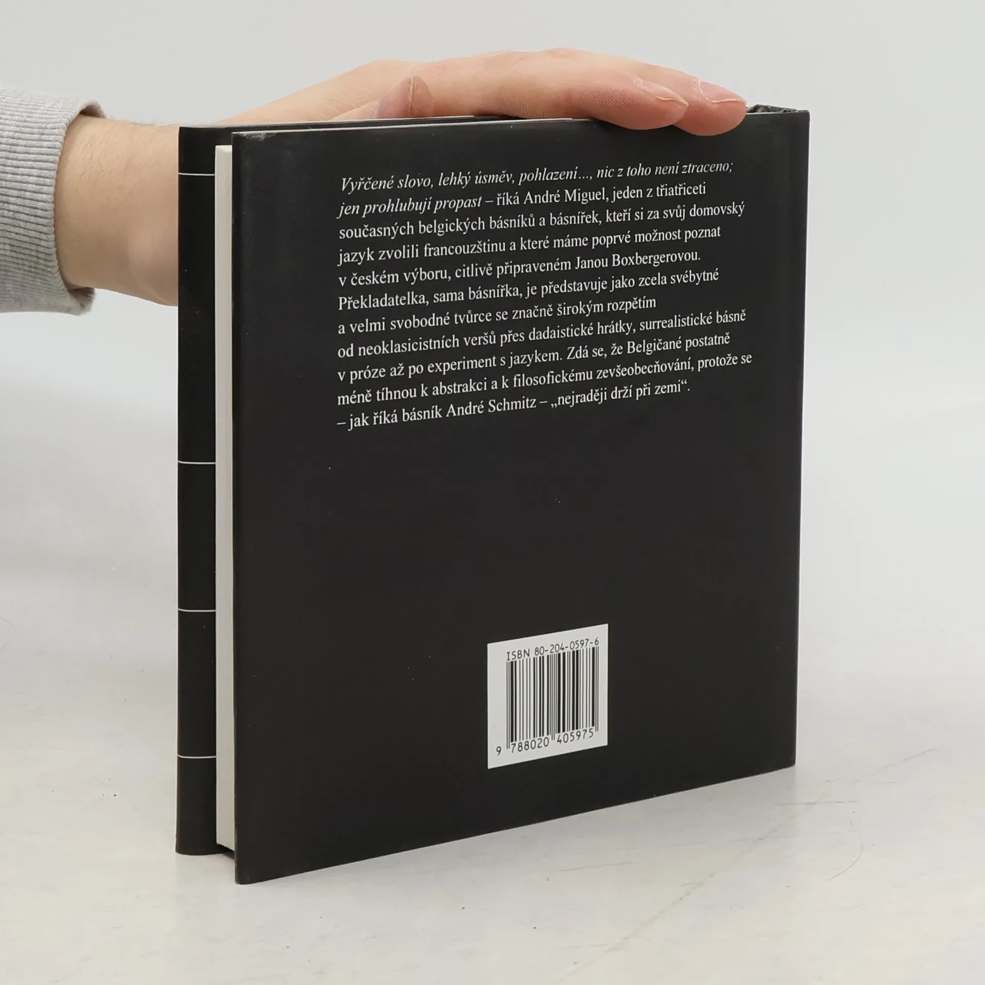Antologie současné belgické frankofonní poezie. Z francouzských originálů přeložila, komentáři a úvodem opatřila Jana Boxbergerová. Vyřčené slovo, lehký úsměv, pohlazení..., nic z toho není ztraceno; jen prohlubují propast – říká André Miguel, jeden z třiatřiceti současných belgických básníků a básnířek, kteří si za svůj domovský jazyk zvolili francouzštinu a které máme poprvé možnost poznat v českém výboru, citlivě připraveném Janou Boxbergerovou. Překladatelka, sama básnířka, je představuje jako zcela svébytné a velmi svobodné tvůrce se značně širokým rozpětím od neoklasicistních veršů přes dadaistické hrátky, surrealistické básně v próze až po experiment s jazykem. Zdá se, že Belgičané postatně méně tíhnou k abstrakci a k filosofickému zevšeobecňování, protože se – jak říká básník André Schmitz – „nejraději drží při zemi".