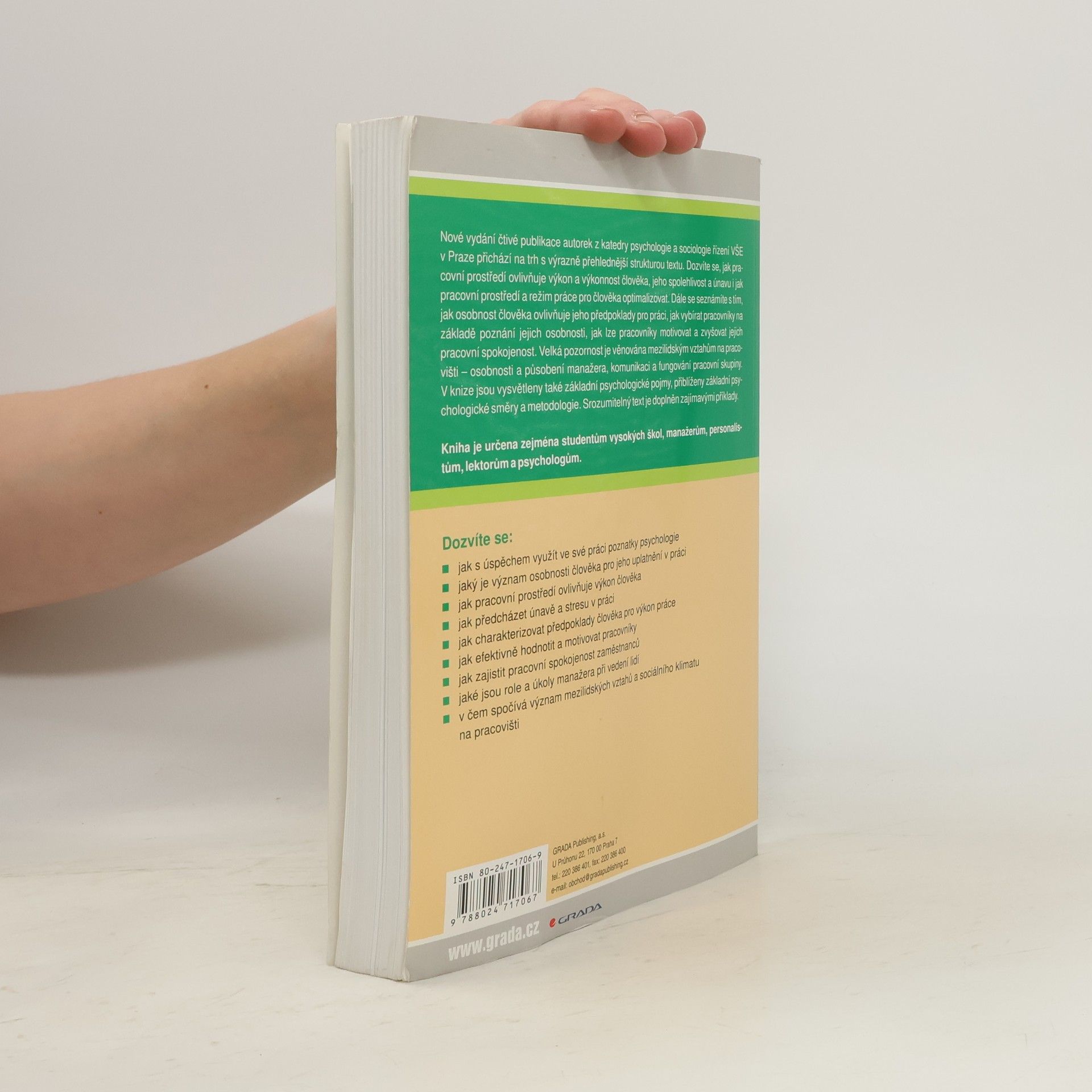 Zcela přepracované a aktualizované vydání čtivé publikace z pera autorek z katedry psychologie a sociologie řízení VŠE v Praze přichází na trh se novou, výrazně přehlednější strukturou textu. Dozvíte se, jak pracovní prostředí ovlivňuje výkon a výkonnost člověka, jeho spolehlivost a únavu i jak pracovní prostředí a režim práce pro člověka optimalizovat. Dále se seznámíte s tím, jak osobnost člověka ovlivňuje jeho předpoklady pro práci, jak vybírat pracovníky na základě poznání jejich osobnosti a mnoho dalšího.