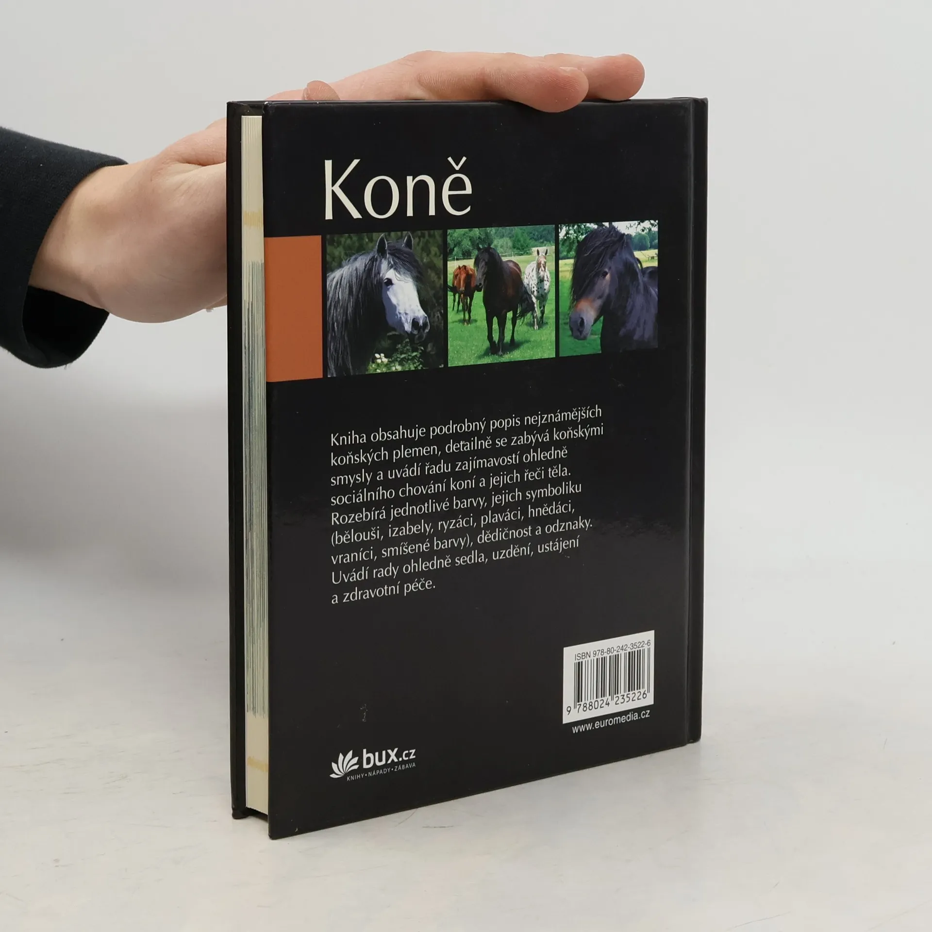 Kniha obsahuje podrobný popis nejznámějších koňských plemen, detailně se zabývá koňskými smysly a uvádí řadu zajímavostí ohledně sociálního chování koní a jejich řeči těla. Rozebírá jednotlivé barvy, jejich symboliku (bělouši, izabely, ryzáci, plaváci hnědáci, vraníci, smíšené barvy), dědičnost a odznaky. Uvádí rady ohledně sedla, uzdění, ustájení a zdravotní péče.