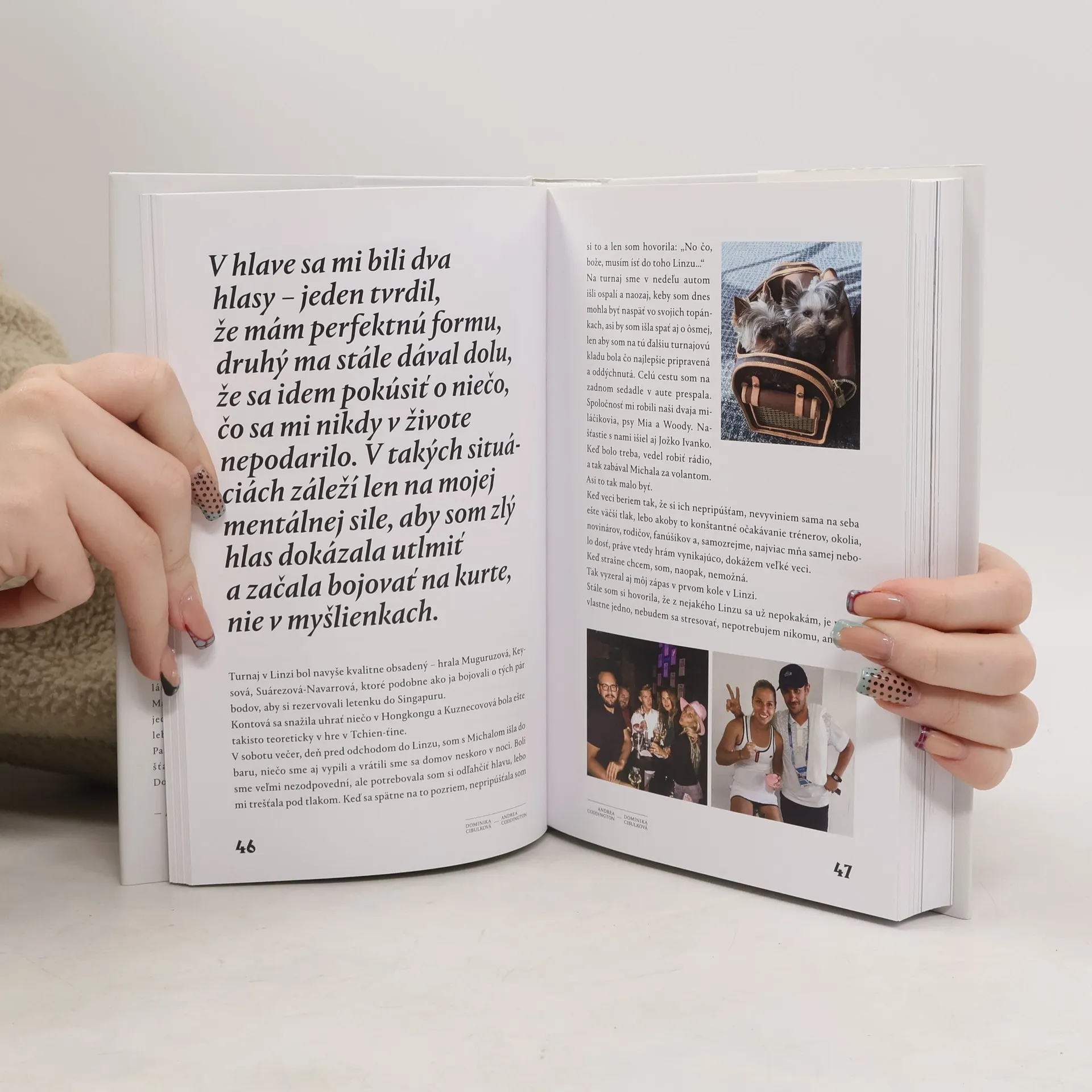 Dominika Cibulková otvorene hovorí o všetkých pádoch a potknutiach, vydretých víťazstvách, vojnách mimo kurtu, ťažkých prehrách či životných križovatkách. Priznáva svoju snahu o dokonalosť na tenisovom kurte, nervozitu, ktorá jej spôsobovala kŕče, depresiu, s ktorou bojovala takmer rok po dosiahnutí najväčšieho úspechu v kariére, priznáva rodinné problémy pre lásku. Milujú ju ľudia na celom svete, ale stala sa aj terčom nenávistných komentárov. Jej úprimná biografia zaujme i tých, ktorí o tenise nič nevedia. Je najoceňovanejšia slovenská tenistka, ktorá bola najvyššie zo všetkých v svetovom tenisovom rebríčku a ako jediná doteraz sa prebojovala do finále grandslamu a stala sa majsterkou sveta. Úspech sa nerodil ľahko, v detstve jej nikto neveril a nebyť buldočej zaťatosti jej rodičov, húževnatosti a pracovitosti, ktorou od začiatku vynikala, možno by jej príbeh bol úplne iný. Stala sa z nej tenistka svetového formátu, a predsa stále rešpektuje autoritu a úspech prijíma s pokorou.