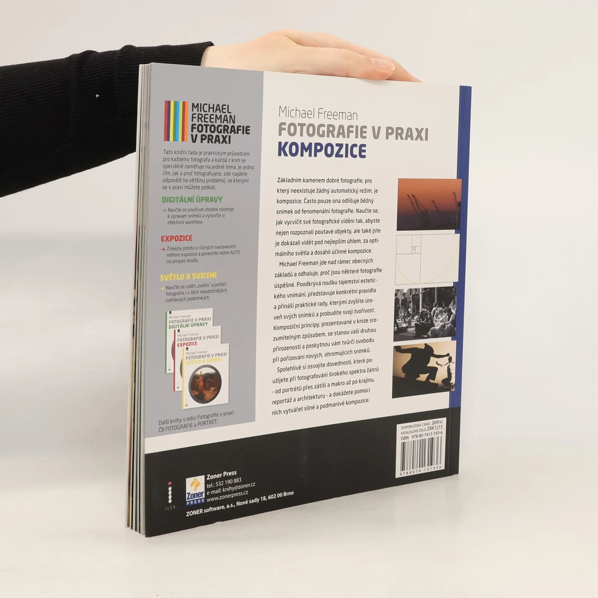 Kompozice je to, co nemůžete nastavit na fotoaparátu; je ve vaší hlavě. Tato kniha se snaží vám ji tam dostat. Ediční řada Fotografie v praxi je určena zájemcům o digitální fotografii, ale využít ji mohou i ti, kteří pracují s klasickými filmovými fotoaparáty. Publikace se zaměřují na specifické problémy, které zajímají fotografy, a vyhýbají se opakování základních informací o fotografování a fungování fotoaparátů. Každá kniha se detailně věnuje určité oblasti, vhodné pro začínající až středně pokročilé fotografy. Kompozice, tedy uspořádání prvků na snímku, má svá pravidla, která se vyvíjela po tisíciletí a odrážejí to, co považujeme za příjemné a harmonické. Znalost těchto principů nestačí; je třeba také znát techniky, jak je realizovat. Od umístění hlavního objektu, využití linií, barev a světla až po práci s negativním prostorem a vyvážením snímku – vše je jasně vysvětleno a ilustrováno. Knihy obsahují cvičení pro čtenáře a ukázky, jak je splnili studenti autorových kurzů, včetně autorova hodnocení a poznámek k těmto fotografiím.