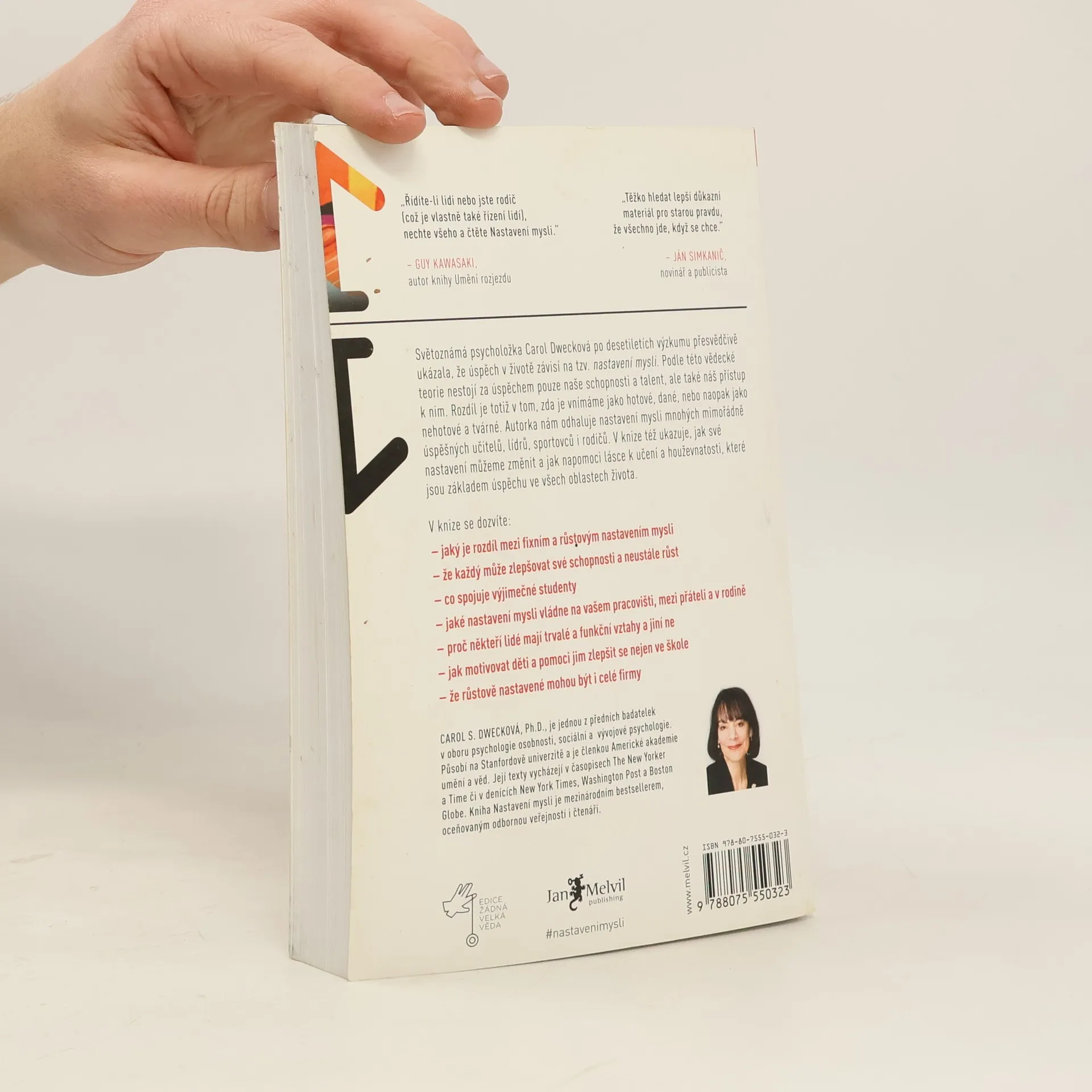 Jednoduchá myšlenka, kolem níž se tato kniha točí, a za níž stojí desítky let vědeckého výzkumu, se dá vyjádřit zhruba takto: úspěch máme ve svých hlavách. Profesorka Dwecková se svým týmem na Standfordské univerzitě zjistila, že svou přirozeností tíhneme ke dvěma relativně vyhraněným způsobům myšlení o sobě a své úspěšnosti: k myšlení růstovému a myšlení fixnímu (angl. „growth mindset“ a „fixed mindset“). To, které myšlení u nás převládá, pak významně ovlivňuje naši reálnou úspěšnost. Ke zjištěním Dweckové popsaným v knize patří nadějný závěr, že se navzdory své dispozici dokážeme během života změnit, a autorka ukazuje, jak na to: jak využít svůj plný potenciál. Chcete vědět, jak přesně se dva zmíněné typy myšlení projevují? Typickým rysem fixního myšlení je vzdávání se před překážkou, neschopnost přijímat zpětnou vazbu, špatný pocit při vnímání úspěchu ostatních, vyhýbání se výzvám a negativní postoj k úsilí jako takovému. Naopak růstové myšlení se projevuje vřelým vztahem k výzvám, vytrvalostí při čelení překážkám, pozitivním vztahem ke kritice. Růstově myslící člověk vnímá úsilí jako cestu k mistrovství a v úspěchu druhých vidí inspiraci.
