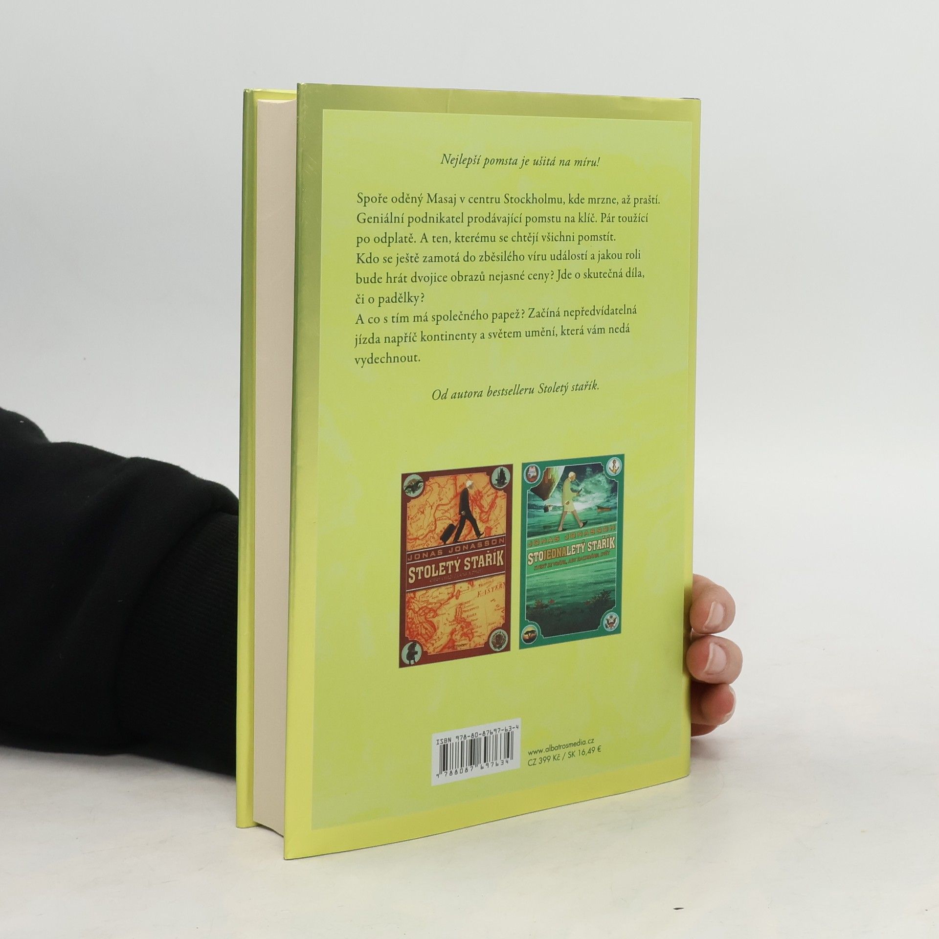 Nejlepší pomsta je ušitá na míru! Od autora bestselleru Stoletý stařík. Spoře oděný Masaj v centru Stockholmu, kde mrzne, až praští. Geniální podnikatel prodávající pomstu na klíč. Pár toužící po odplatě. A ten, kterému se chtějí všichni pomstít. Kdo se ještě zamotá do zběsilého víru událostí a jakou roli bude hrát dvojice obrazů nejasné ceny? Jde o skutečná díla, či o padělky? A co s tím má společného papež? Začíná nepředvídatelná jízda napříč kontinenty a světem umění, která vám nedá vydechnout.