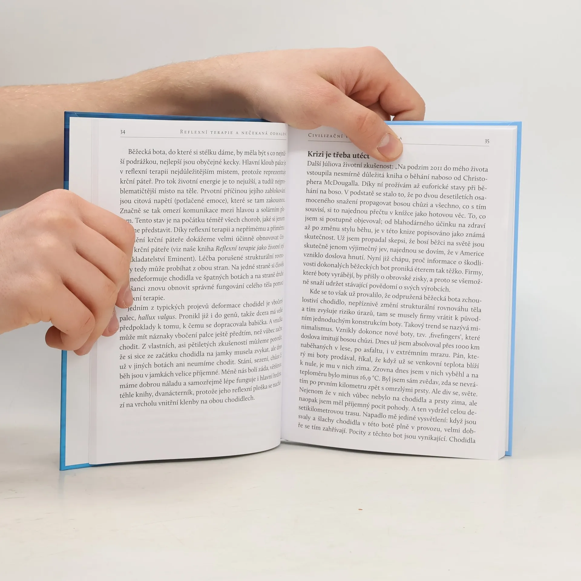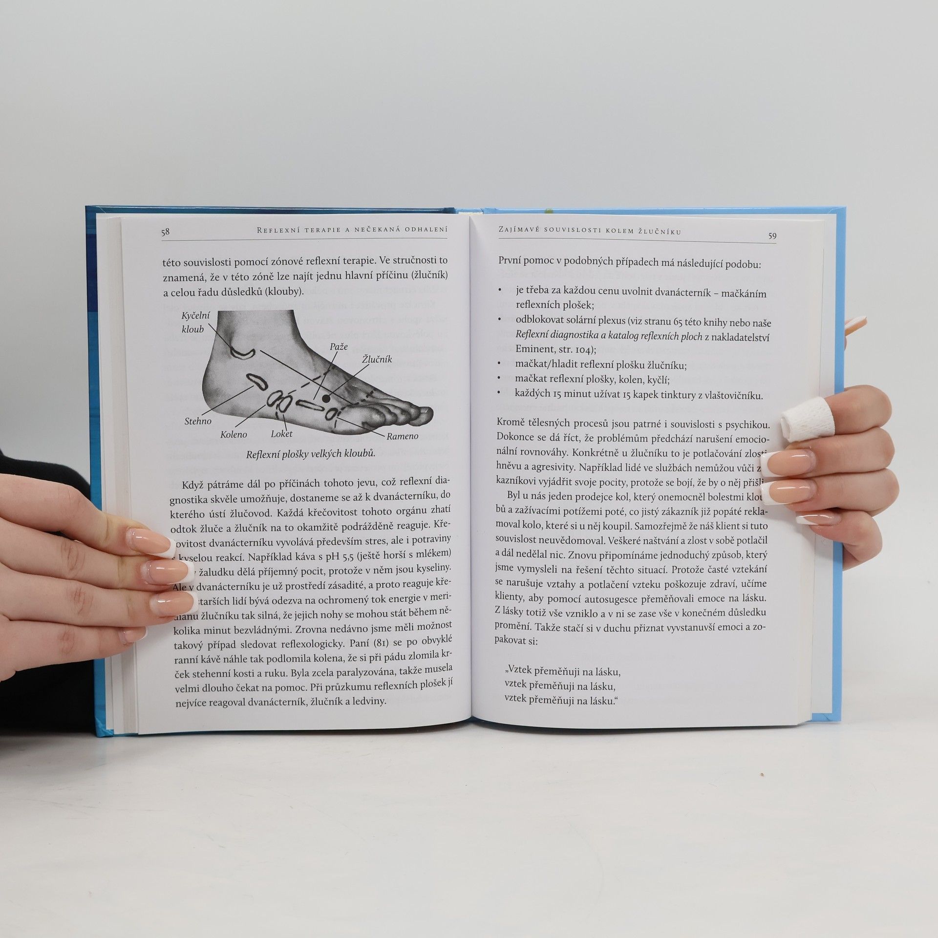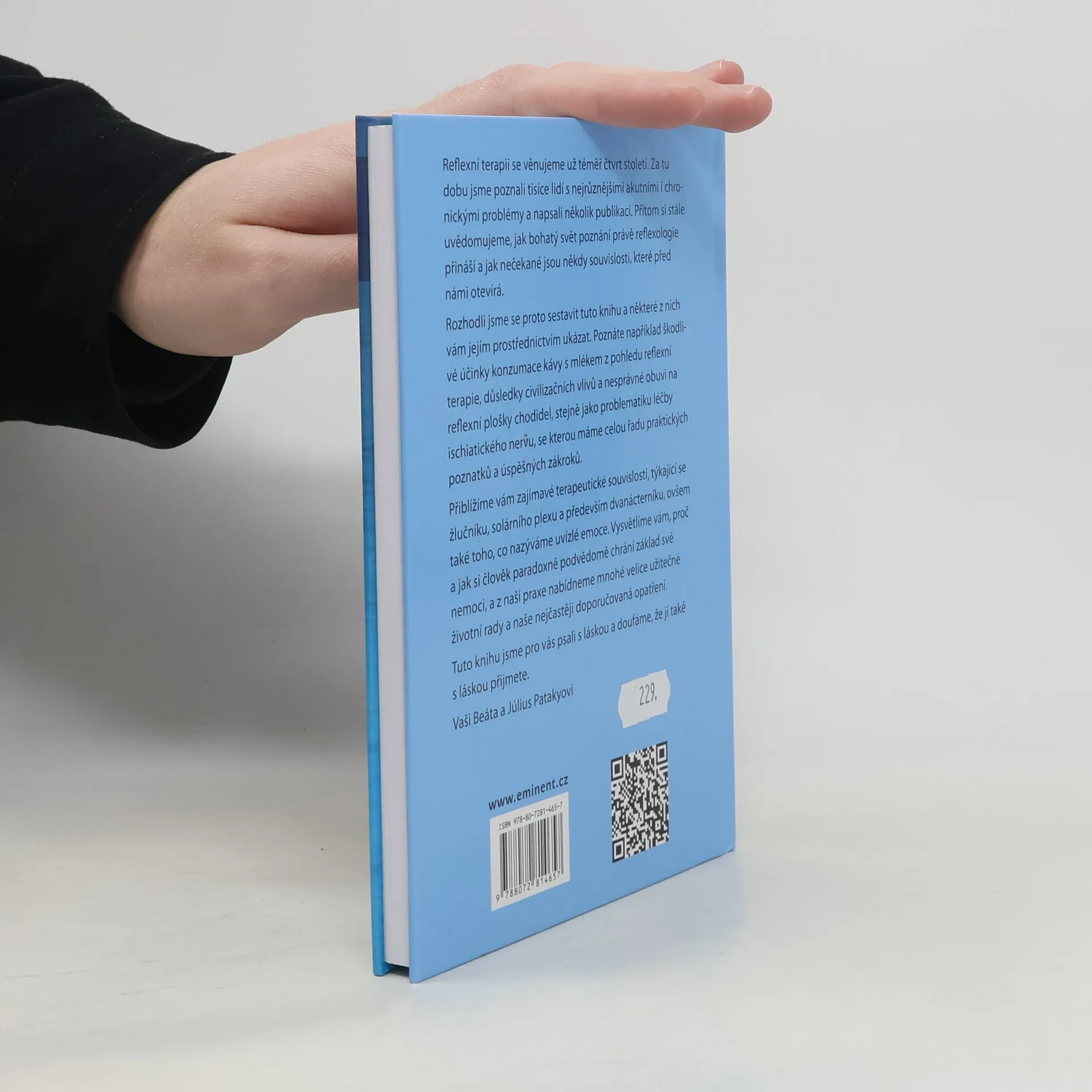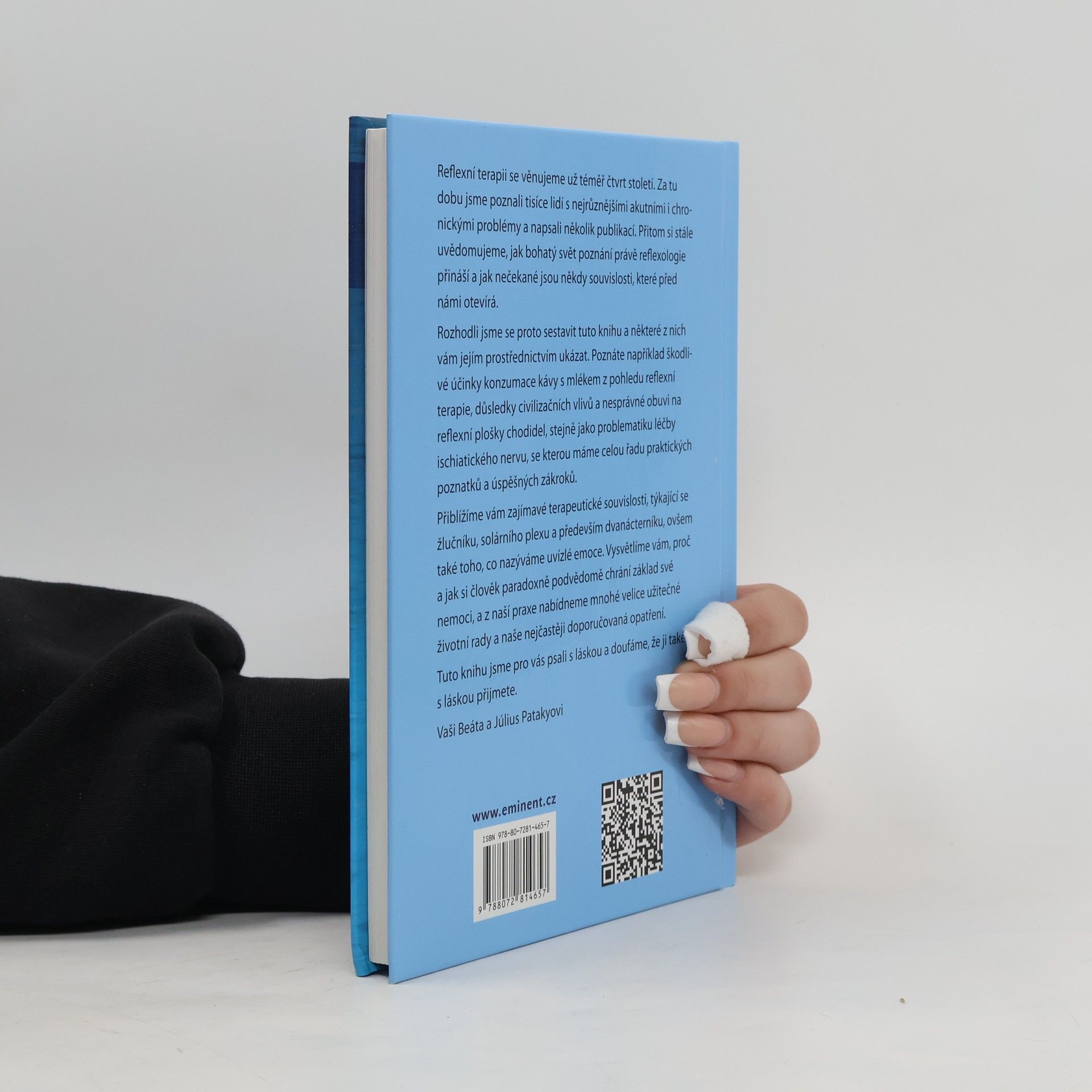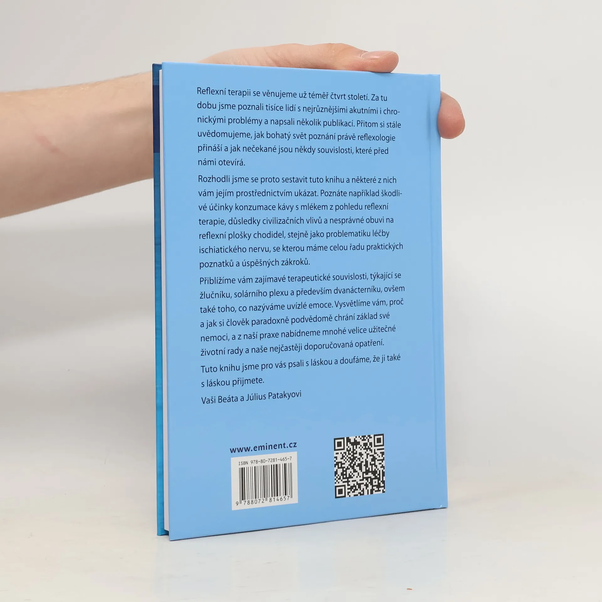 Autoři se reflexní terapii věnují už téměř čtvrt století. Za tu dobu poznali tisíce lidí s nejrůznějšími akutními i chronickými problémy a napsali několik publikací. Přitom si stále uvědomují, jak bohatý svět poznání právě reflexologie přináší a jak nečekané jsou někdy souvislosti, které před nimi otevírá. Rozhodli se proto sestavit tuto knihu a některé z nich nám jejím prostřednictvím ukázat. Poznáte například škodlivé účinky konzumace kávy s mlékem z pohledu reflexní terapie, důsledky civilizačních vlivů a nesprávné obuvi na reflexní plošky chodidel, stejně jako problematiku léčby ischiatického nervu, se kterou mají celou řadu praktických poznatků a úspěšných zákroků. Přiblíží nám zajímavé terapeutické souvislosti, týkající se žlučníku, solárního plexu a především dvanácterníku, ovšem také toho, co nazývjí uvízlé emoce. Vysvětlí nám, proč a jak si člověk paradoxně podvědomě chrání základ své nemoci, a z jejich praxe nabídnou mnohé velice užitečné životní rady a nejčastěji doporučovaná opatření.