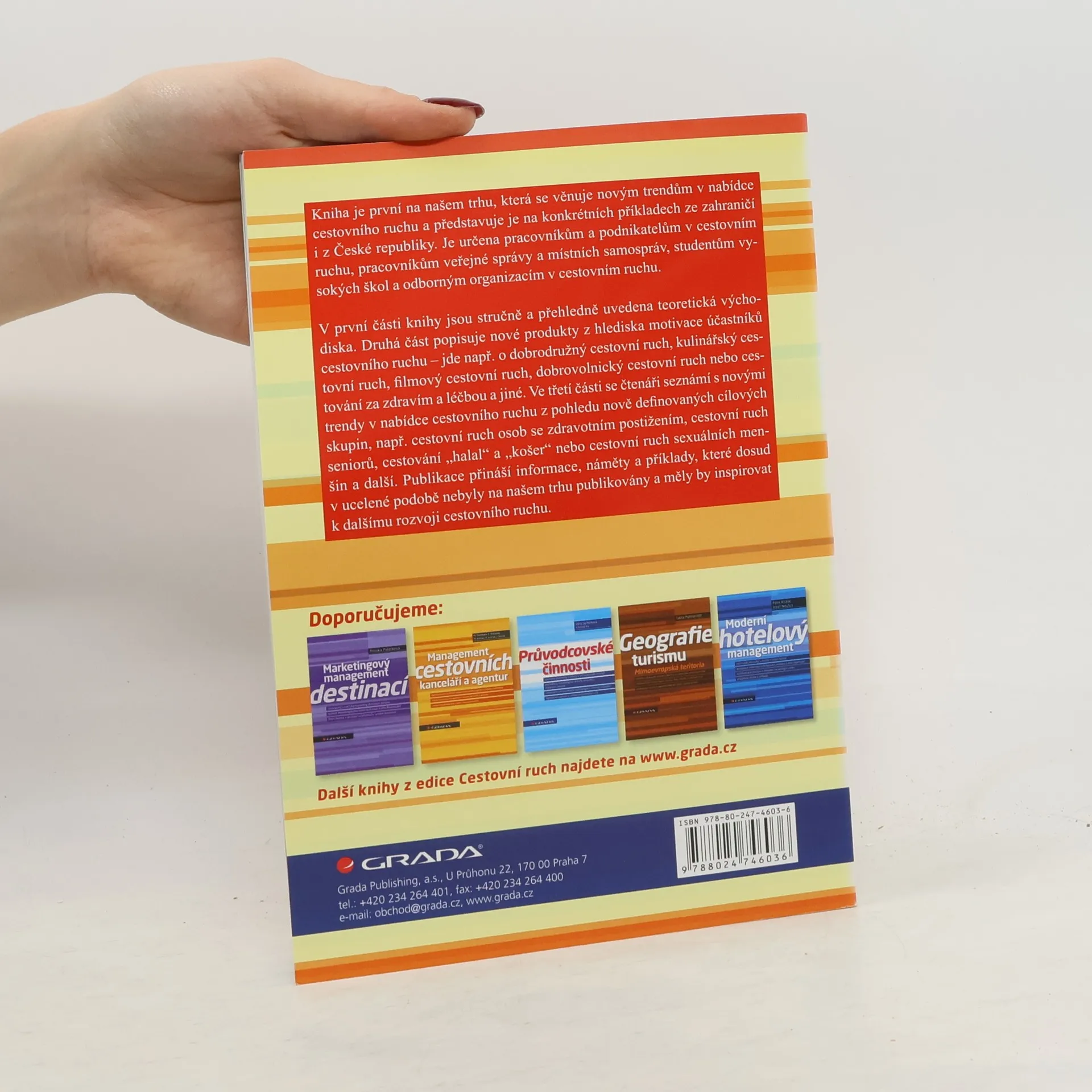 Jak se v cestovním ruchu odrážejí změny v motivaci a v potřebách účastníků cestovního ruchu? Které nové produkty mají potenciál pro uplatnění na trhu? Odpovědí na tyto otázky se pokouší najít publikace Nové trendy v nabídce cestovního ruchu. V první části knihy jsou uvedeny stručně a přehledně teoretická východiska. Druhá část popisuje nové produkty z hlediska motivace účastníků cestovního ruchu – jde např. o dobrodružný cestovní ruch, kulinářský cestovní ruch, filmový cestovní ruch, dobrovolnický cestovní ruch nebo cestování za zdravím a léčbou a jiné. V třetí části se čtenáři seznámí s novými trendy v nabídce cestovního ruchu z pohledu nově definovaných cílových skupin, např. cestovní ruch osob se zdravotním postižením, cestovní ruch seniorů, cestování „halal“ a „košer“ nebo cestovní ruch sexuálních menšin a další.