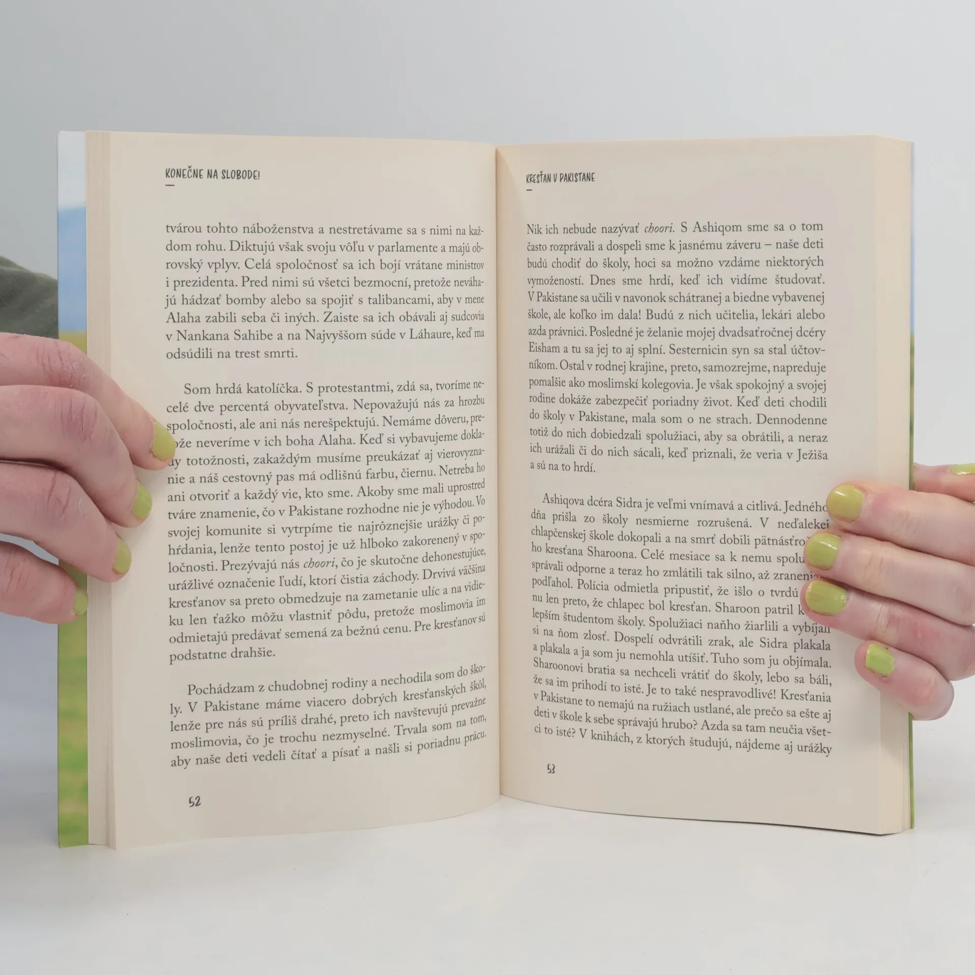 „Nemám dobrú pamäť na dátumy, no sú dni, na ktoré nikdy nezabudnem. Tak ako na piatok 19. júna 2009. Pred západom slnka som prišla po prvýkrát do cely predbežného zadržania v Sheikhupure. Strávila som tu nasledujúce tri roky, kým som ju nevymenila za väzenie, tak ako iní menia starý dom za novší.“ Kresťanku Asiu Bibi odsúdili v Pakistanskej islamskej republike na smrť za to, že sa napila vody zo studne, ktorá patrila moslimom. Čakalo ju deväť rokov väzenia. Deväť rokov znášala ponižovanie a týranie za údajné rúhanie. Prečítajte si svedectvo obyčajnej ženy, matky, ktorá sa stala celosvetovým symbolom boja proti náboženskému extrémizmu. „V médiách ste o mne určite počuli… Predstavili ste si moju kalváriu, pravdepodobne ste sa aj pokúsili vžiť do mojej kože a mohli ste tak lepšie porozumieť utrpeniu. Ale isto nepoznáte celý príbeh, preto mi dovoľte, aby som vám ho rozpovedala.“ V roku 2020 kniha získala Literárnu cenu za ľudské práva, ktorú udeľuje francúzska organizácia NOUVEAUX Droits de l ́Homme.