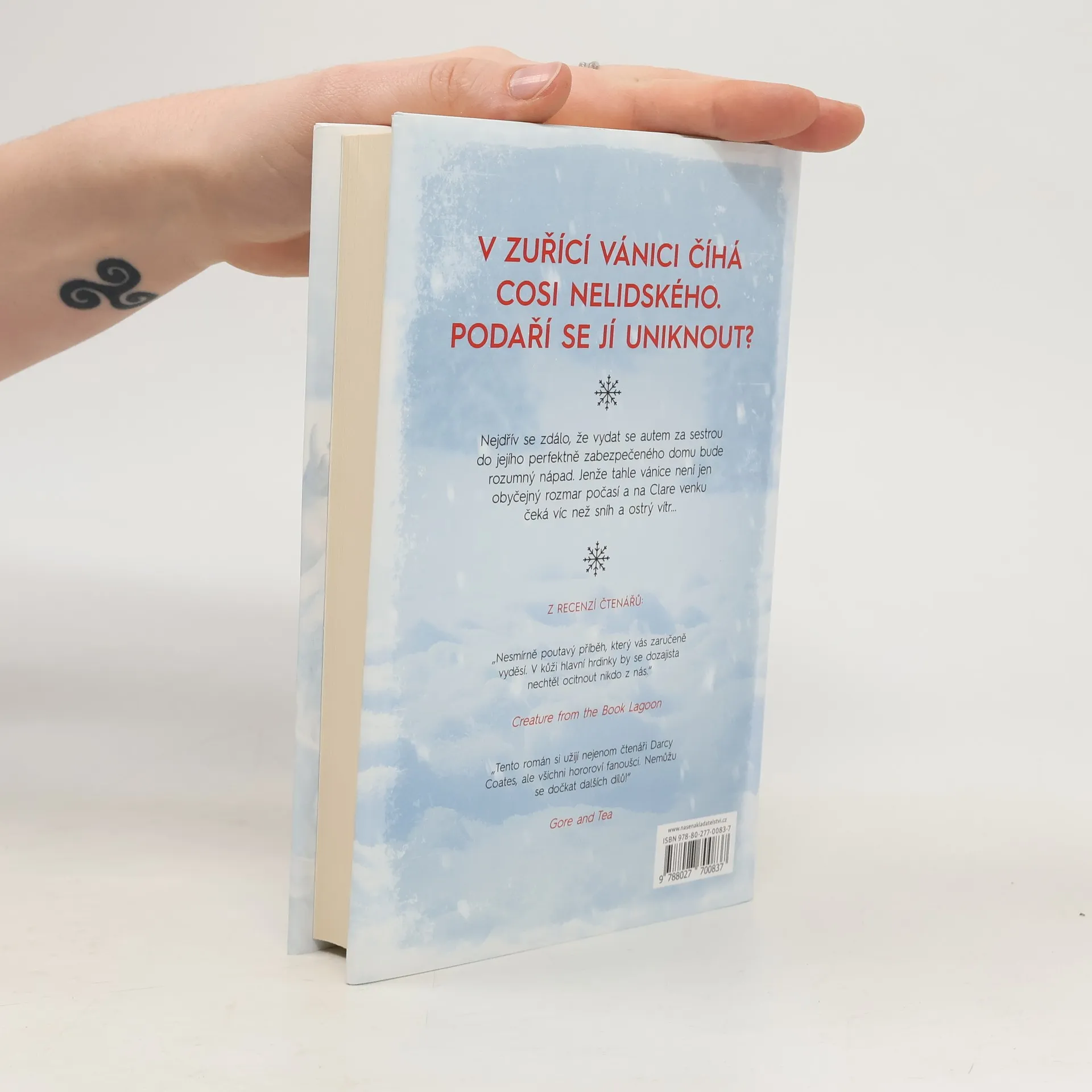 Clare si vybavila zimu. A opuštěná auta u krajnice, hračky poházené na silnici. Vybavila si nekonečnou vánici a hrůzu, kterou nedokázala vysvětlit. A pak už nic… Když se probudila, ležela celá rozbolavělá a vyděšená v prastarém, ponurém domě, připomínajícím spíše starodávné šlechtické sídlo. U postele seděl neznámý mladý muž a tvrdil, že měla ve vánici autonehodu. Našel ji a přinesl do svého domu. Clare by ze všeho nejraději utekla, ale je až příliš slabá a vánice za okny stále nepolevuje. Uvěznila je v domě a Clare nezbývá než čekat. Mladík se k ní chová mile, ale Clare si není jistá, nakolik mu může důvěřovat? On tvrdí, že jsou v domě sami, ale ona má pocit, že vidí a slyší věci, které naznačují, že kolem někdo slídí a čeká na příležitost. Napětí stále stoupá a s ním i pocit, že se z nich stala lovná zvěř. Clare dochází k závěru, že její nehoda nebyla náhodná. Venku za dveřmi na ni něco číhá, něco čeká, až opustí bezpečí kamenných zdí… něco strašného, nelidského a krutého.
