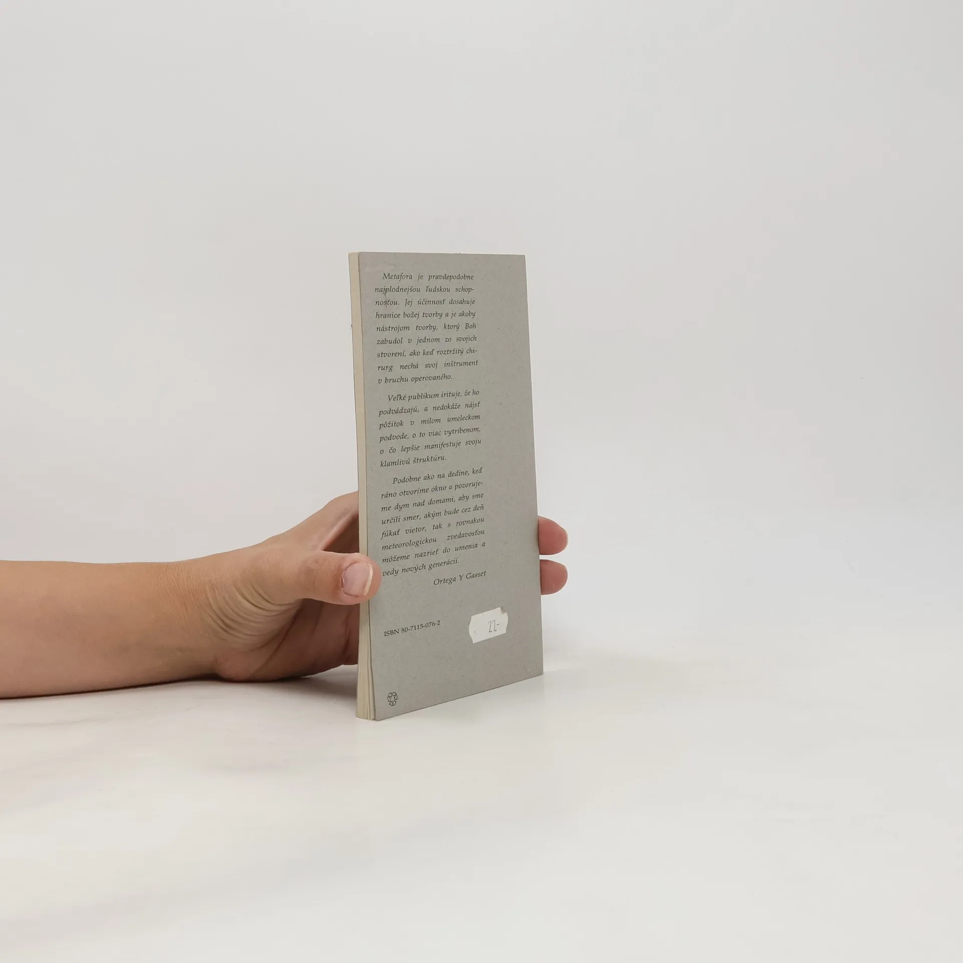 Metafora je pravdepodobne najplodnejšou ľudskou schopnosťou. Jej účinnosť dosahuje hranice božej tvorby a je akoby nástrojom tvorby, ktorý Boh zabudol v jednom zo svojich stvorení, ako keď roztržitý chirurg nechá svoj inštrument v bruchu operovaného. Veľké publikum irituje, že ho podvádzajú, a nedokáže nájsť pôžitok v milom umeleckom podvode, o to viac vytríbenom, o čo lepšie manifestuje svoju klamlivú štruktúru. Podobne ako na dedine, keď ráno otvoríme okno a pozorujeme dym nad domami, aby sme určili smer, akým bude cez deň fúkať vietor, tak s rovnakou meteorologickou zvedavos ťou môžeme nazrieť do umenia a vedy nových generácií. Ortega y Gasset