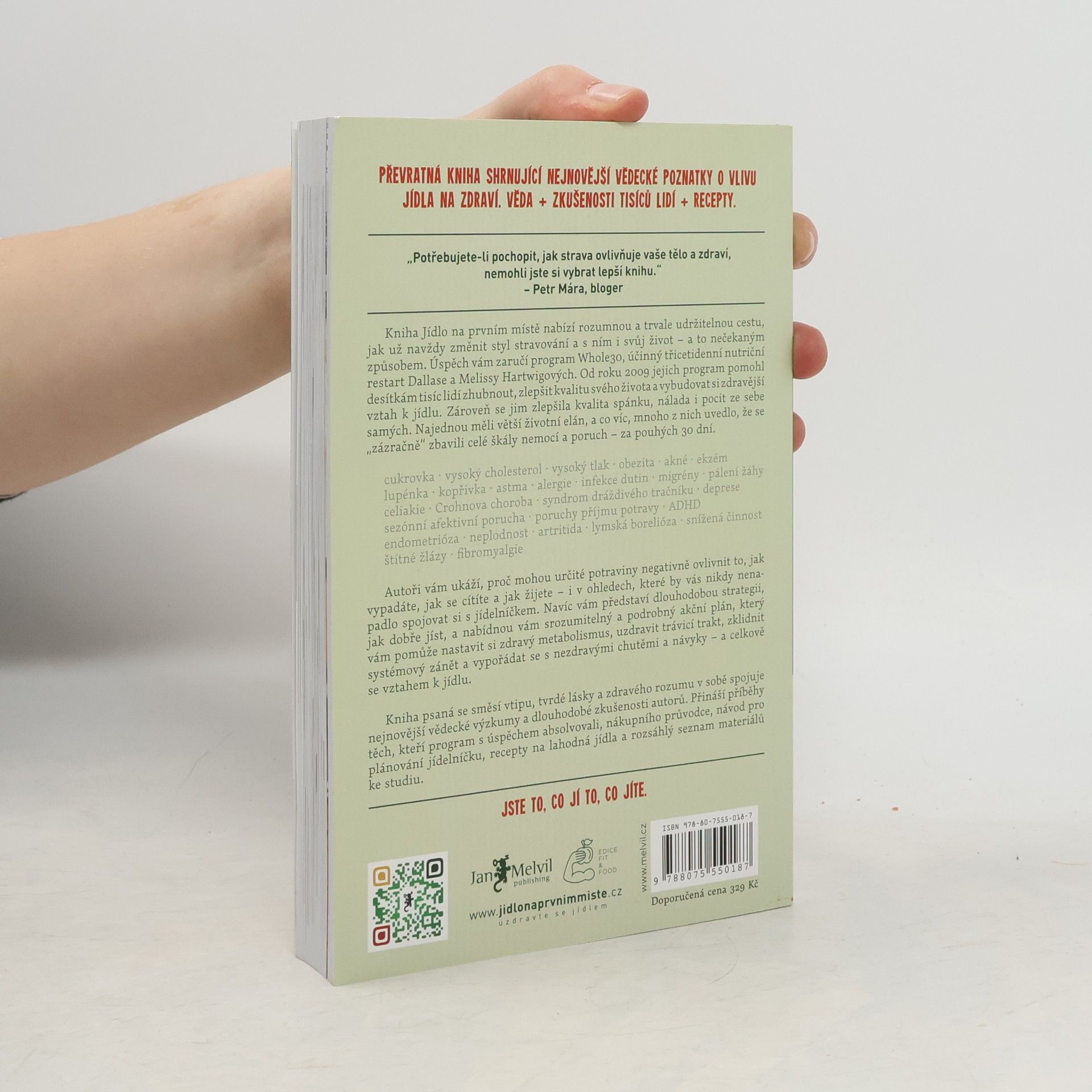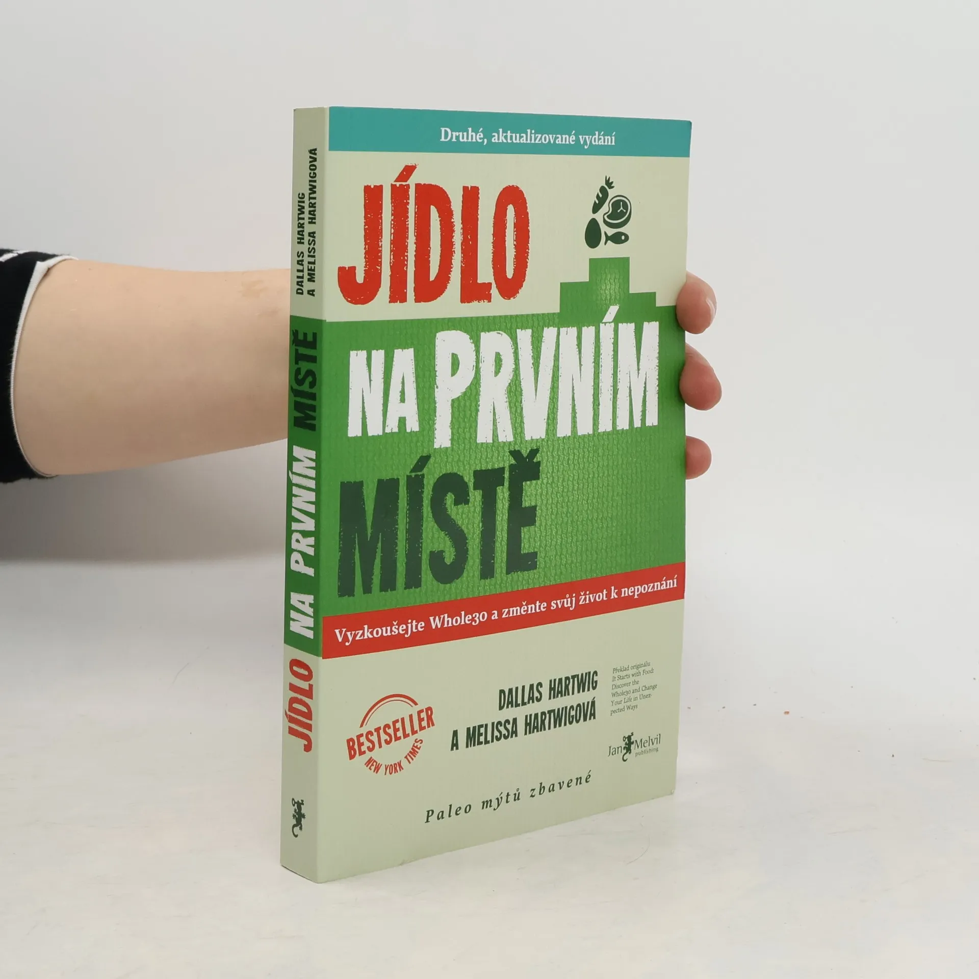 Jídlo na prvním místě není řadová kniha o paleodietě, tohle je Melvilem pečlivě zvolený vstupní titul nabízející skutečnou životní změnu. Že nemáte tušení, co to je paleodieta? Všichni víme, že jídlo ovlivňuje kvalitu našeho života – ale jak velkou moc vlastně má? Melissa a Dallas vás přesvědčí, že mimořádnou! Jídlo na prvním místě je přehledný, čtivý a srozumitelný návod, díky kterému konečně pochopíte vzájemné reakce inzulínu, leptinu, kortizolu a glukagonu. Autoři vám na podkladě vědeckých výzkumů vysvětlí fakt, proč sacharidy v naší stravě nejsou tím nejpříznivějším palivem a že paleodieta je nejlepší způsob, jak je nahradit. Autoři tvrdí, že už během 30 dnů po změně stravovacího plánu sestaveného podle jejich instrukcí dochází ke zlepšení stavu mnoha chronických, obtížně léčitelných onemocnění, jako jsou cukrovka, lupénka, Crohnova choroba, endometriáza, ekzémy a dalších. Množství receptů a tipů je doplněno vysvětlením, co jak na jednotlivá jídla reaguje naše tělo. Sympatičtí autoři vás postupně a s humorem převedou k zdravým návykům, díky nimž dochází ke zlepšení stavu celého těla, hormonální rovnováze, ústupu zažívacích obtíží a redukci zánětlivých procesů. Hartwigovi jsou tvrďáci. 30 dní jejich kůry je velmi náročný měsíc, ale jak sami říkají, je to pro vaše dobro: "Neodvažujte se namítat, že je to těžké. Skoncovat s heroinem je těžké. Porazit rakovinu je těžké. Pít kávu bez mléka NENÍ TĚŽKÉ!" 2. aktualizované vydání