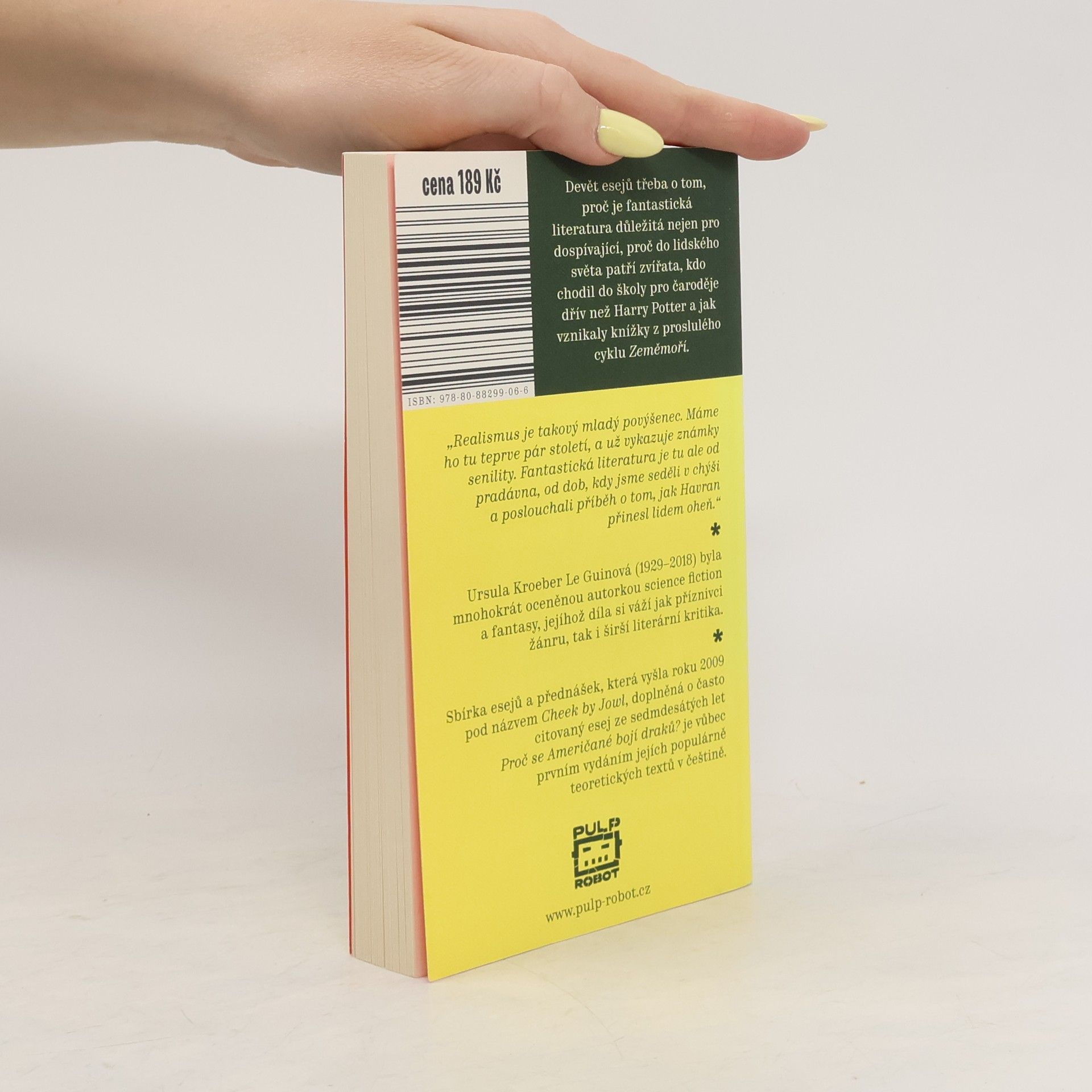 Devět esejů třeba o tom, proč je fantastická literatura důležitá nejen pro dospívající, proč do lidského světa patří zvířata, který čaroděj chodil do školy dřív než Harry Potter a jak vznikaly knížky z proslulého cyklu Zeměmoří. Překlad sbírky přednášek Cheek by Jowl z roku 2009, doplněný o často citovaný esej ze sedmdesátých let Proč se Američané bojí draků. Obsahuje eseje: * Bok po boku, tlapku v ruce – zvířata v dětské literatuře * Klidné místo uvnitř * Kritici, netvoři a fantastové * Mladý dospělý v young adult literatuře * Některé předpoklady o fantasy * Poselství o poselstvích * Proč chtějí mladí lidé fantasy aneb Pozor na to, co jíte * Proč se Američané bojí draků? * Znovu si přečíst králíčka Petra