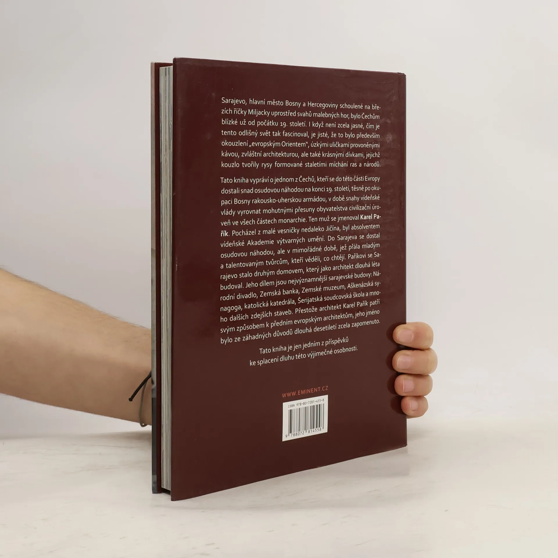 Sarajevo, hlavní město Bosny a Hercegoviny, ležící na březích říčky Miljacky, fascinovalo Čechy od 19. století. Město okouzlovalo evropským Orientem, úzkými uličkami provoněnými kávou, zvláštní architekturou a krásnými dívkami, jejichž rysy byly formovány staletími míchání ras a národů. Kniha vypráví příběh Karela Paříka, Čecha, který se do Sarajeva dostal na konci 19. století, po okupaci Bosny rakousko-uherskou armádou. Pocházel z malé vesničky nedaleko Jičína a byl absolventem vídeňské Akademie výtvarných umění. V mimořádné době, která přála mladým talentům, se Pařík stal architektem a Sarajevo se mu stalo druhým domovem. Jeho dílem jsou významné sarajevské budovy, jako Národní divadlo, Zemská banka, Zemské muzeum, Aškenázská synagoga a katolická katedrála. Ačkoliv Karel Pařík patřil k předním evropským architektům, jeho jméno bylo po dlouhá desetiletí zapomenuto. Tato kniha přispívá k obnovení paměti na tuto výjimečnou osobnost.