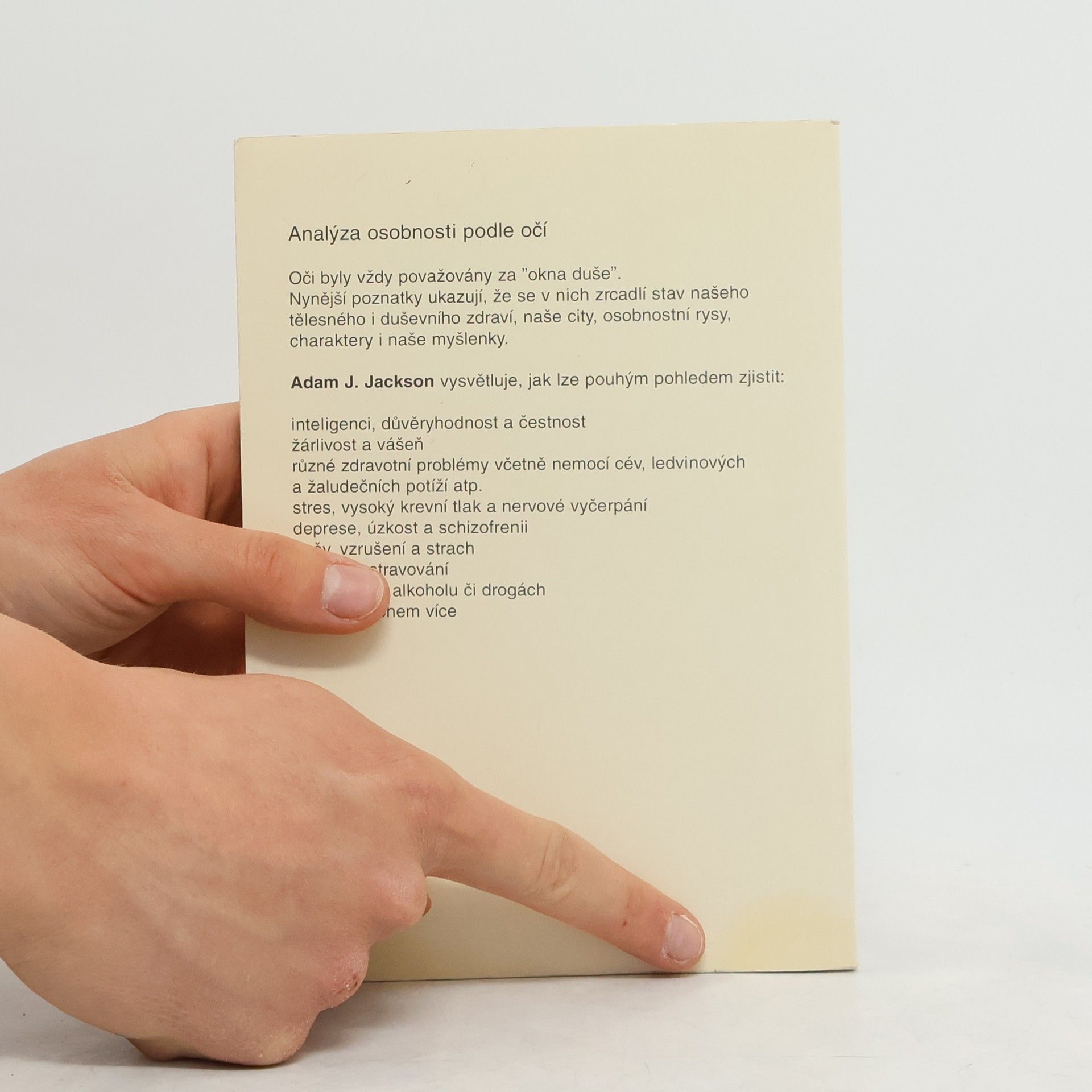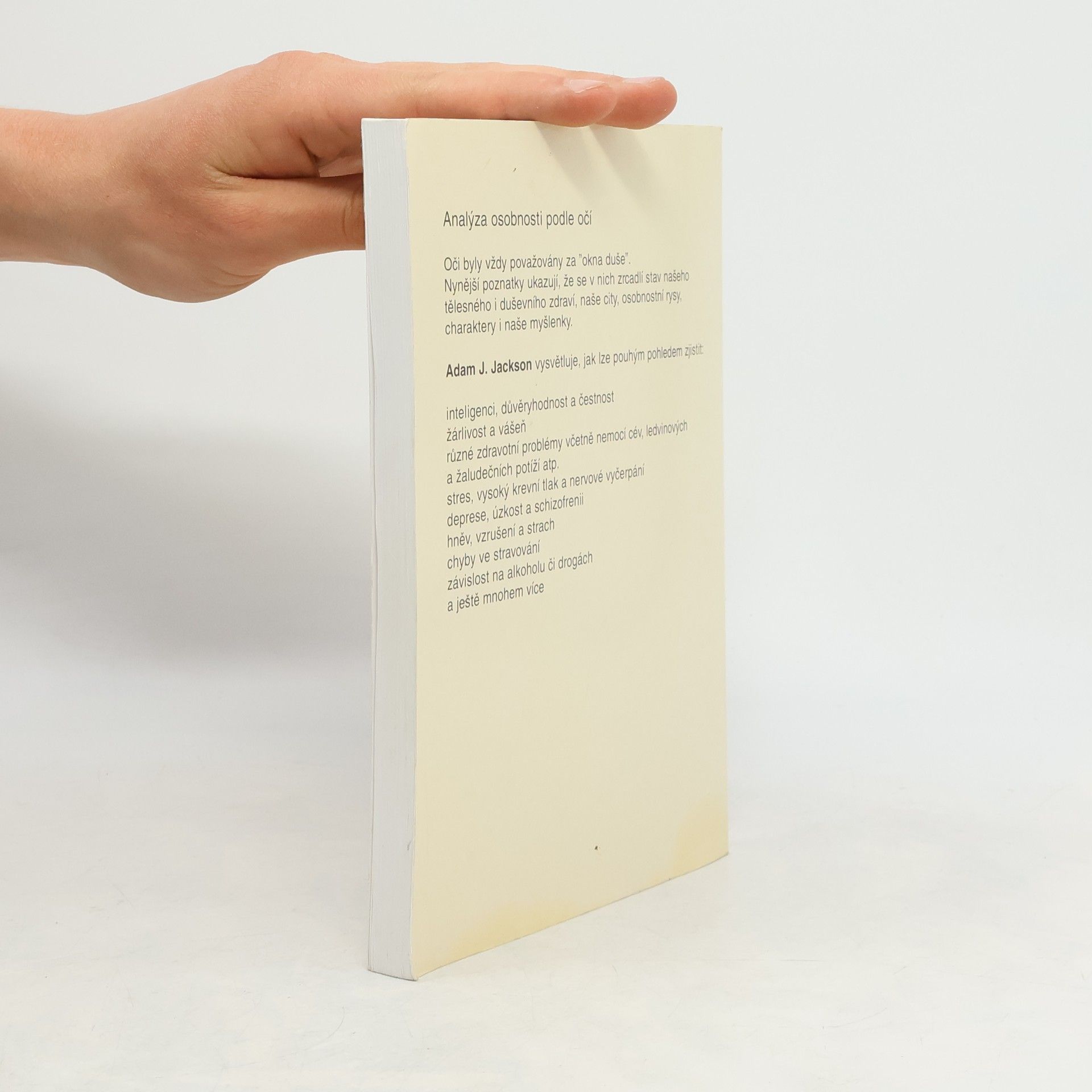 Anotace Kniha je úplným průvodcem k rozboru osobnosti (zdraví, emoce, charakter, citový a milostný život) prostřednictvím očí a shrnuje nejnovější vědecké poznatky potvrzující starobylý názor "oči - okna do duše"