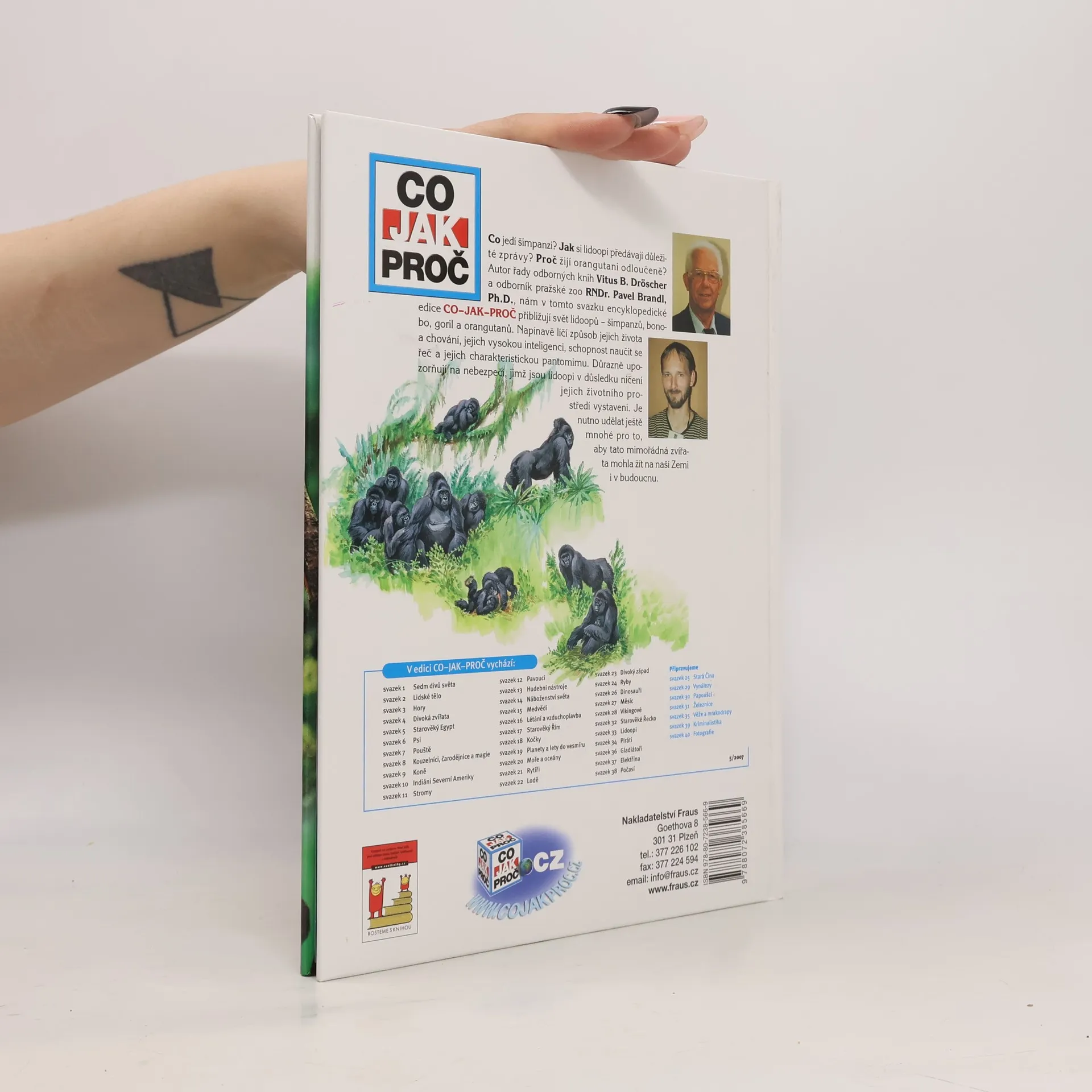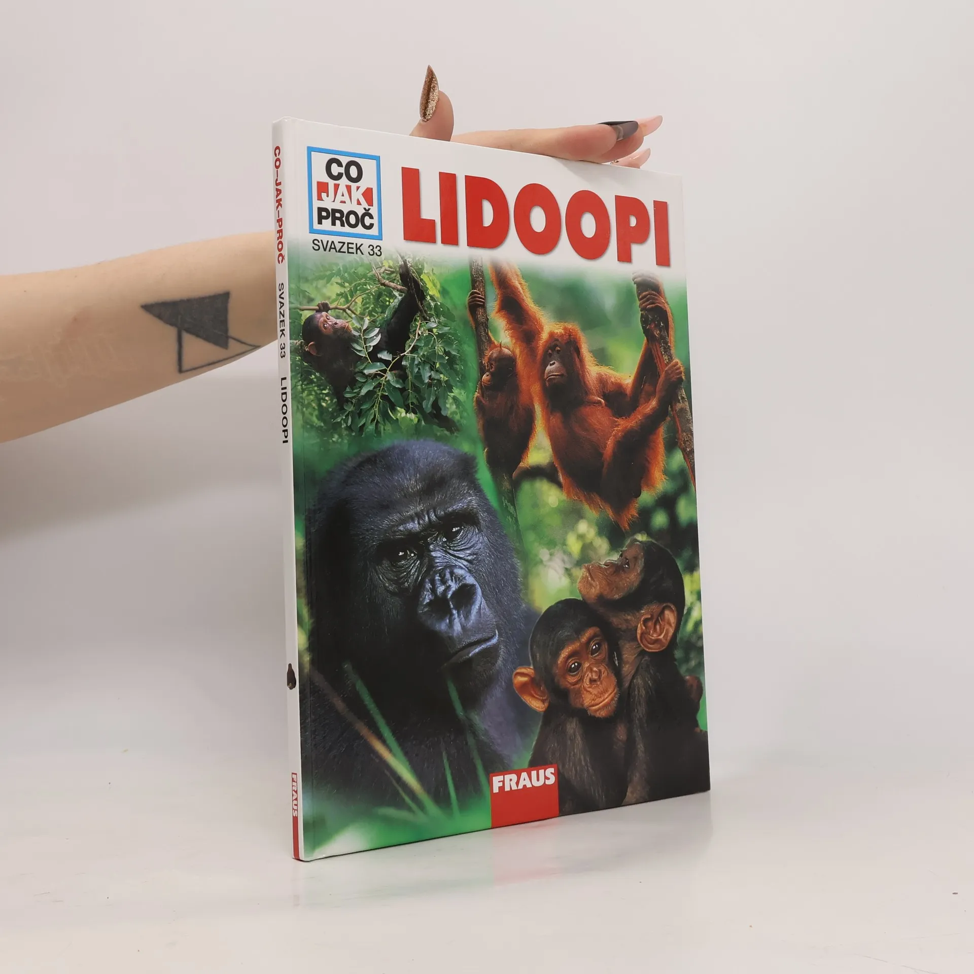 Co jedí šimpanzi? Jak si lidoopi předávají důležité zprávy? Proč žijí orangutani odloučeně? Známý autor odborných knih Vitus B. Dröscher a odborník pražské ZOO RNDr. Pavel Brandl, Ph.D. nám v tomto svazku encyklopedické edice CO-JAK-PROČ přibližují fascinující svět lidoopů – šimpanzů, bonobo, goril a orangutanů. Napínavě líčí způsob jejich života a chování, jejich vysokou inteligenci, schopnost naučit se řeč a jejich charakteristickou pantomimu. Důrazně upozorňují na nebezpečí, jimž jsou lidoopi v důsledku ničení jejich životního prostředí vystaveni. Je nutno udělat ještě mnohé pro to, aby tato mimořádná zvířata mohla žít na naší Zemi i v budoucnu.