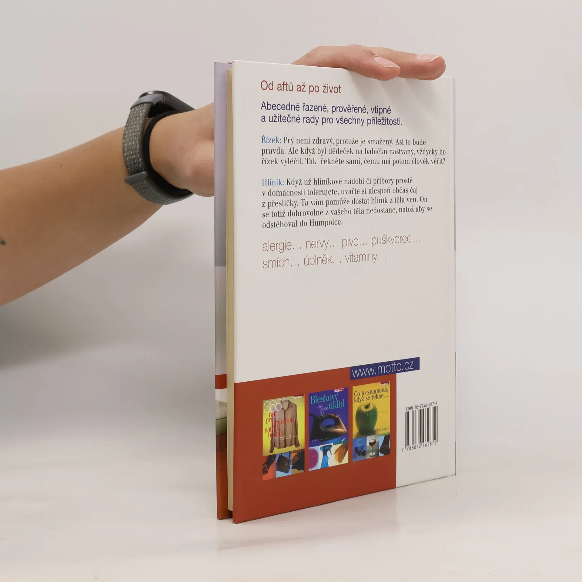 Od aftů až po život Abecedně řazené, prověřené, vtipné a užitečné rady pro všechny příležitosti. Věděli jste třeba, že když už v domácnosti tolerujete hliníkové nádobí či příbory, máte si uvařit alespoň občas čaj z přesličky? Ta vám pomůže dostat hliník z těla ven. On se totiž dobrovolně z vašeho těla nedostane, natož aby se odstěhoval do Humpolce.. Dále se dozvíte, co pomáhá při alergii, „nervech", něco o pivu, puškvorci, smíchu, úplňku, vitaminech a o spoustě dalších věcí.
