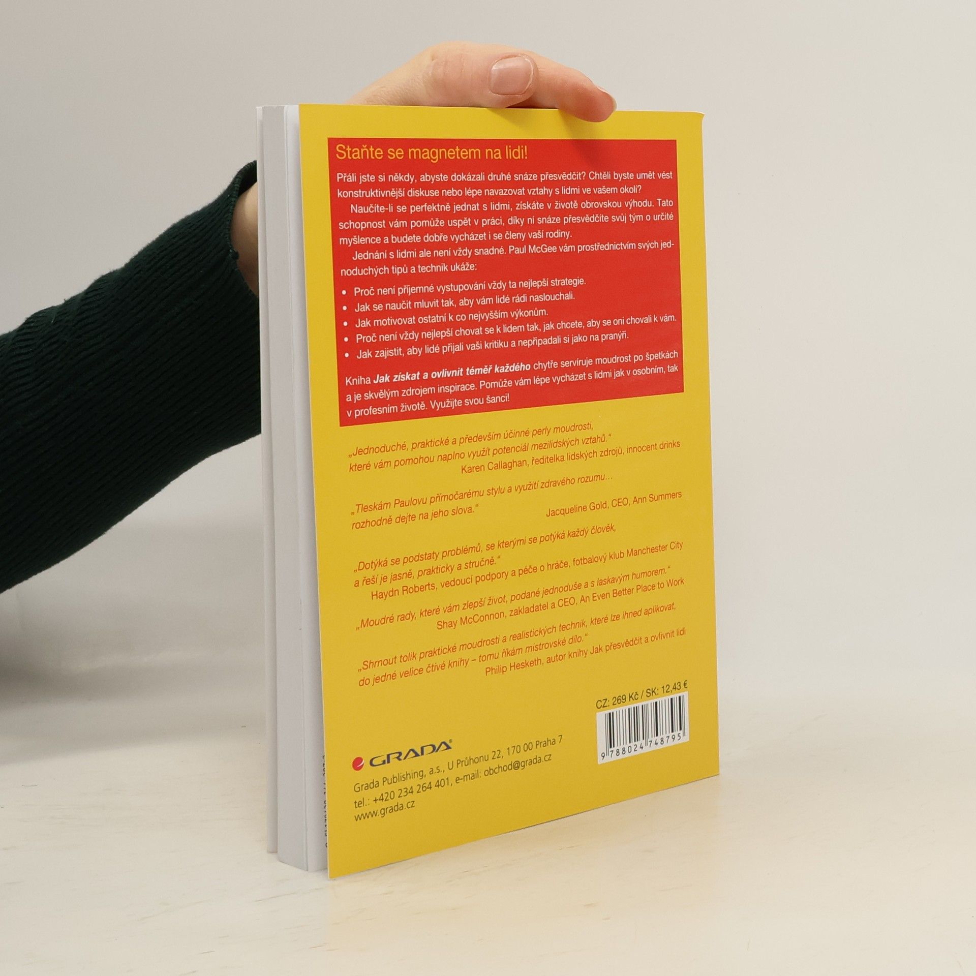 Chtěli byste umět snadněji přesvědčit jiné lidi, získat je na svou stranu a úspěšně s nimi navazovat vztahy? V této čtivé knížce plné rad a tipů se dozvíte, jak na to. Naučíte-li se perfektně jednat s lidmi, získáte v životě obrovskou výhodu. Tato schopnost vám pomůže k postupu v práci, díky ní snáze přesvědčíte druhé o určité myšlence či nápadu a budete dobře vycházet i se členy rodiny. Ale jednání s lidmi není vždy snadné. Paul McGee vám prostřednictvím svých jednoduchých tipů a technik ukáže, proč není příjemné vystupování vždy ta nejlepší strategie, jak se naučit mluvit tak, aby vám lidé rádi naslouchali, jak motivovat ostatní k co nejlepším výkonům, proč není vždy nejlepší chovat se k lidem tak, jak chcete, aby se oni chovali k vám, či jak zajistit, aby lidé přijali vaši kritiku a nepřipadali si jako na pranýři. Kniha Jak získat a ovlivnit téměř každého chytře servíruje moudrost po špetkách a je skvělým zdrojem inspirace. Pomůže vám lépe vycházet s lidmi jak v osobním, tak v profesním životě. Využijte svou šanci!