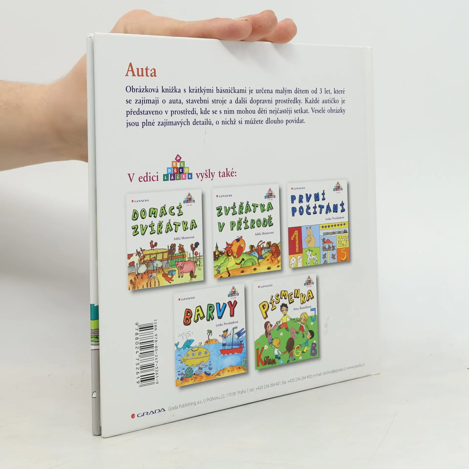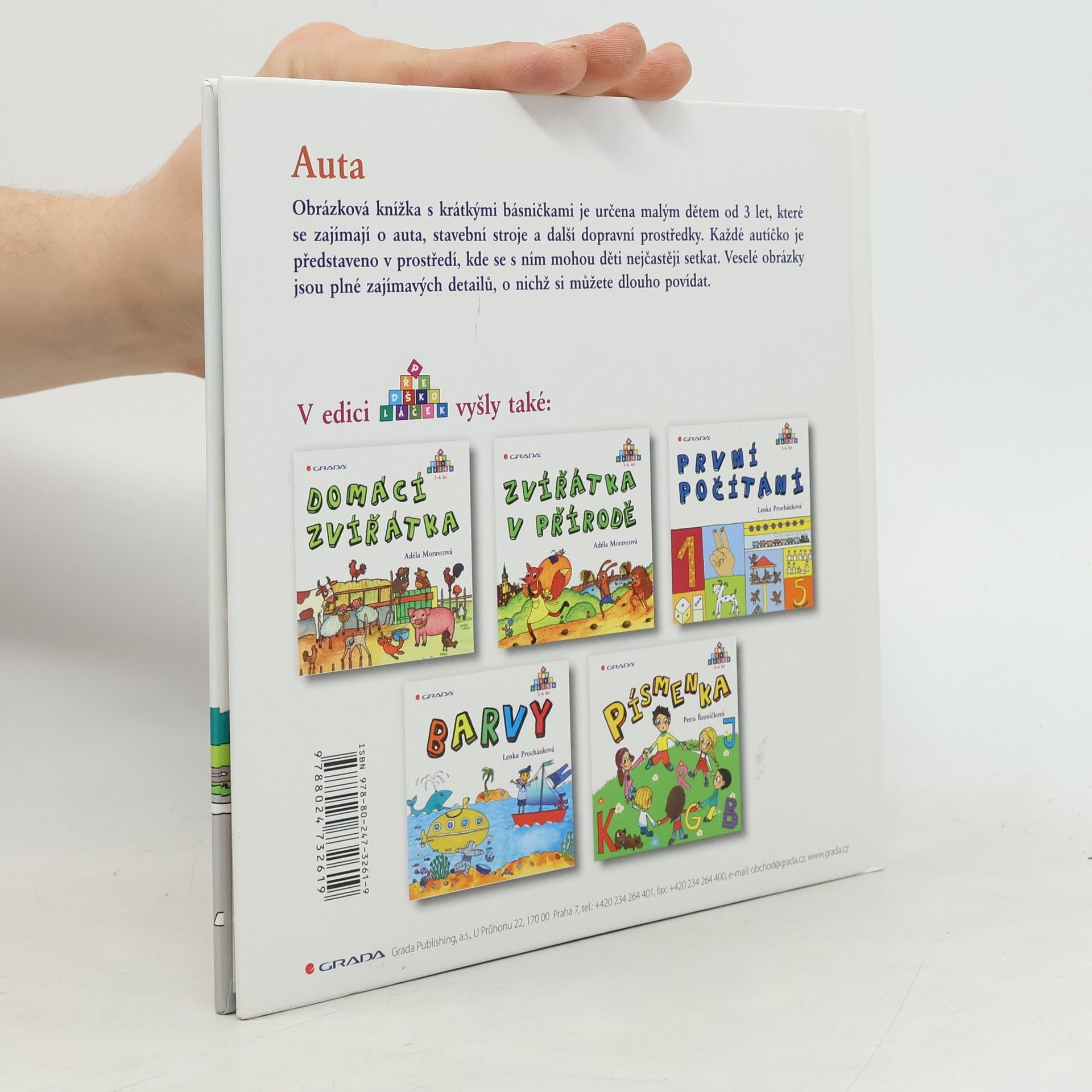 Obrázková knížka s krátkými básničkami je určena malým dětem od 3 let, které se zajímají o auta, stavební stroje a dopravní prostředky. Každé autíčko je nakresleno v prostředí, kde se s ním mohou děti nejčastěji setkat. Veselé obrázky jsou plné zajímavých detailů, o nichž si můžete dlouho povídat. Nová ediční řada, určená pro vaše malé předškoláčky, přináší říkanky, básničky, veselá zvířátka, zajímavé úkoly, to vše vycházející z českého prostředí. Tyto barevné knížky s veselými obrázky jsou zdrojem zábavy i poučení, mohou se stát odrazovým můstkem na cestě vašich dětí do světa literatury a poznání.