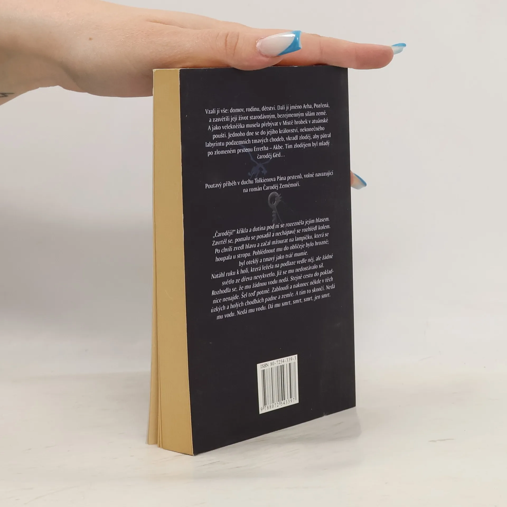 Vzali jí vše: domov, rodinu, dětství... Dali jí jméno Arha, Prozřená, a zasvětili její život starodávným, bezejmenným silám země. A jako velekněžka musela přebývat v Místě hrobek v atuánské poušti. Jednoho dne se do jejího království, nekonečného labyrintu podzemních tmavých chodeb, vkradl zloděj, který pátral po zlomeném prstenu Erretha - Akbe. Tím zlodějem byl mladý čaroděj Ged... Fantasy román volně navazující na předešlý příběh ze Zeměmoří - "Čaroděj Zeměmoří" .