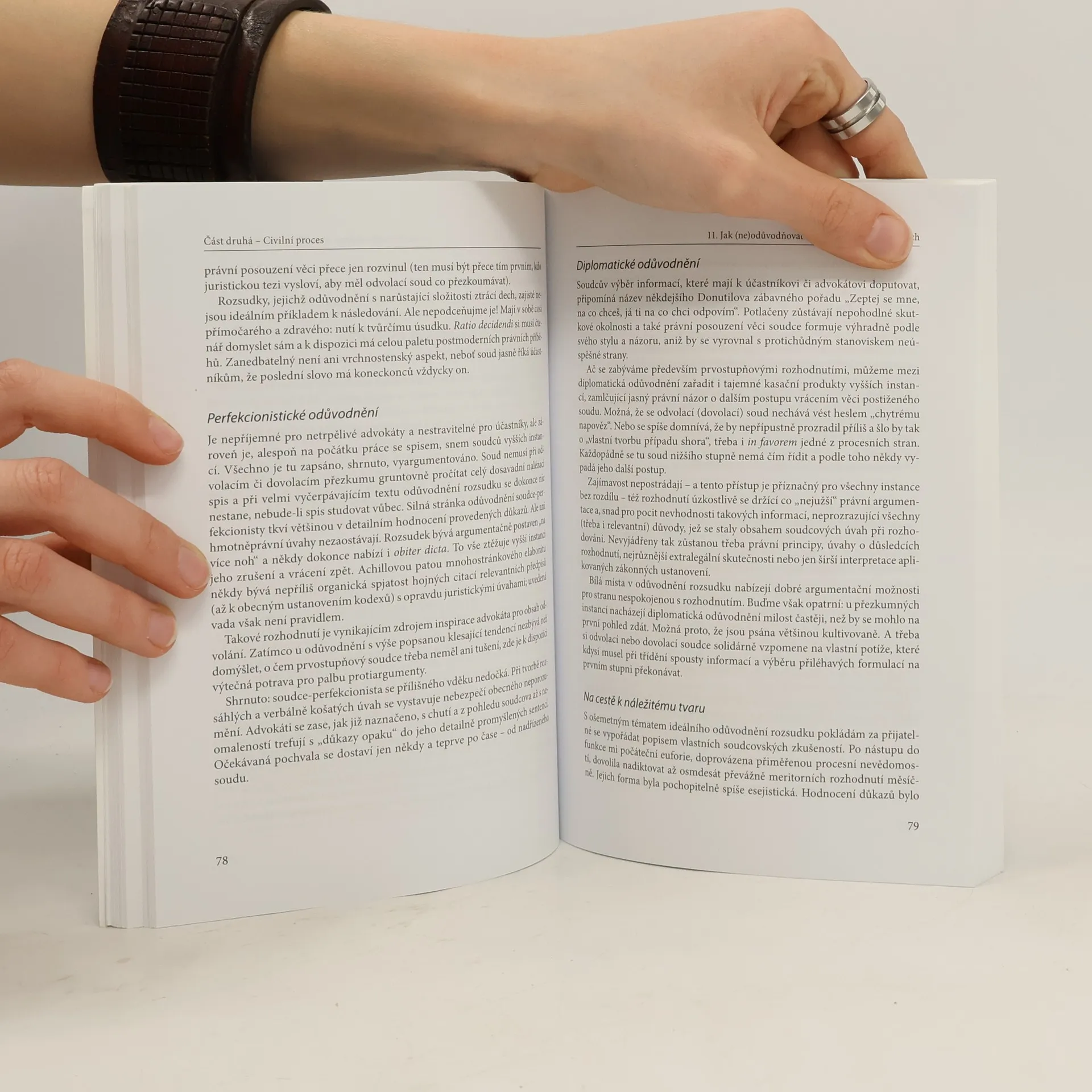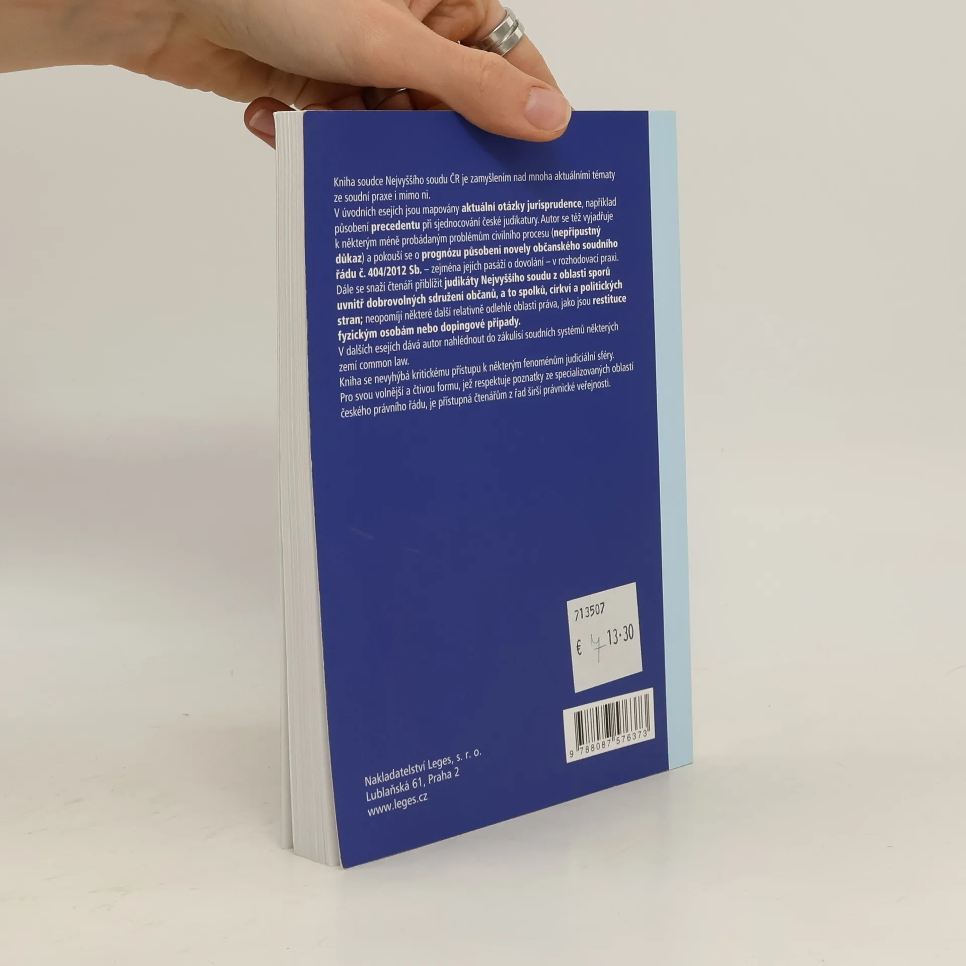 Kniha dlouholetého soudce Nejvyššího soudu ČR je zamyšlením nad mnoha aktuálními tématy ze soudní praxe i mimo ni. V úvodních esejích jsou mapovány aktuální otázky jurisprudence, například působení precedentu při sjednocování české judikatury. Autor se též vyjadřuje k některým méně probádaným problémům civilního procesu (nepřípustný důkaz) a pokouší se o prognózu působení novely občanského soudního řádu č. 404/2012 Sb. - zejména jejích pasáží o dovolání - v rozhodovací praxi. Dále se snaží čtenáři přiblížit judikáty Nejvyššího soudu z oblasti sporů uvnitř dobrovolných sdružení občanů, a to spolků, církví a politických stran; neopomíjí některé další relativně odlehlé oblasti práva, jako jsou restituce fyzickým osobám nebo dopingové případy. V dalších esejích dává autor nahlédnout do zákulisí soudních systémů některých zemí common law. Kniha se nevyhýbá kritickému přístupu k některým fenoménům judiciální sféry. Pro svou volnější a čtivou formu, jež respektuje poznatky ze specializovaných oblastí českého právního řádu, je přístupná čtenářům z řad širší právnické veřejnosti.