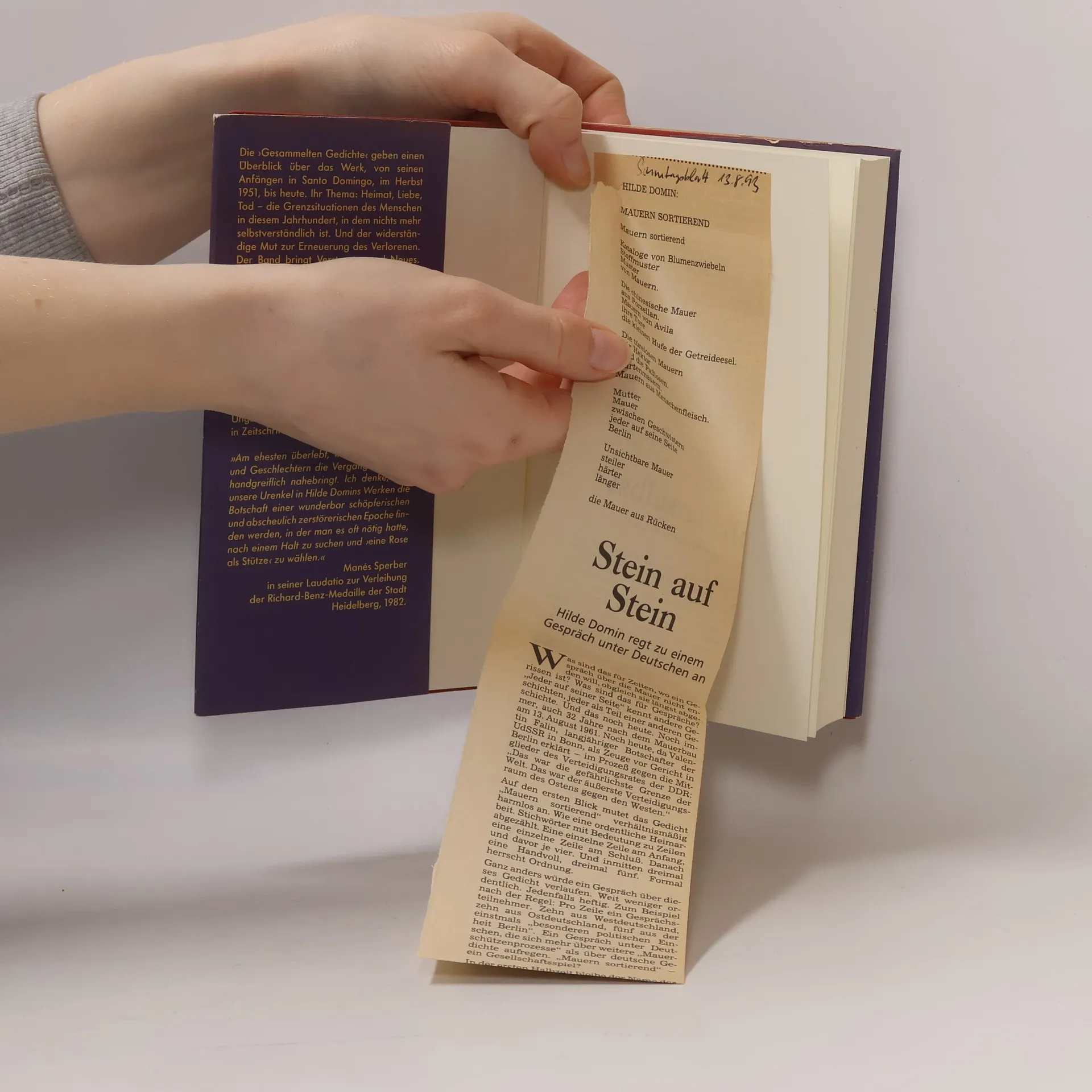 Die ›Gesammelten Gedichte‹ geben einen Überblick über das Werk, von seinen Anfängen in Santo Domingo, im Herbst 1951, bis 1985. Ihr Thema: Heimat, Liebe, Tod – die Grenzsituationen des Menschen im 20. Jahrhundert, in dem nichts mehr selbstverständlich ist. Und der widerständige Mut zur Erneuerung des Verlorenen. Der Band bringt Verstreutes und Neues. Und, ganz substantiell, eine Auswahl der frühen Gedichte, von denen nur wenige in ›Nur eine Rose als Stütze‹ (1959) aufgenommen waren. Im ganzen werden etwa 100 bisher unveröffentlichte oder schwer zugängliche Texte vorgelegt und nach Entstehungszeit und innerem Zusammenhang lose in die neugeordneten Sammlungen eingefügt. Dazu kommen Übertragungen aus dem Englischen, Französischen, Spanischen und Italienischen, das meiste (wie Ungarettis ›Tagebuch des alten Mannes‹) in Zeitschriften abgedruckt. »Am ehesten überlebt, was Nachkommen und Geschlechtern die Vergangenheit fast handgreiflich nahebringt. Ich denke, daß unsere Urenkel in Hilde Domins Werken die Botschaft einer wunderbar schöpferischen und abscheulich zerstörerischen Epoche finden werden, in der man es oft nötig hatte, nach einem Halt zu suchen und ›eine Rose als Stütze‹ zu wählen.« Manès Sperber in seiner Laudatio zur Verleihung der Richard-Benz-Medaille der Stadt Heidelberg, 1982.