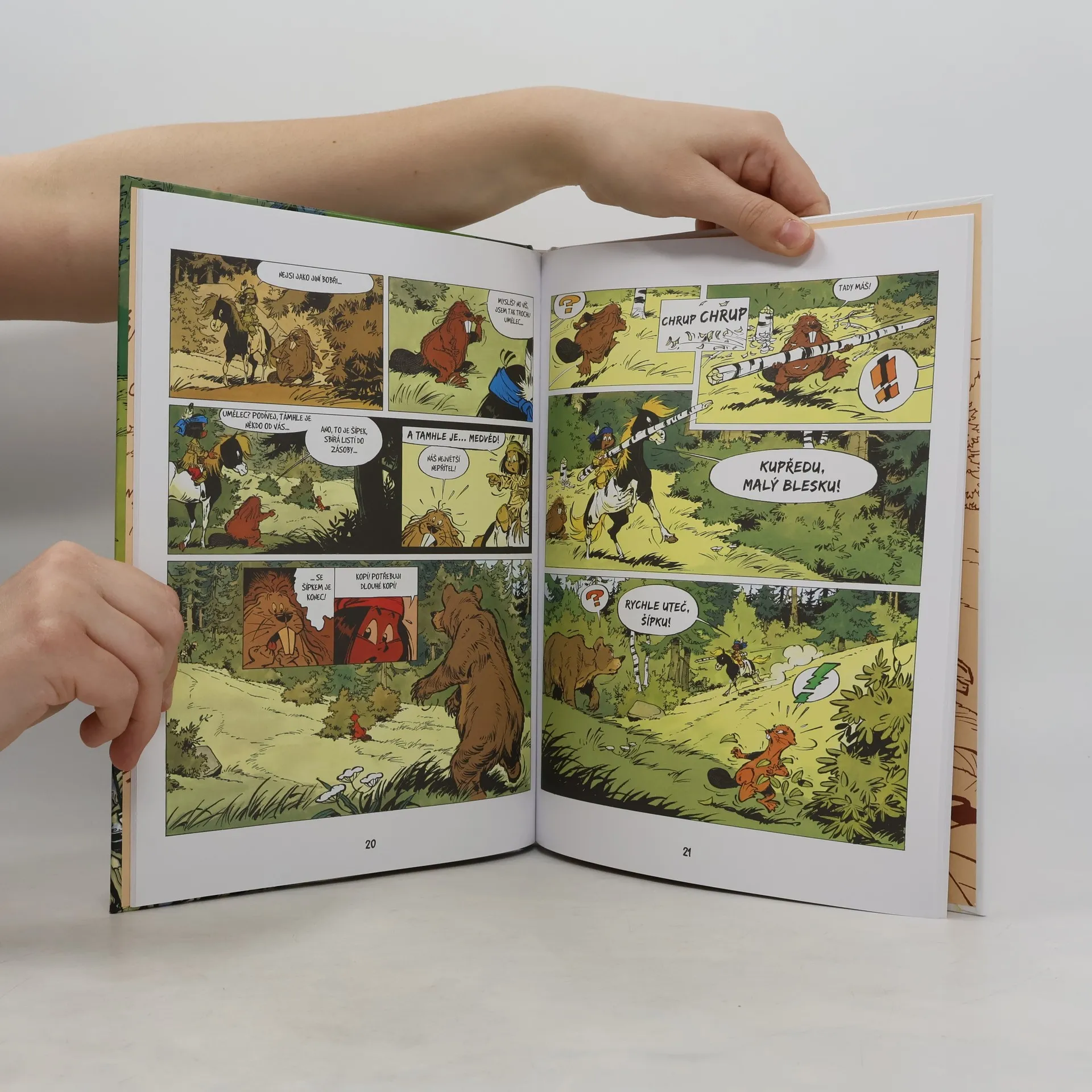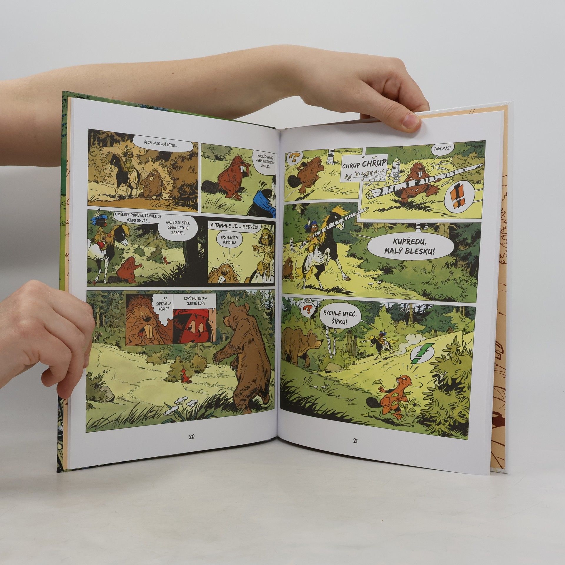 Yakari souhlasí se svým mustangem Malým bleskem, že na honění se po prérii je trochu moc horko, a jdou se místo toho vykoupat k řece. Při té příležitosti objeví prapodivnou konstrukci postavenou napříč korytem, která zadržuje značnou část vody. Znenadání se na ně oboří podivný chlupatý tvor s placatým ocasem, který jim vyčiní, že ničí jejich dílo. Tak se Yakari a Malý blesk seznamují se skupinkou bobrů, kteří nedávno přicestovali, aby si zde vybudovali nový domov. Po jejich boku pak oba zvědavci prožijí nejedno dobrodružství.