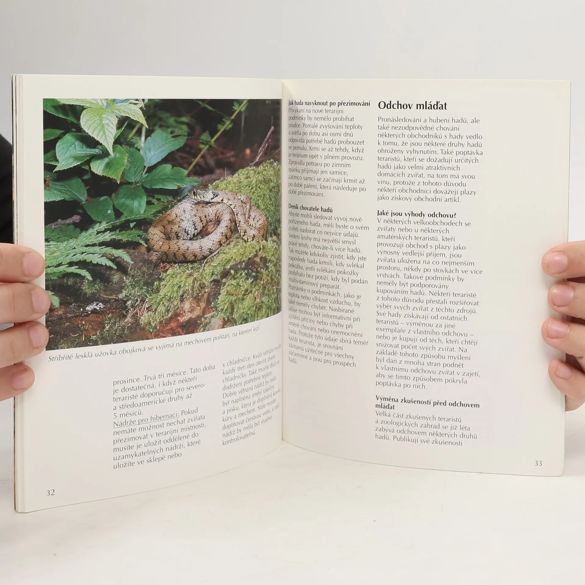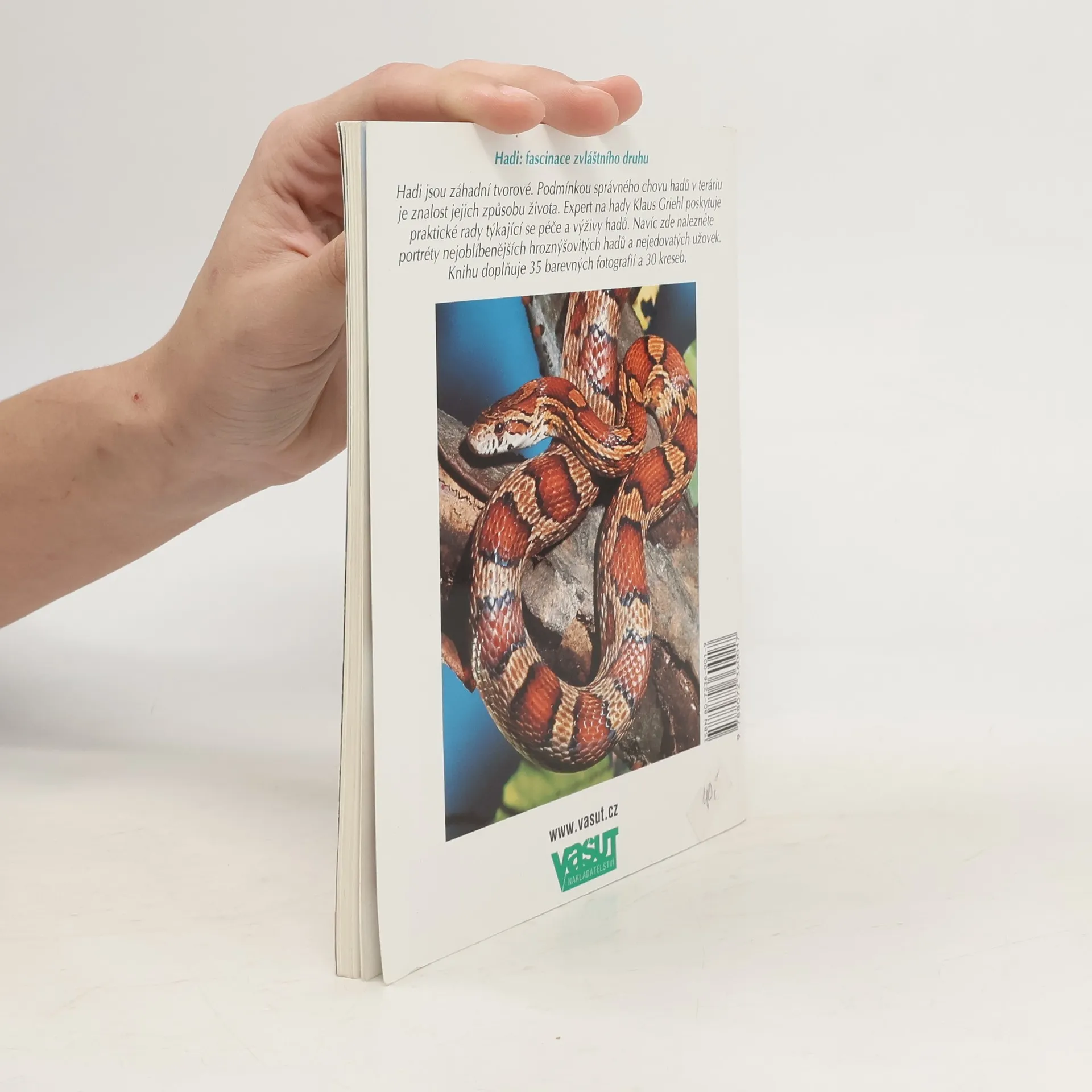 Příručka pro začínající chovatele nejedovatých hadů. Úvodní část příručky pro začínající teraristy seznamuje s biologií hadů a s jejich životem ve volné přírodě.V dalších kapitolách jsou praktické rady jak zařídit terárium,jak se správně o hady starat,čím je krmit a za jakých okolností je možný odchov mláďat.V knize jsou i informace o právní regulaci chovu a nákupu hadů a o zákonu o ochraně druhů.V druhé části knihy jsou popsáni nejdůležitější nejedo- vatí hadi a menší druhy hroznýšovitých hadů,spolu s tipy na jejich výběr a péči o ně.